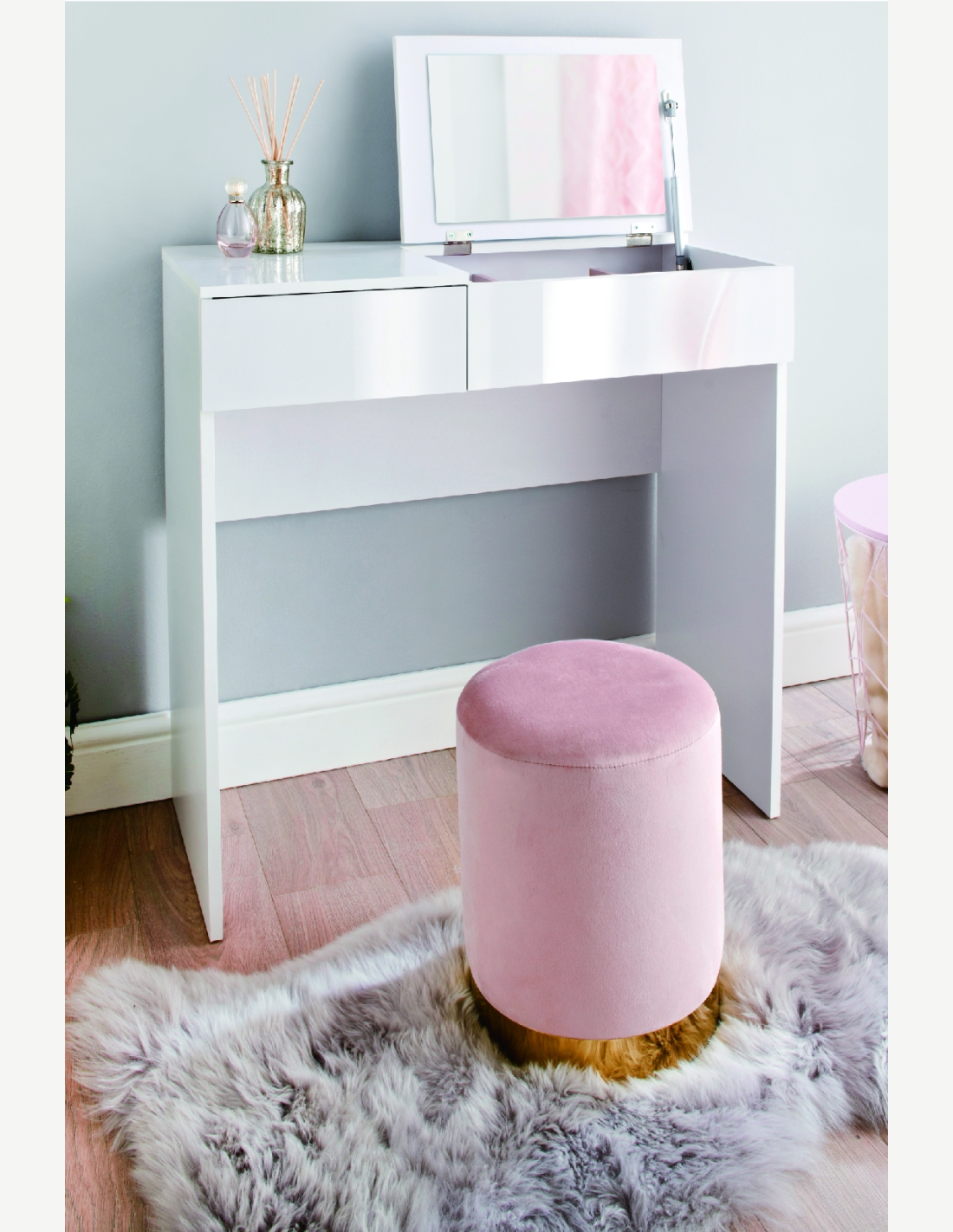 Dieser Schminktisch präsentiert sich in einem schlichten weiß und wirkt sehr geradlinig und modern. Es setzt sich ausgezeichnet in den gewünschten Wohnraum ein. Der Schminktisch selbst besitzt eine Schublade und eine Klappe mit integriertem Spiegel. Darin erhalten Sie ausreichend Stauraum, um deine Utensilien, Kosmetika und Accessoires ordentlich und sortiert aufzubewahren. Nie war es einfacher, den Schminkplatz aufgeräumt zu hinterlassen.