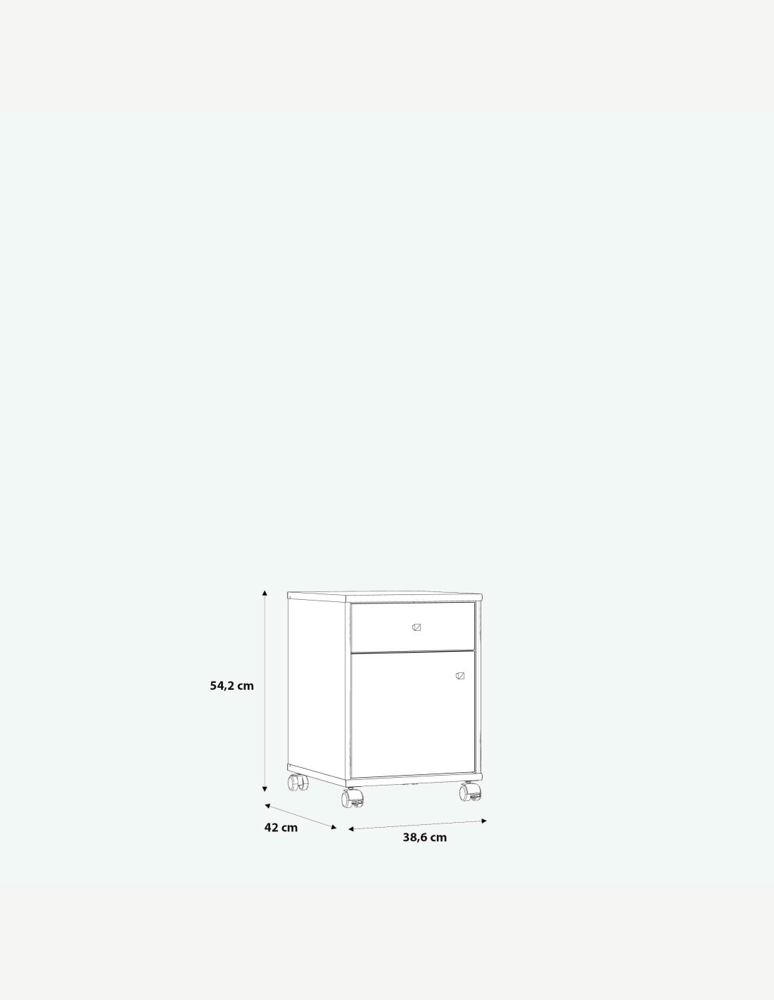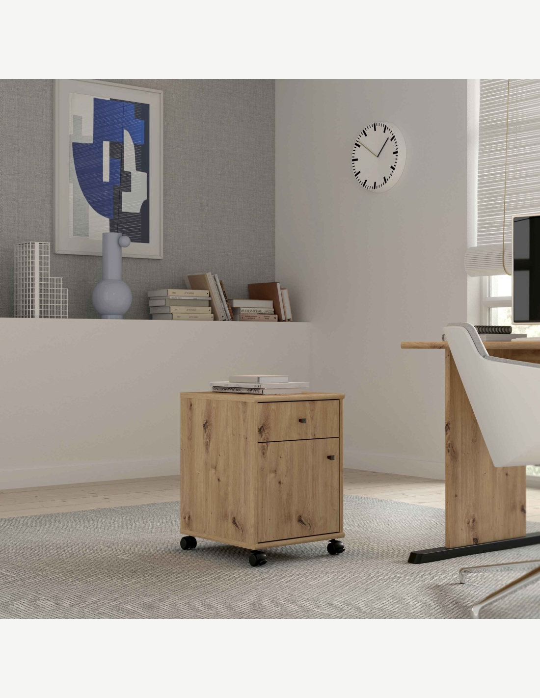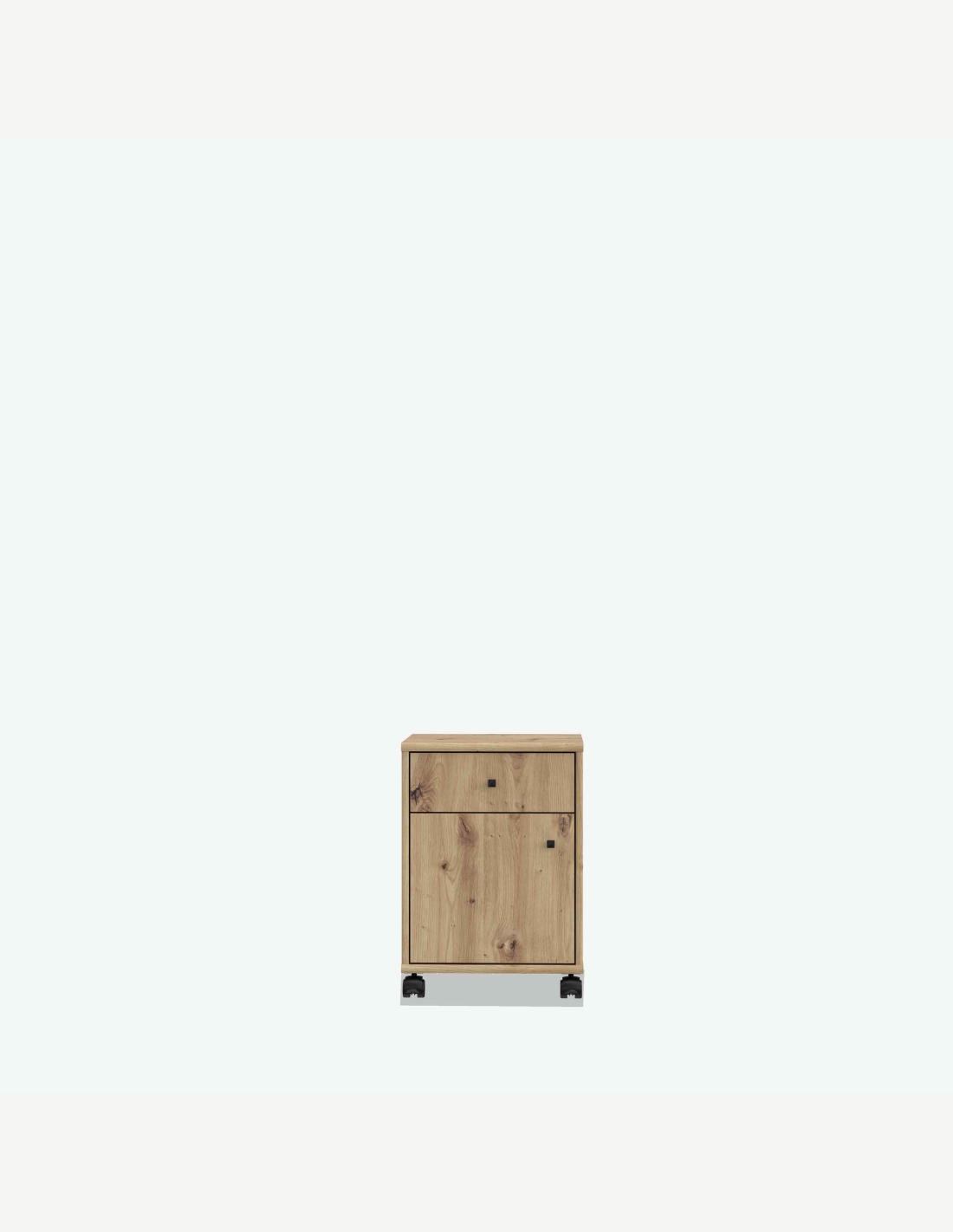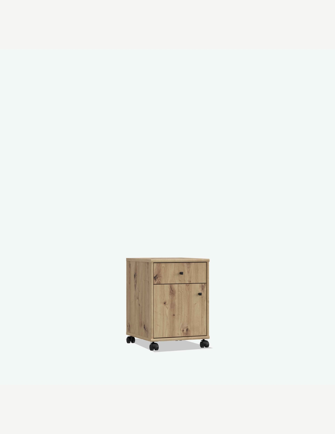 Rollcontainer aus Holzdekor in der Farbe Weiß oder Artisan Oak mit 1 Schubkasten und 1 Tür . Maße: BHT 38,6x54,1x42cm