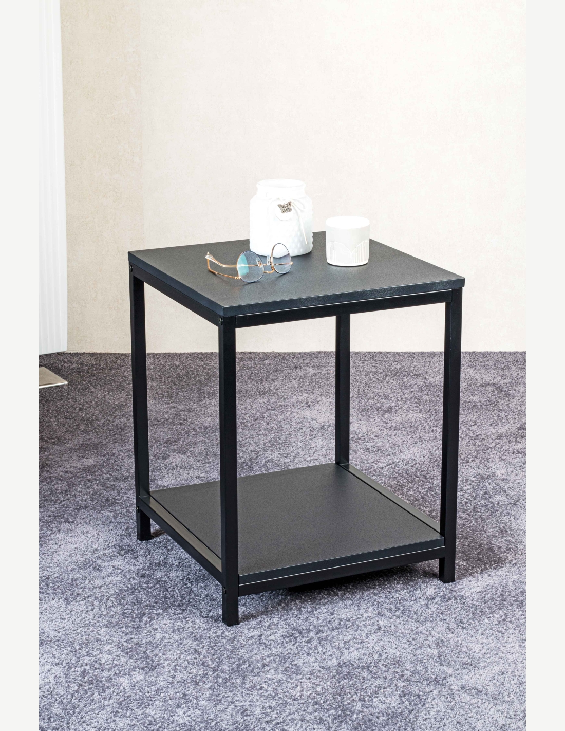 Moderner Beistelltisch, erhältlich in 2 verschiedenen Farben, mit schwarzem Stahlrohrgestell. Maße BHT ca. 40x50x40cm