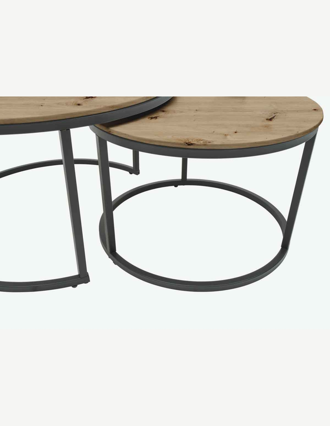 2er Set runder Couchtische aus Metall und Holzdekor mit PVC-Holzoptik beschichtet. Sehr modern im Industrial Stil. Maße kleiner Tisch DH 60x40 cm und großer Tisch DH 80x45 cm.