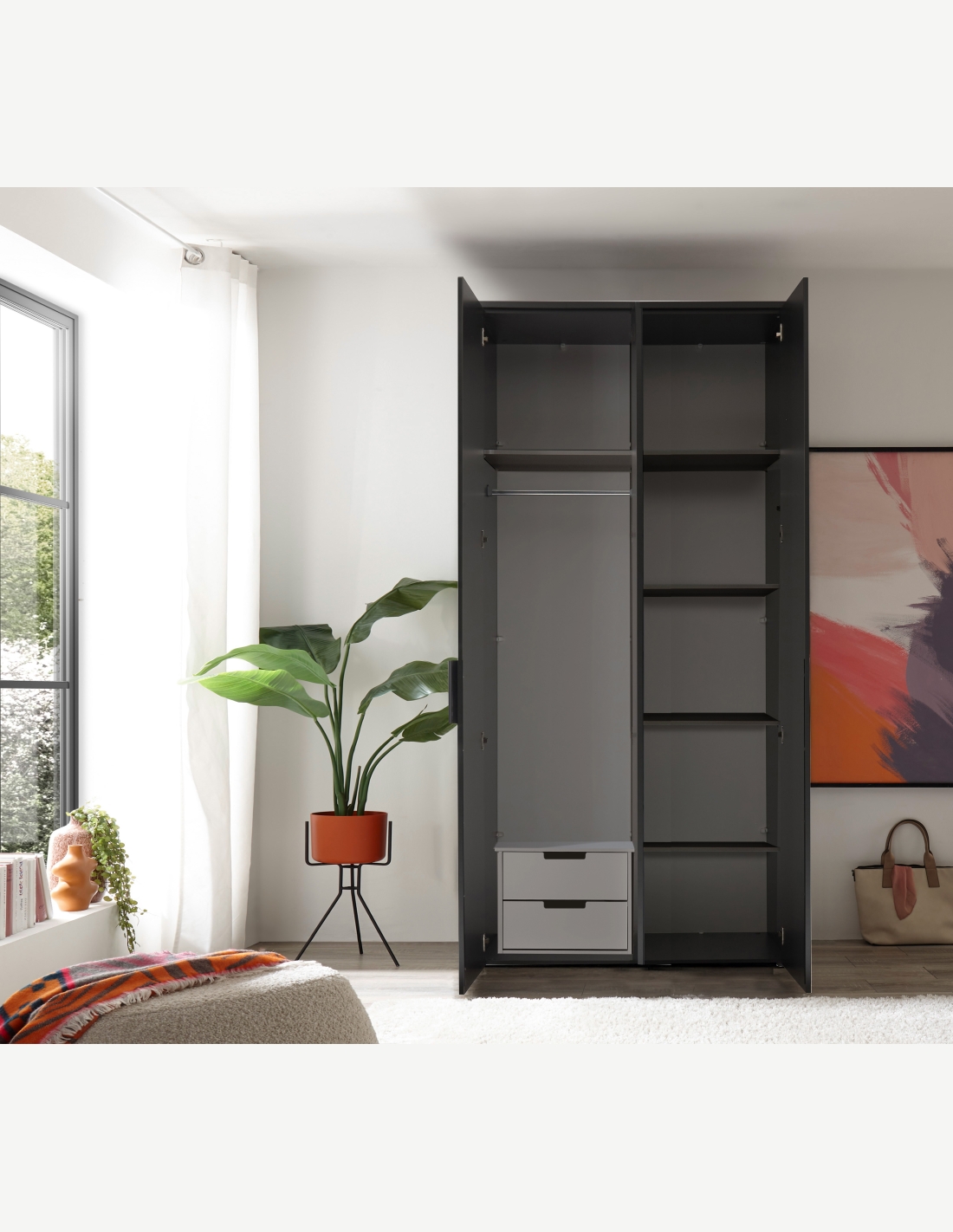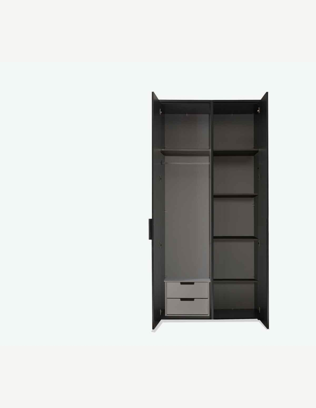 Dieser Kleiderschrank mit 2/3 Drehtüren bietet dir ausreichend Stauraum für deine Kleidung und sorgt für Ordnung im Schlafzimmer. Einfach, aber trotzdem sehr modern und elegant. Teli ist eine schöne und geräumige Aufbewahrungslösung in jedem Raum und besteht aus 5 Regalen einer Kleiderstange und einer kleinen Kommode im Innenbereich . Mit seinem klassischen Design fügt er sich harmonisch und leicht in jeden Raum ein. Es kann auch problemlos mit anderen, bereits im Haus vorhandenen Möbeln kombiniert werden. Dieser Schrank kann als Kleiderschrank verwendet werden, aber nicht nur.