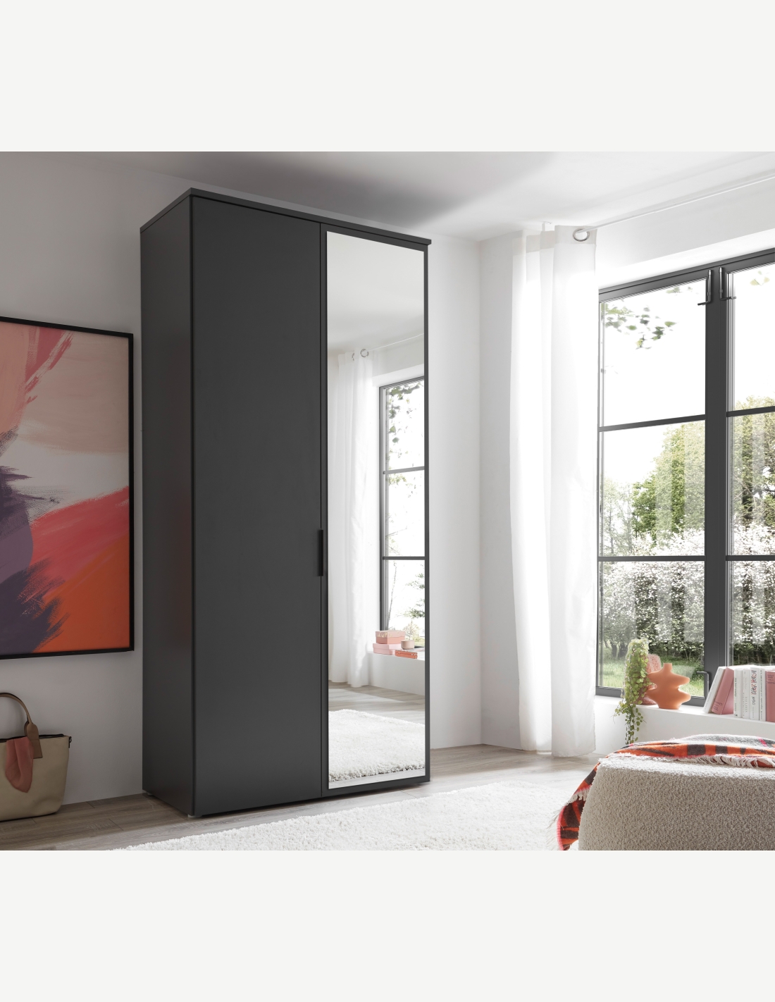 Kleiderschrank mit 2 oder 3 Drehtüren, davon 1 mit Spiegel, 5 Einlegeböden eine Kleiderstange und eine kleine Kommode im Innenraum , verfügbar in Graphit . Maße: BHT 101,7x225x52cm ( 2 Drehtüren ) BHT 151,7x225x52cm ( 3 Drehtüren )