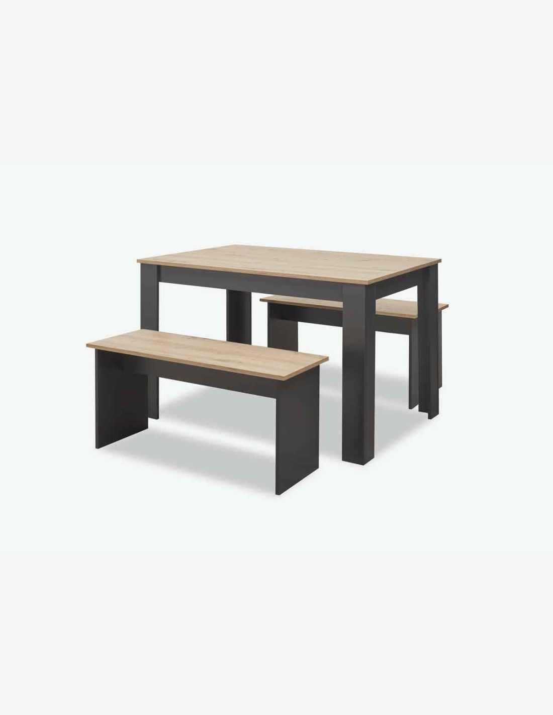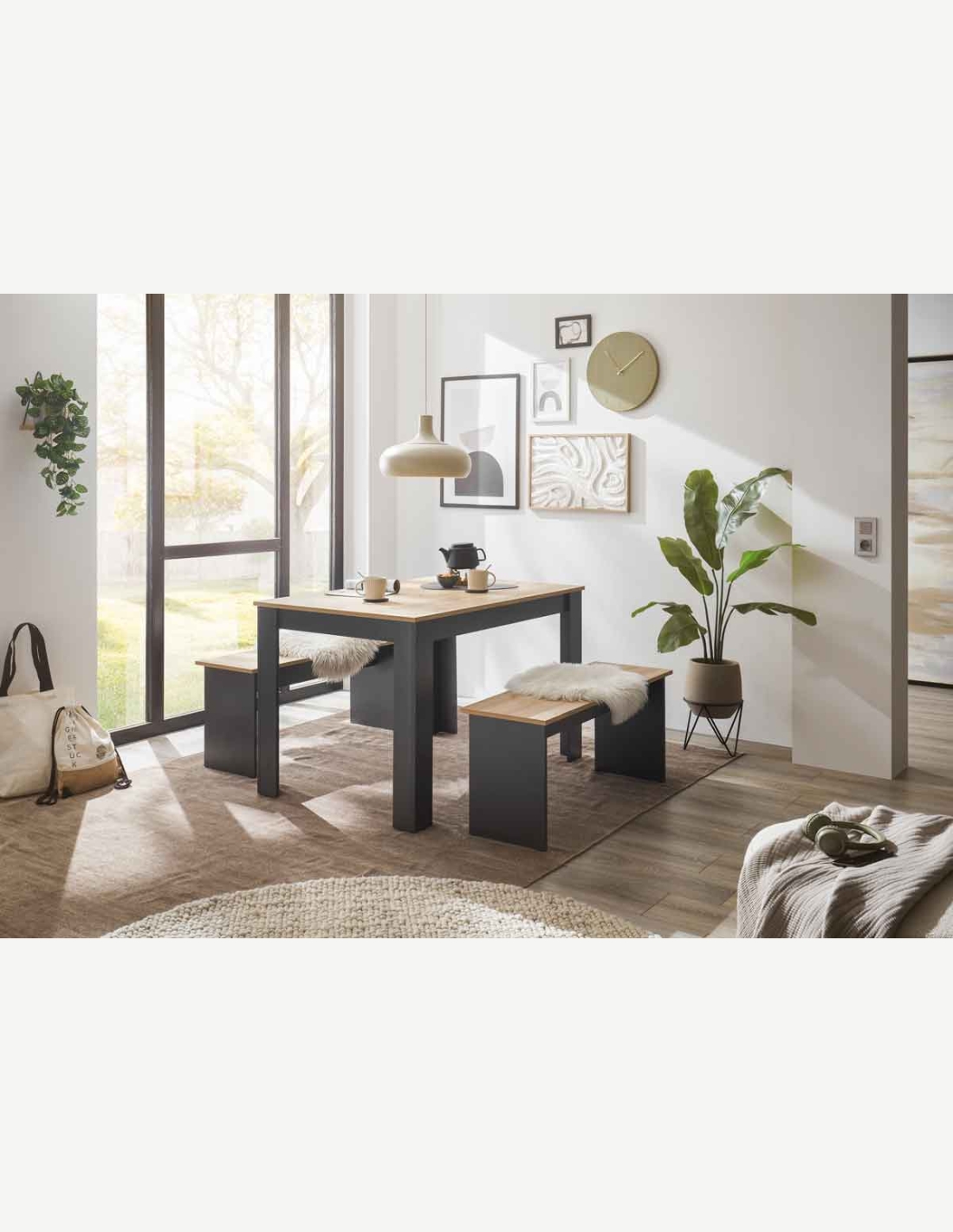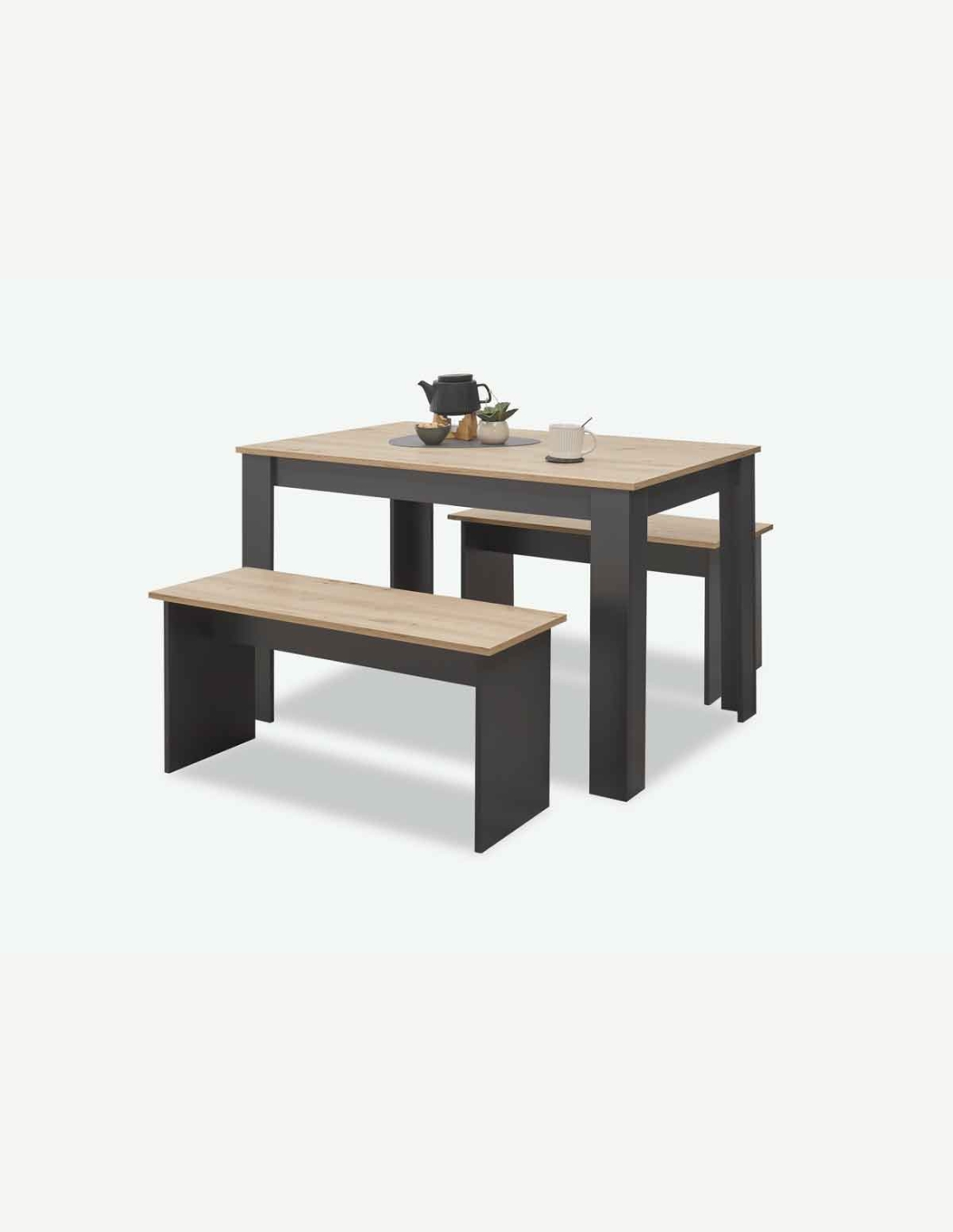 Elegantes Set, bestehend aus 1 Tisch und 2 Bänken. Ideal für moderne Küchen oder Esszimmer. Einfaches und lineares Design. Die Sitzkissen sind nicht im Preis inbegriffen, aber man kann diese im unseren Onlineshop finden. Der Tisch, wie auch beide Bänke, sind aus stabilem und widerstandsfähigem Holzdekor in der Farbe Artisan Eiche/Anthrazit gefertigt. Die Bänke können unter dem Tisch abgestellt werden, wenn sie nicht mehr benötigt werden. Dieser Set aus Tisch und 2 Bänke ist perfekt für kleine Küchen und Esszimmern.