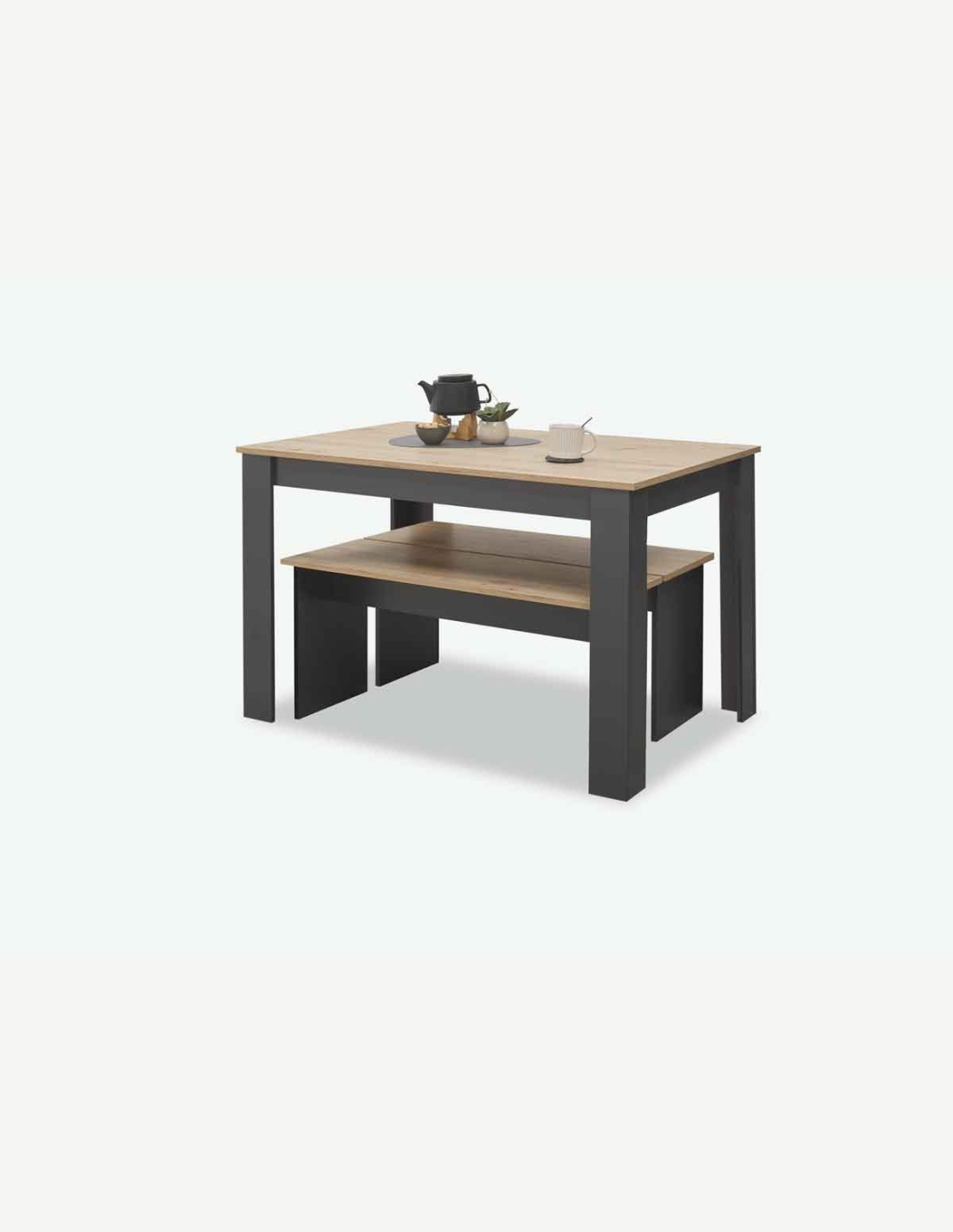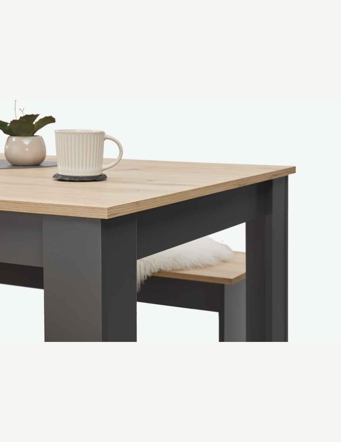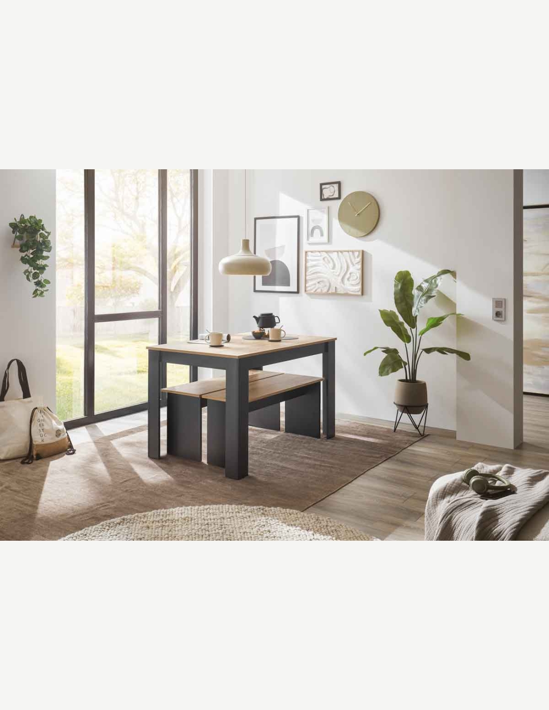 Elegantes Set, bestehend aus 1 Tisch und 2 Bänken. Ideal für moderne Küchen oder Esszimmer. Einfaches und lineares Design. Die Sitzkissen sind nicht im Preis inbegriffen, aber man kann diese im unseren Onlineshop finden. Der Tisch, wie auch beide Bänke, sind aus stabilem und widerstandsfähigem Holzdekor in der Farbe Artisan Eiche/Anthrazit gefertigt. Die Bänke können unter dem Tisch abgestellt werden, wenn sie nicht mehr benötigt werden. Dieser Set aus Tisch und 2 Bänke ist perfekt für kleine Küchen und Esszimmern.
