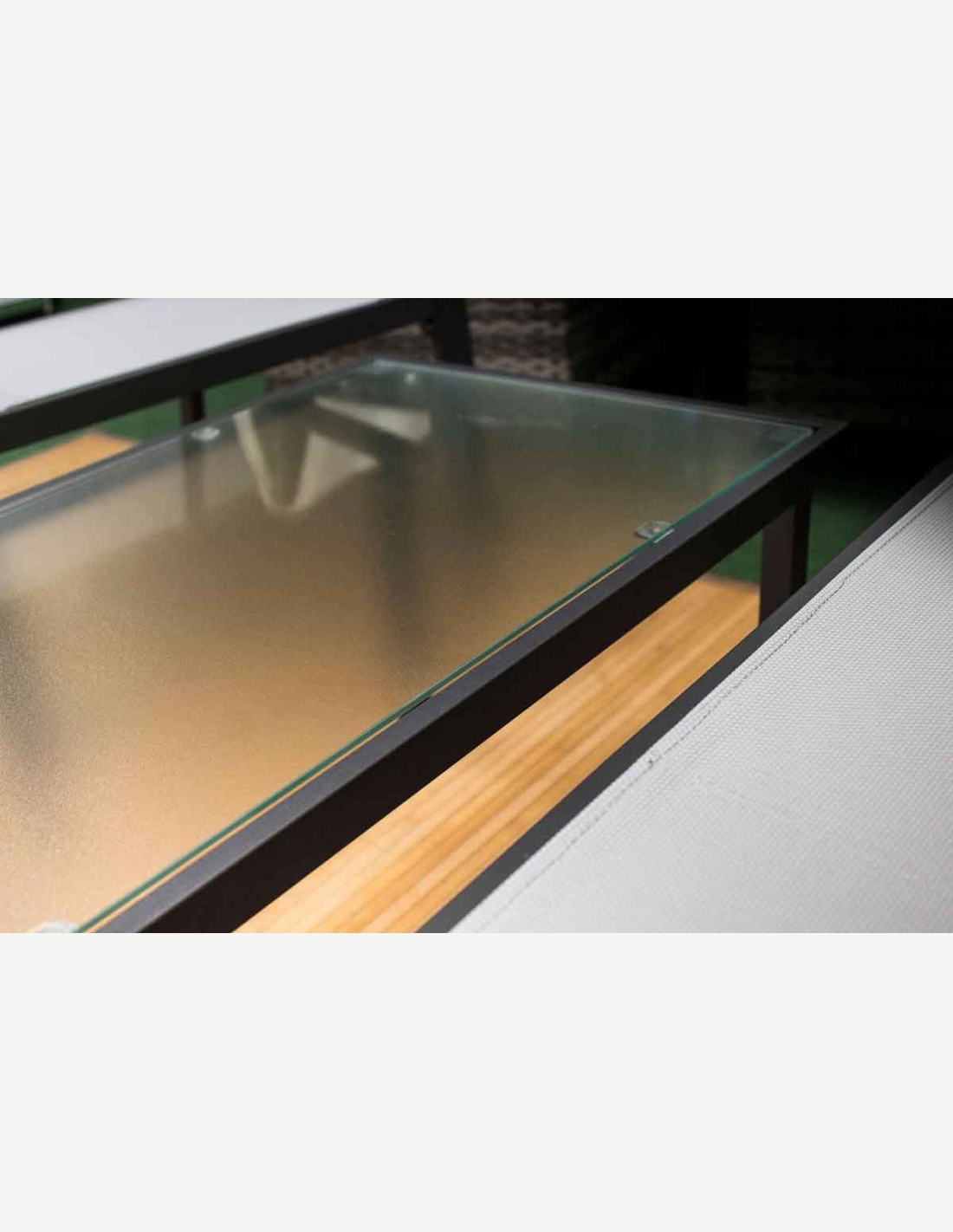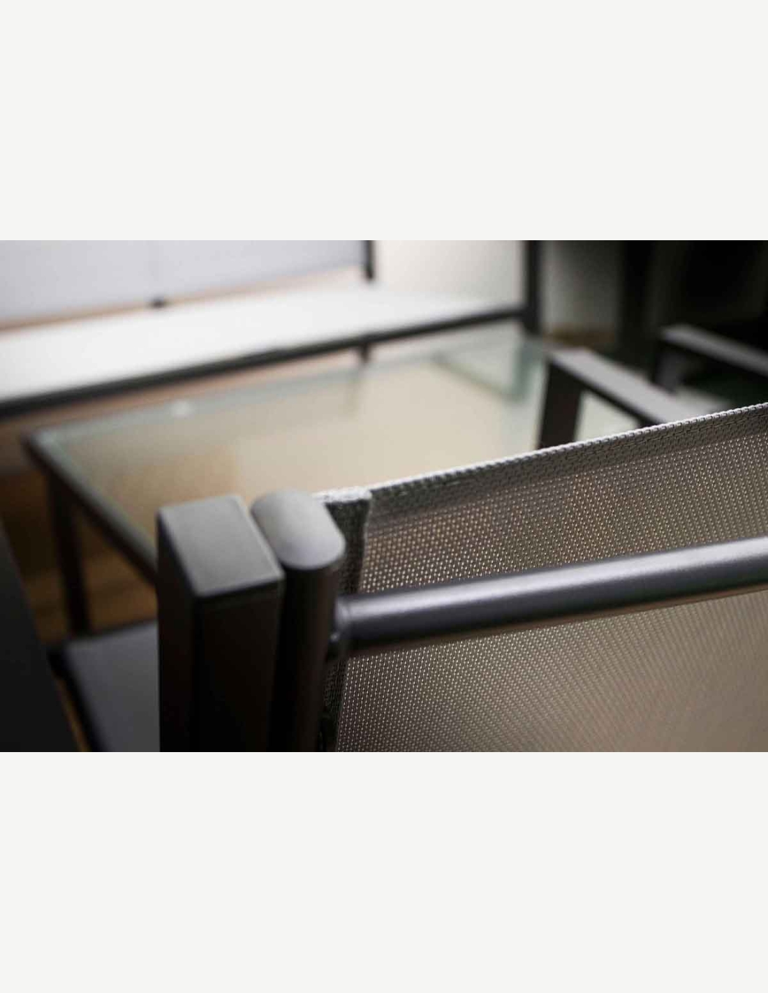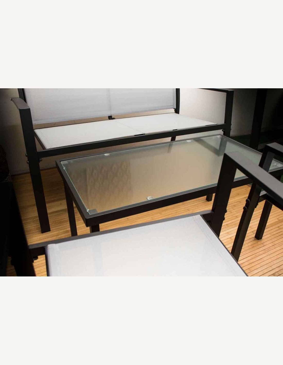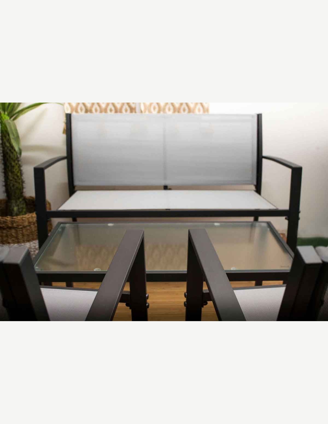 Gartenset aus Metall und grauem Glas bestehend aus Tisch...