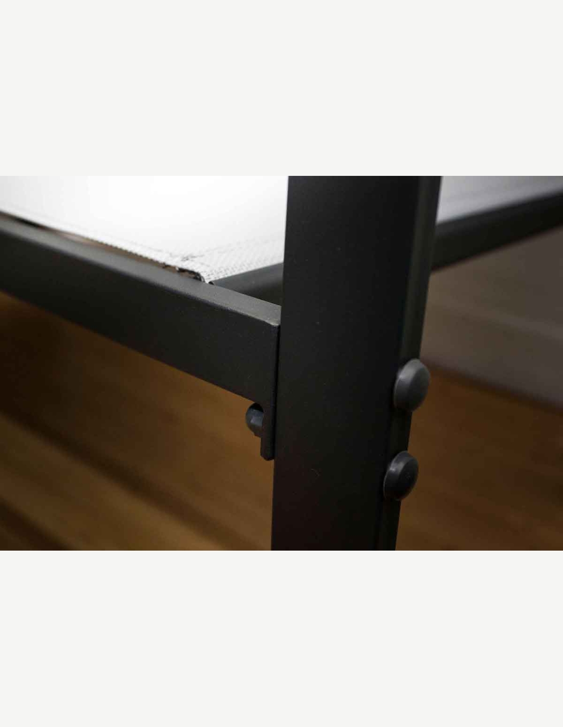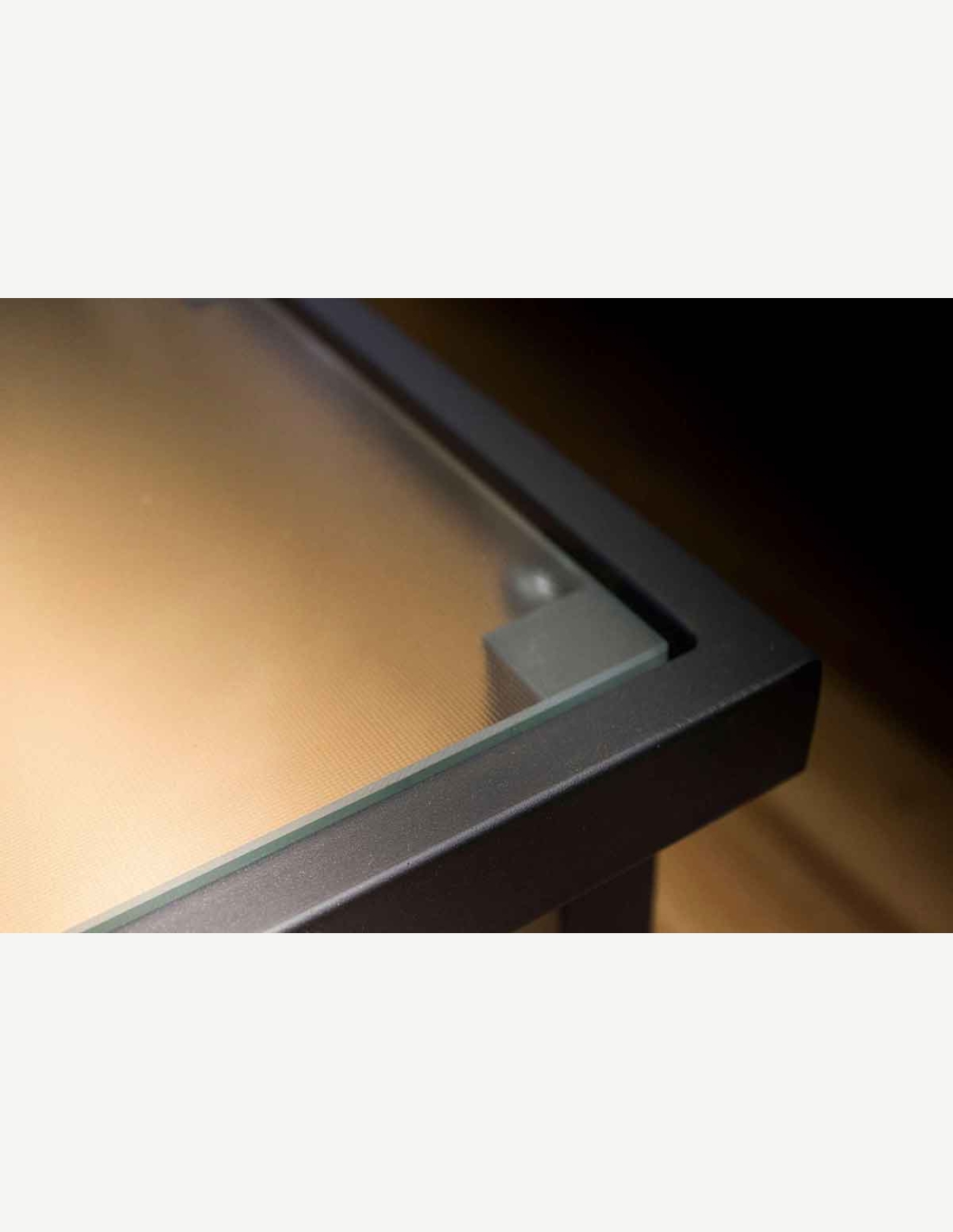 Material: Metall und Tischplatte aus Glas; Stoff in silbergrau