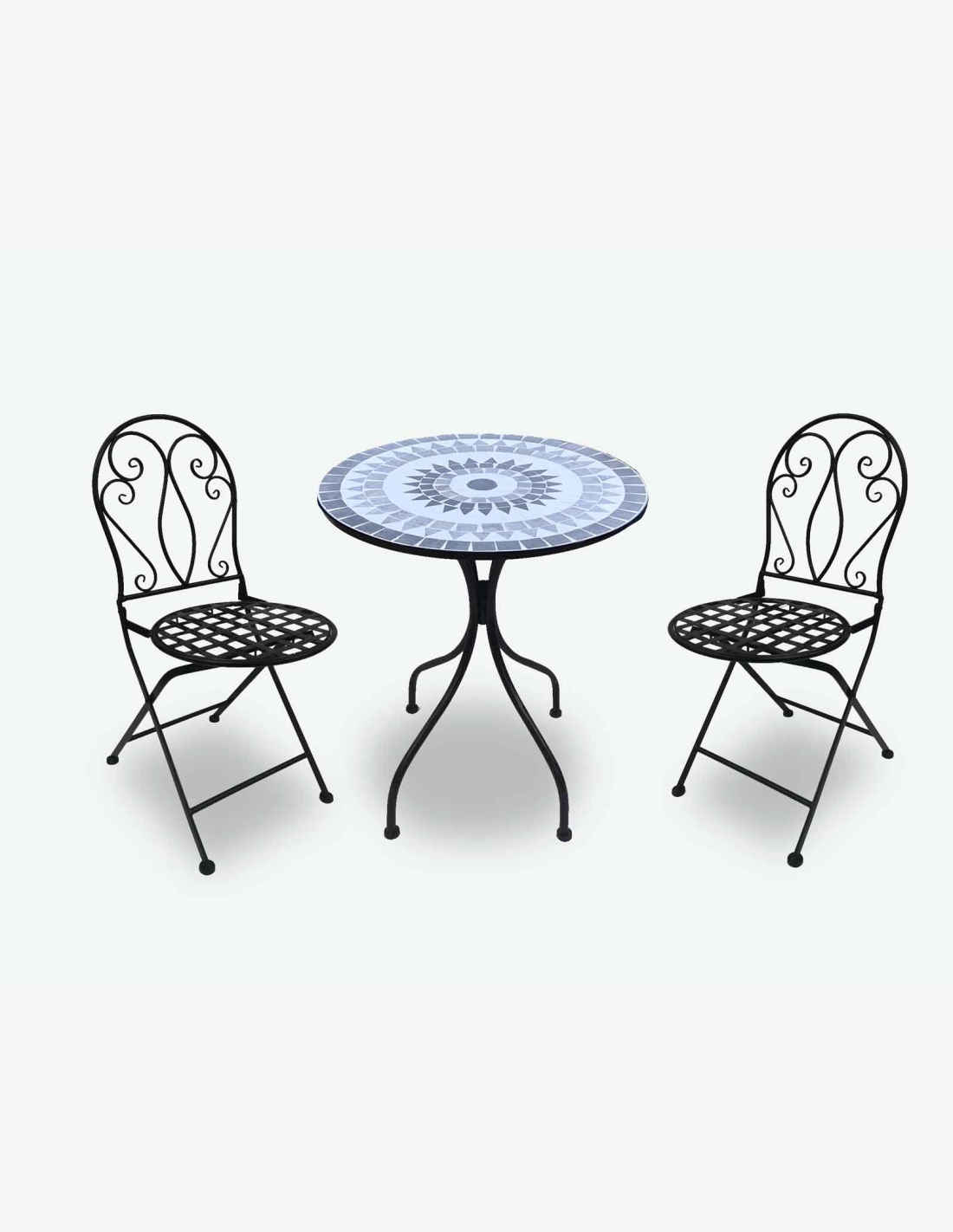 Balkonset aus Metall , bestehend aus 2 Klappstühlen und 1 Klapptisch, Tisch mit Mosaik und Zementfüllung .