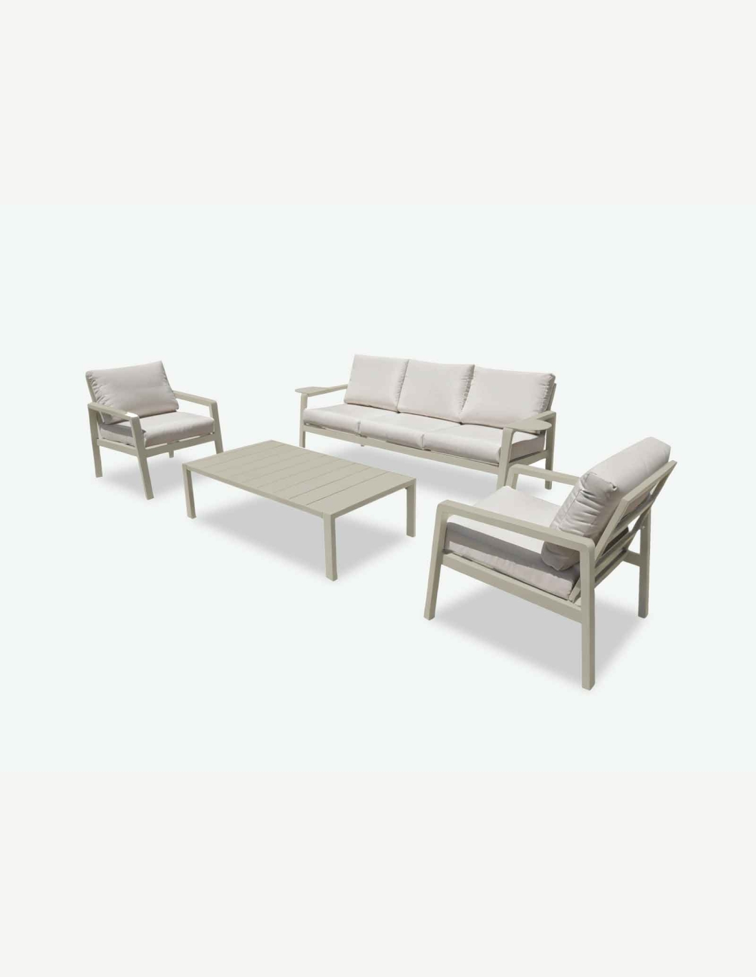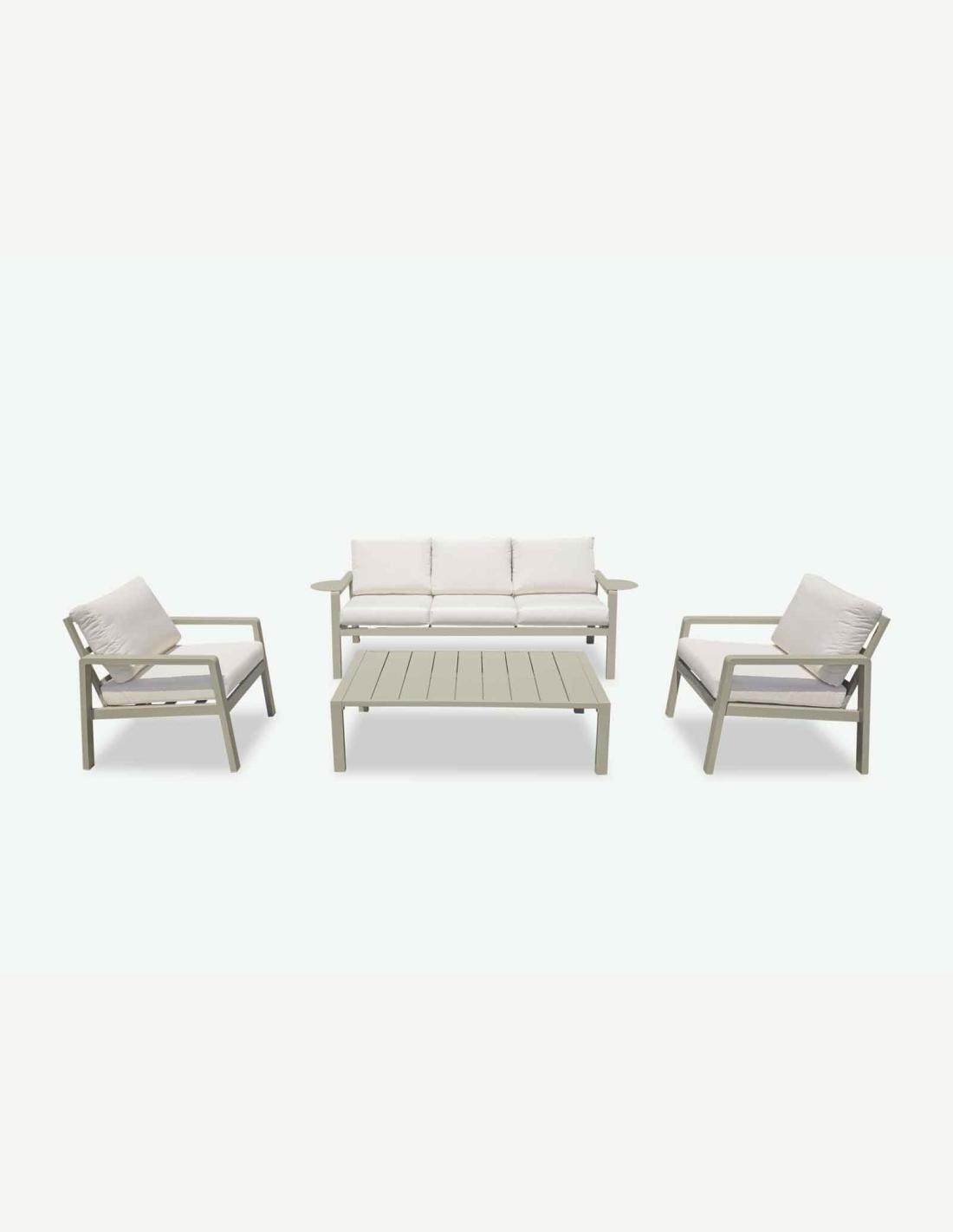 Gartenmöbel-Set aus beigem Metall und beigen Kissen, bestehend aus 1 Tisch, 1 3-er Bank und 2 Sessel.