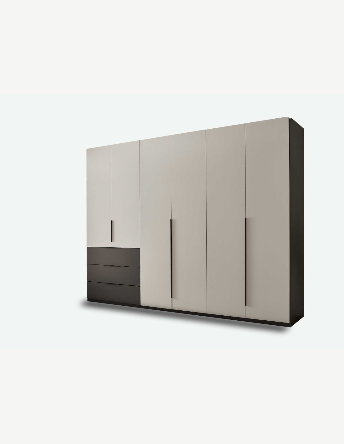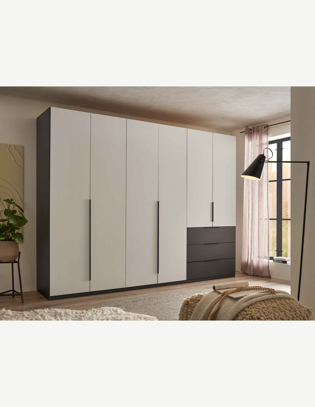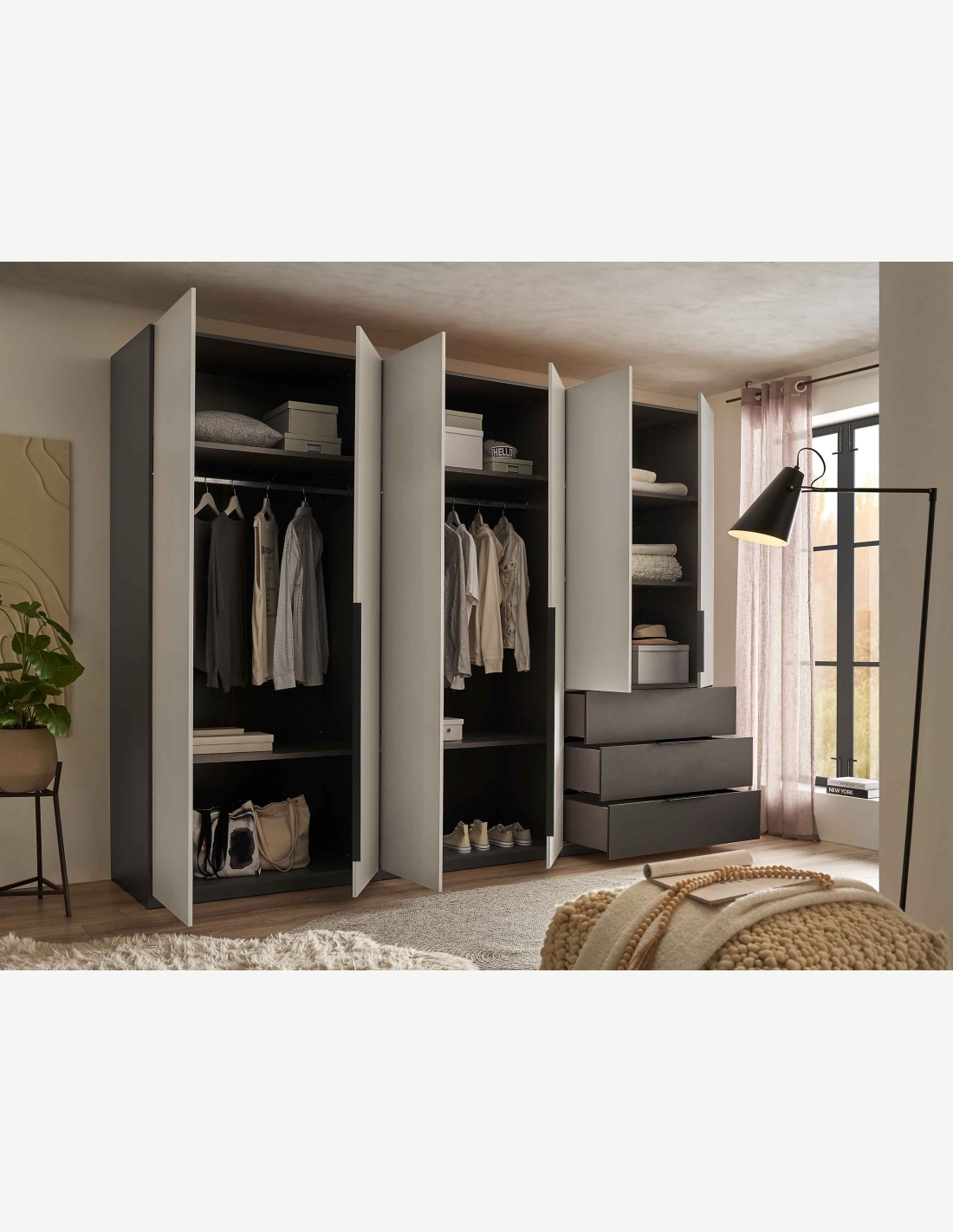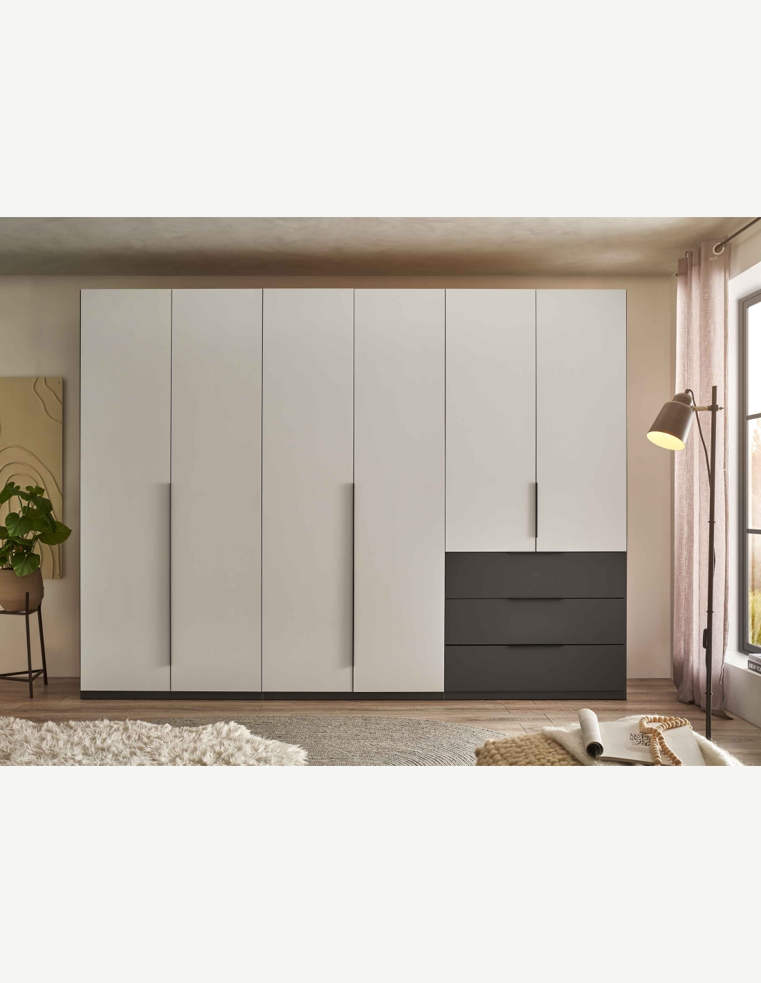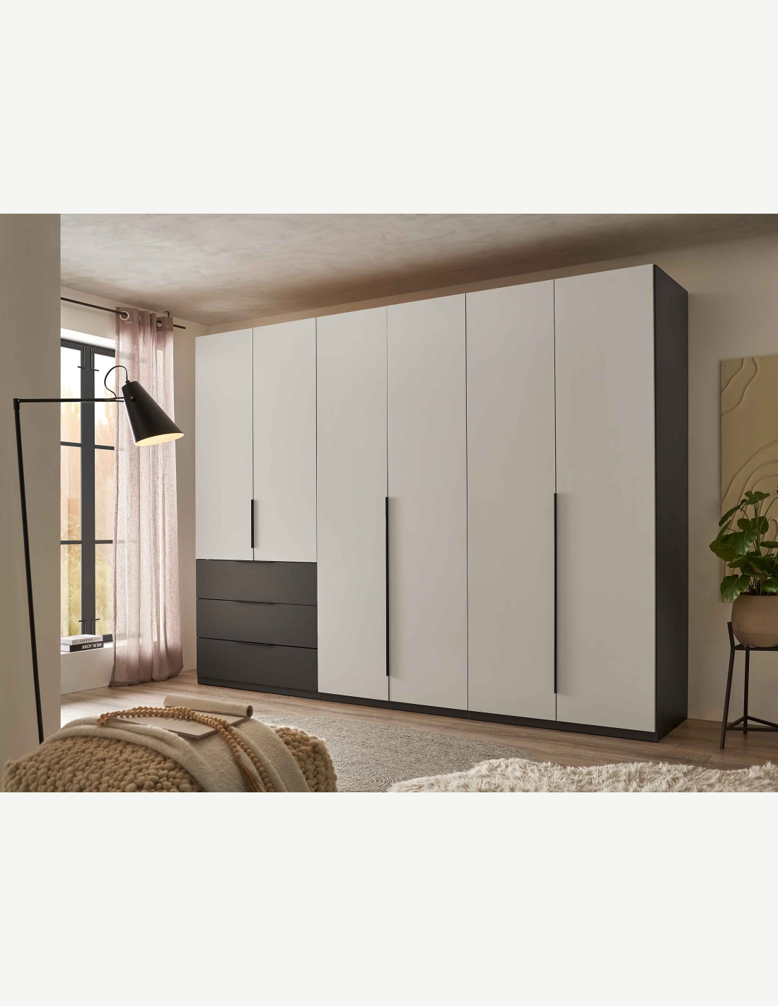 Kleiderschrank mit 6 Drehtüren und 3 Schubkästen aus Holzdekor in der Farbe Graphit/hellgrau. Maße: BHT 300x225,5x59,5cm