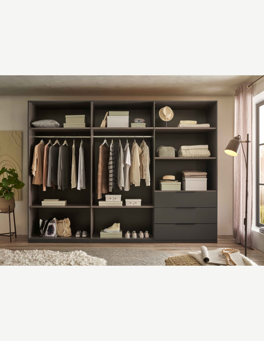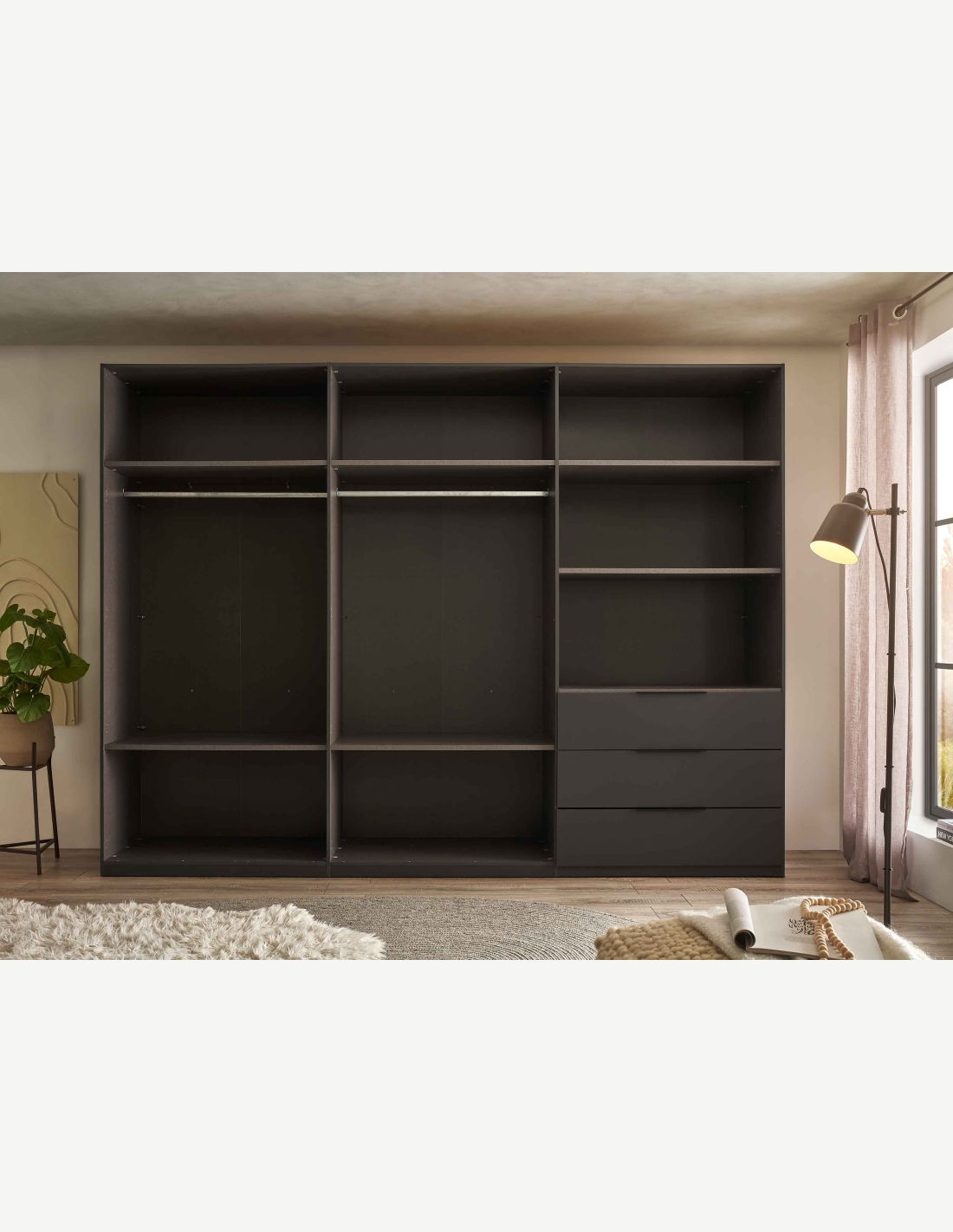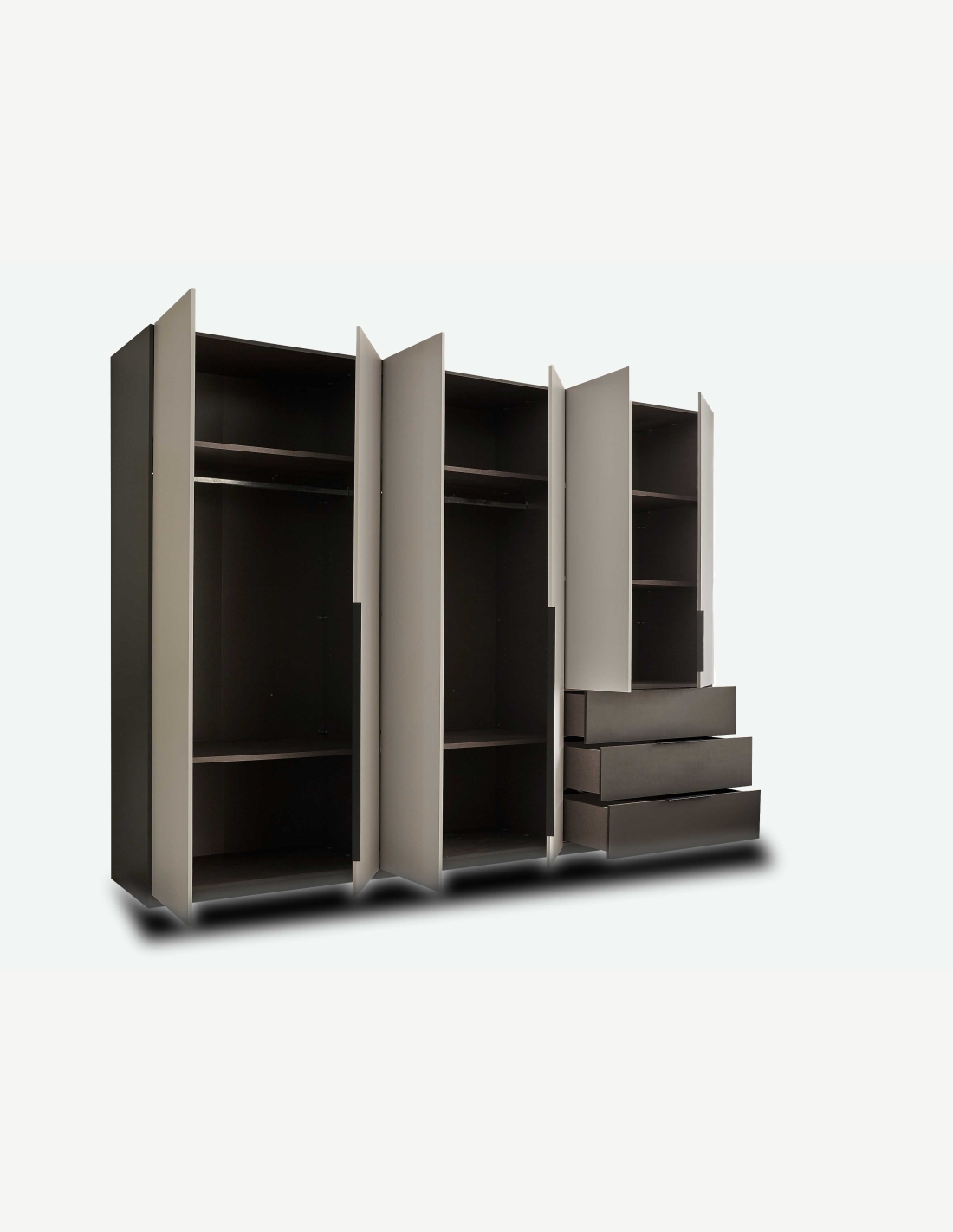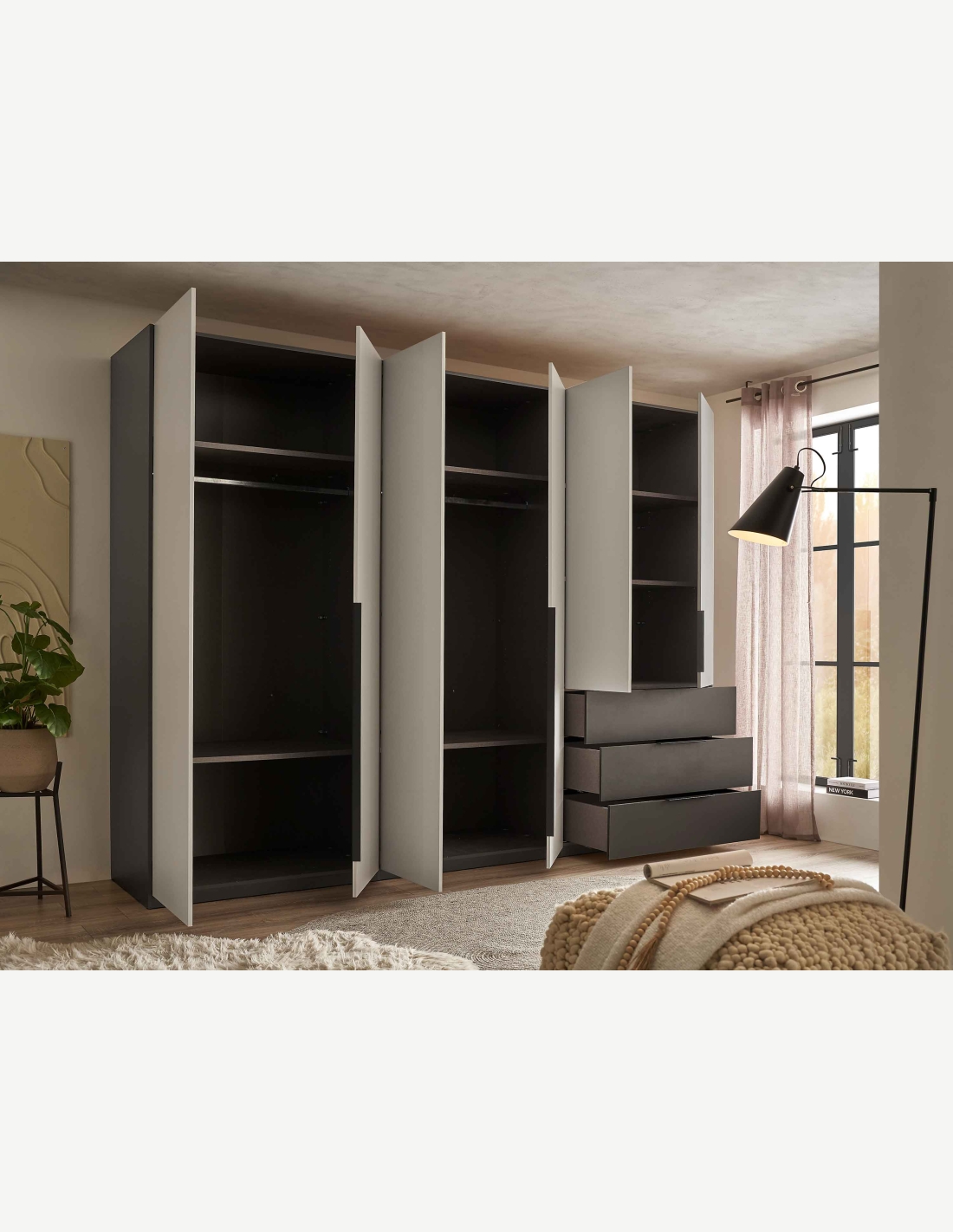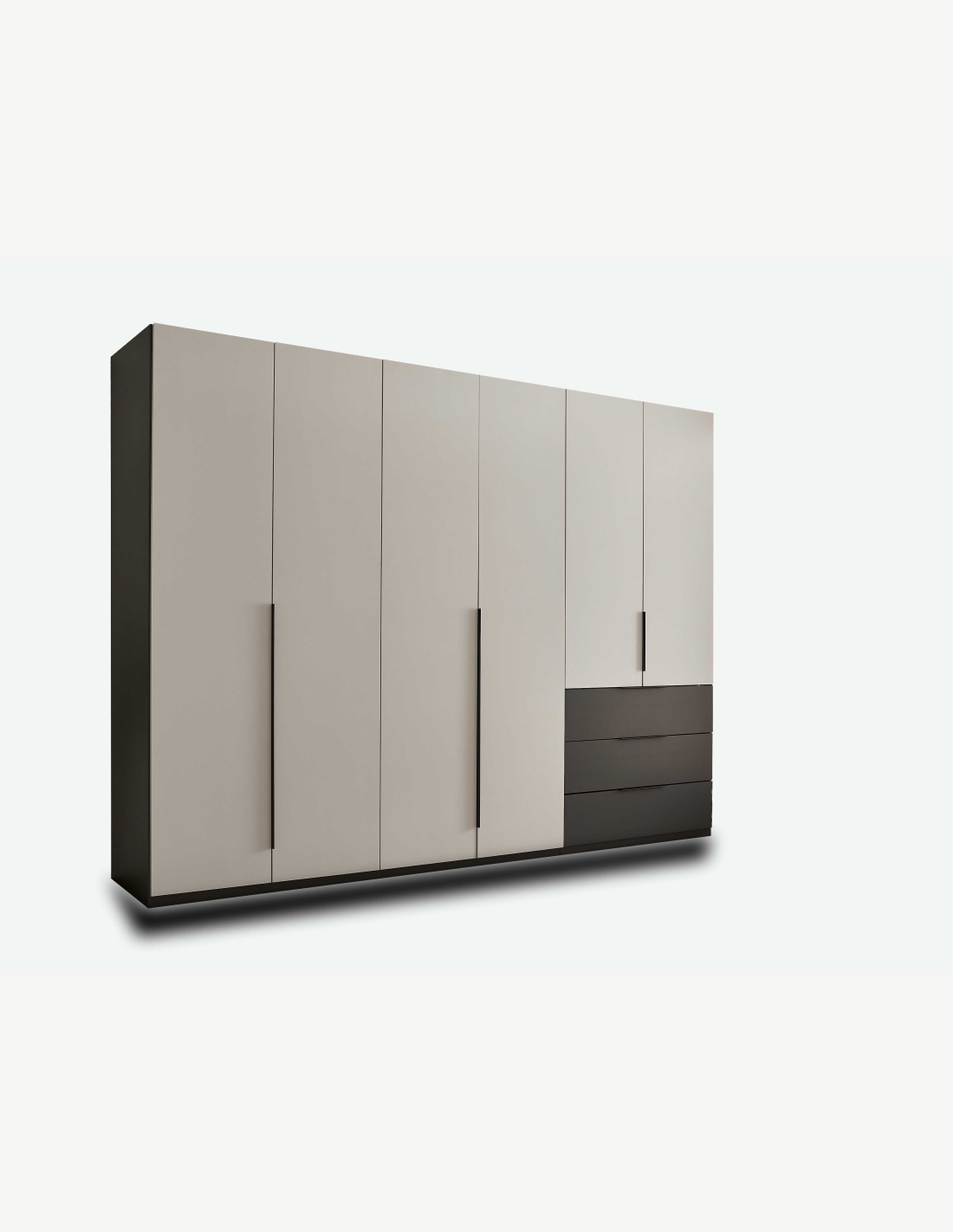 Kleiderschrank mit 6 Drehtüren und 3 Schubkästen aus Holzdekor in der Farbe Graphit/hellgrau. Maße: BHT 300x225,5x59,5cm
