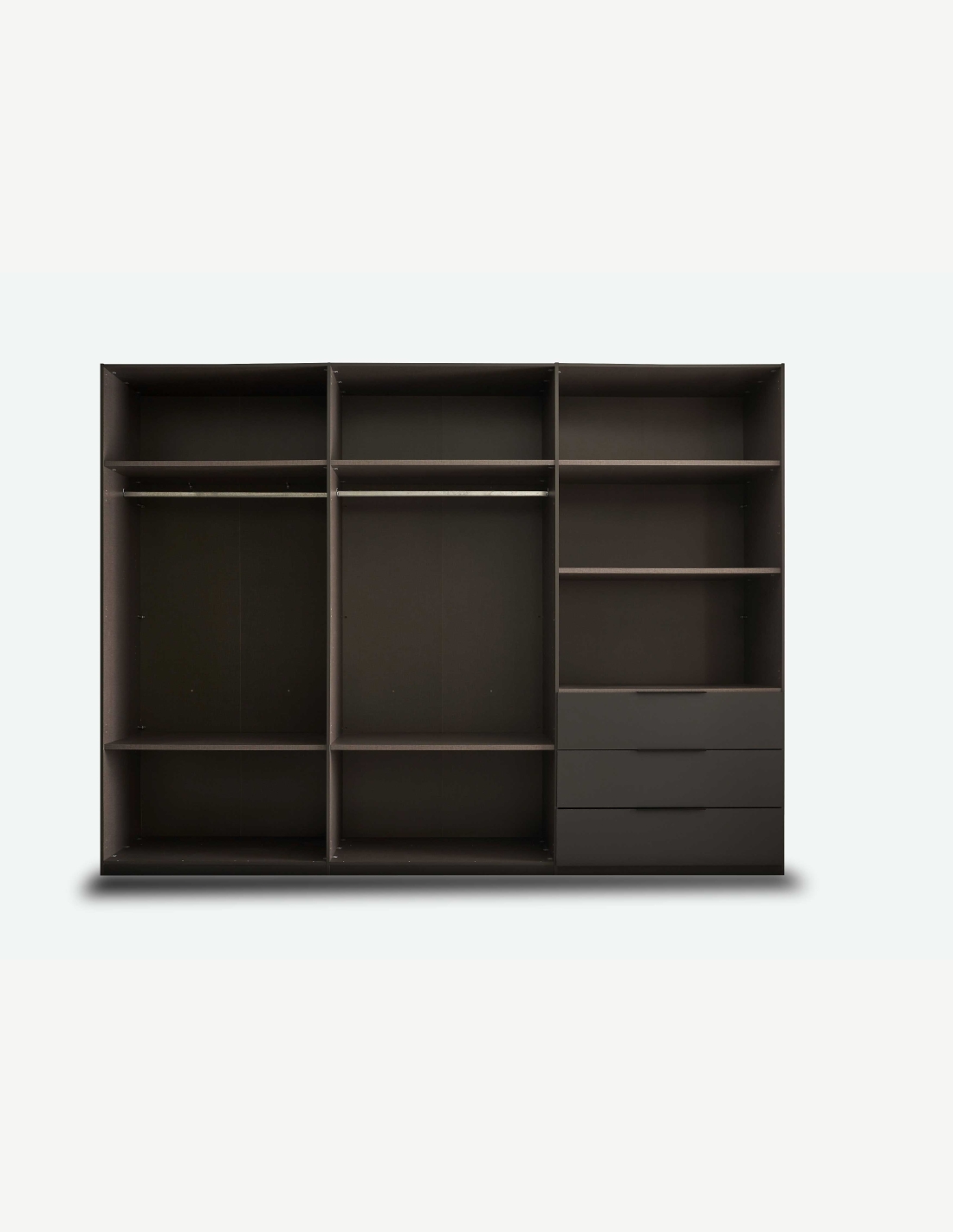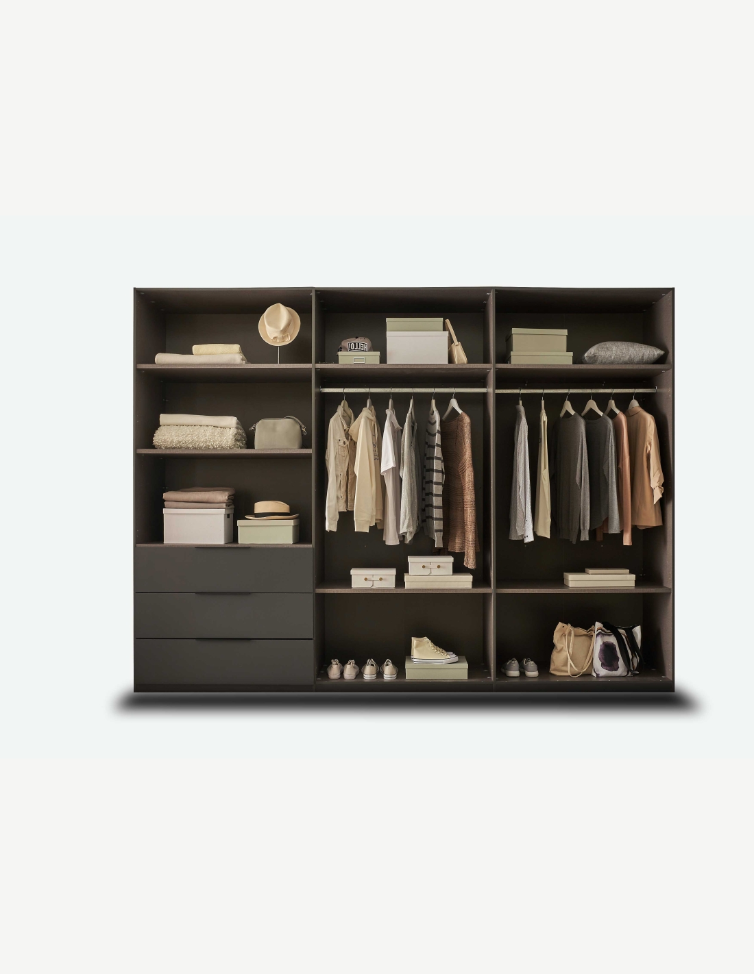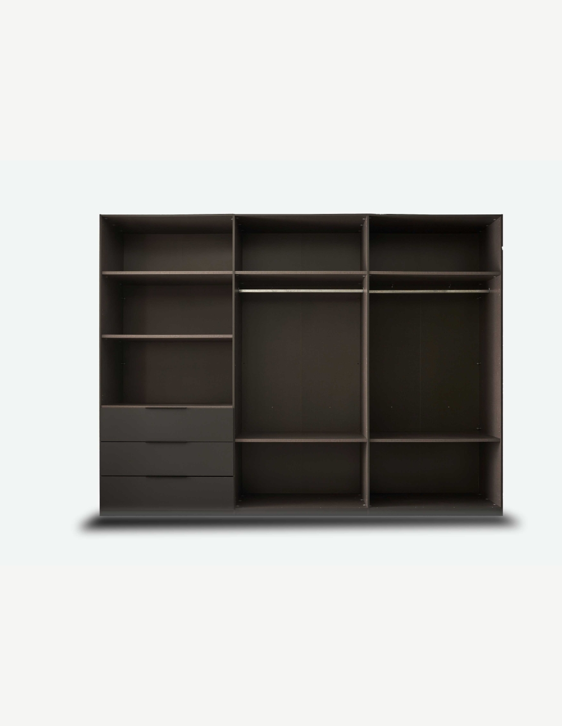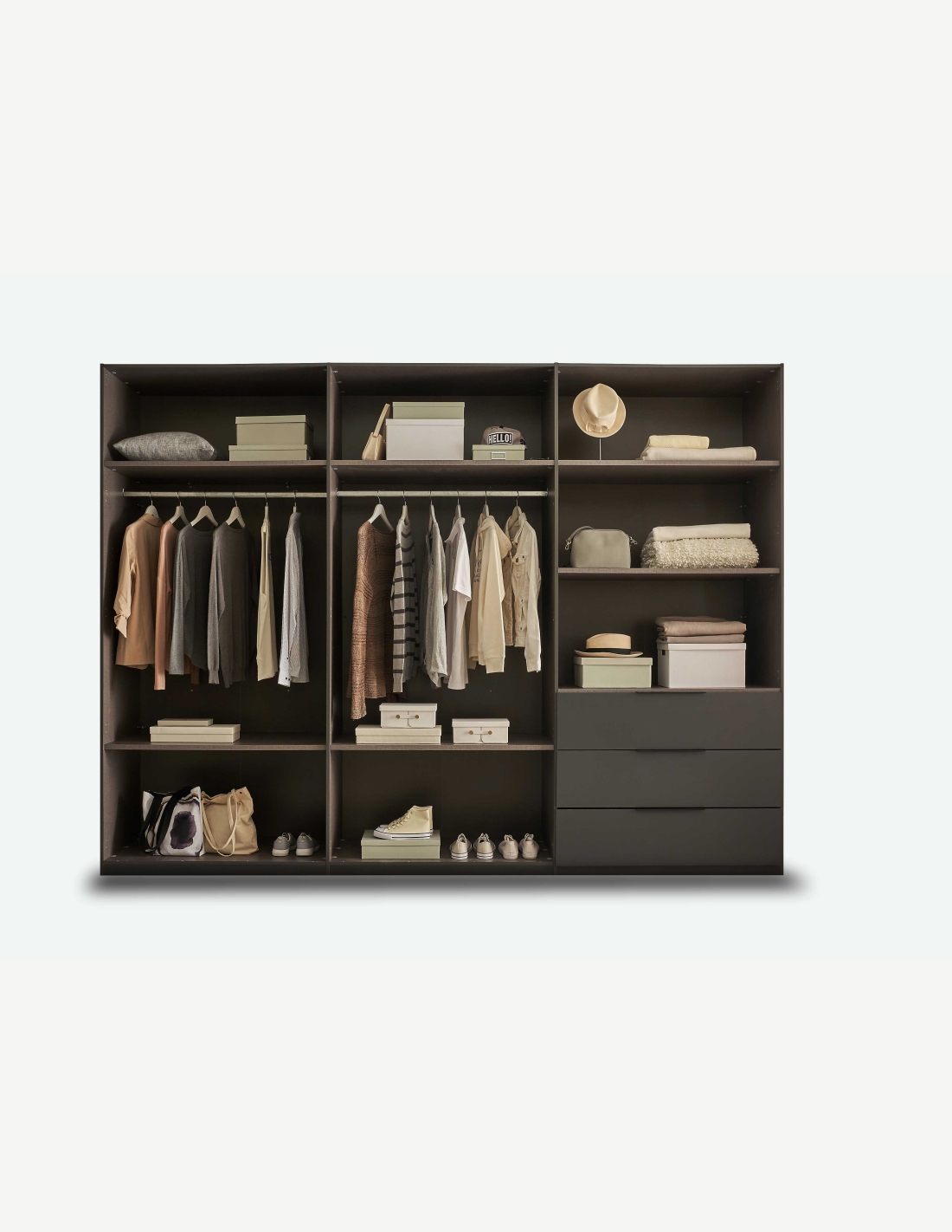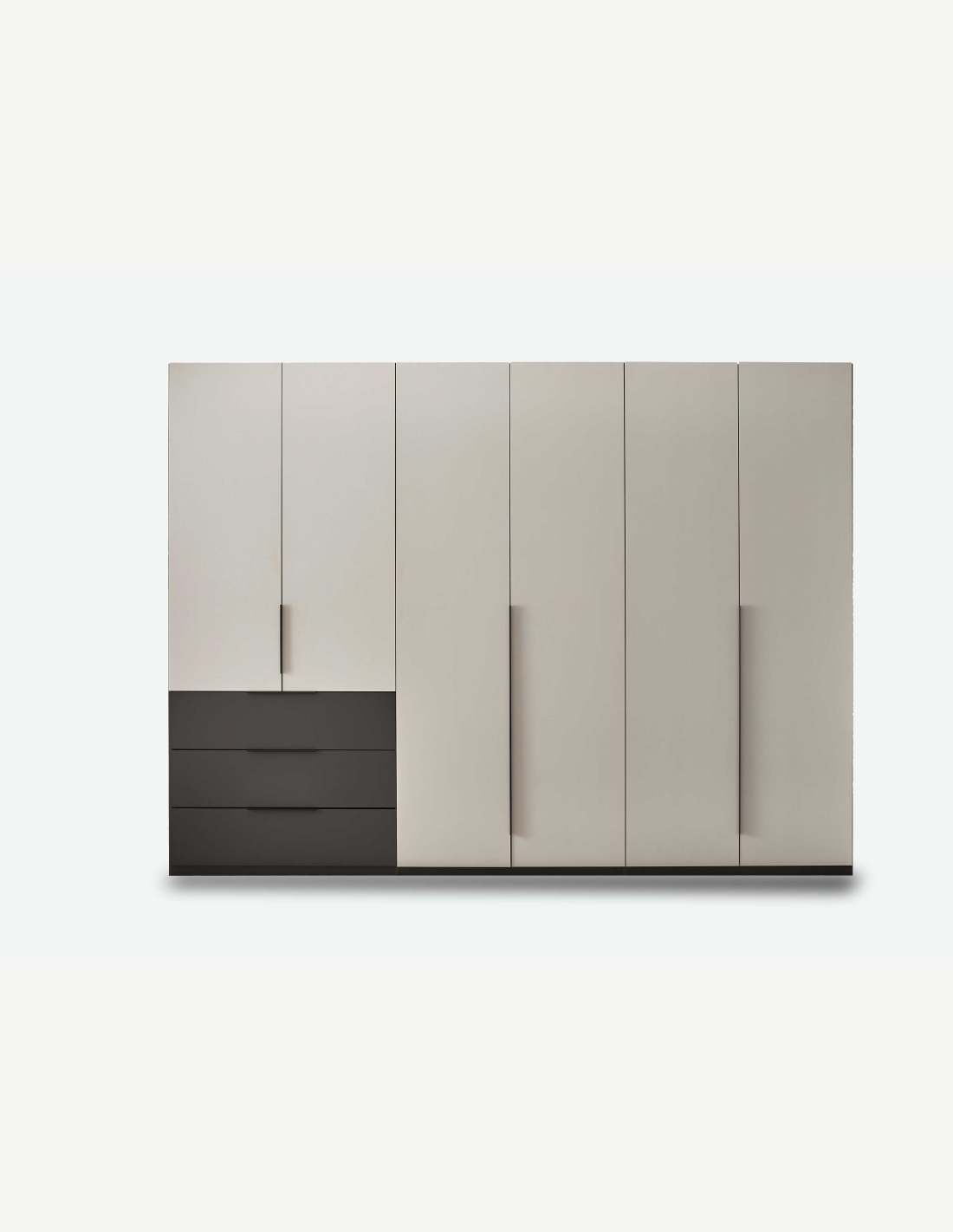 Kleiderschrank mit 6 Drehtüren und 3 Schubkästen aus Holzdekor in der Farbe Graphit/hellgrau. Maße: BHT 300x225,5x59,5cm