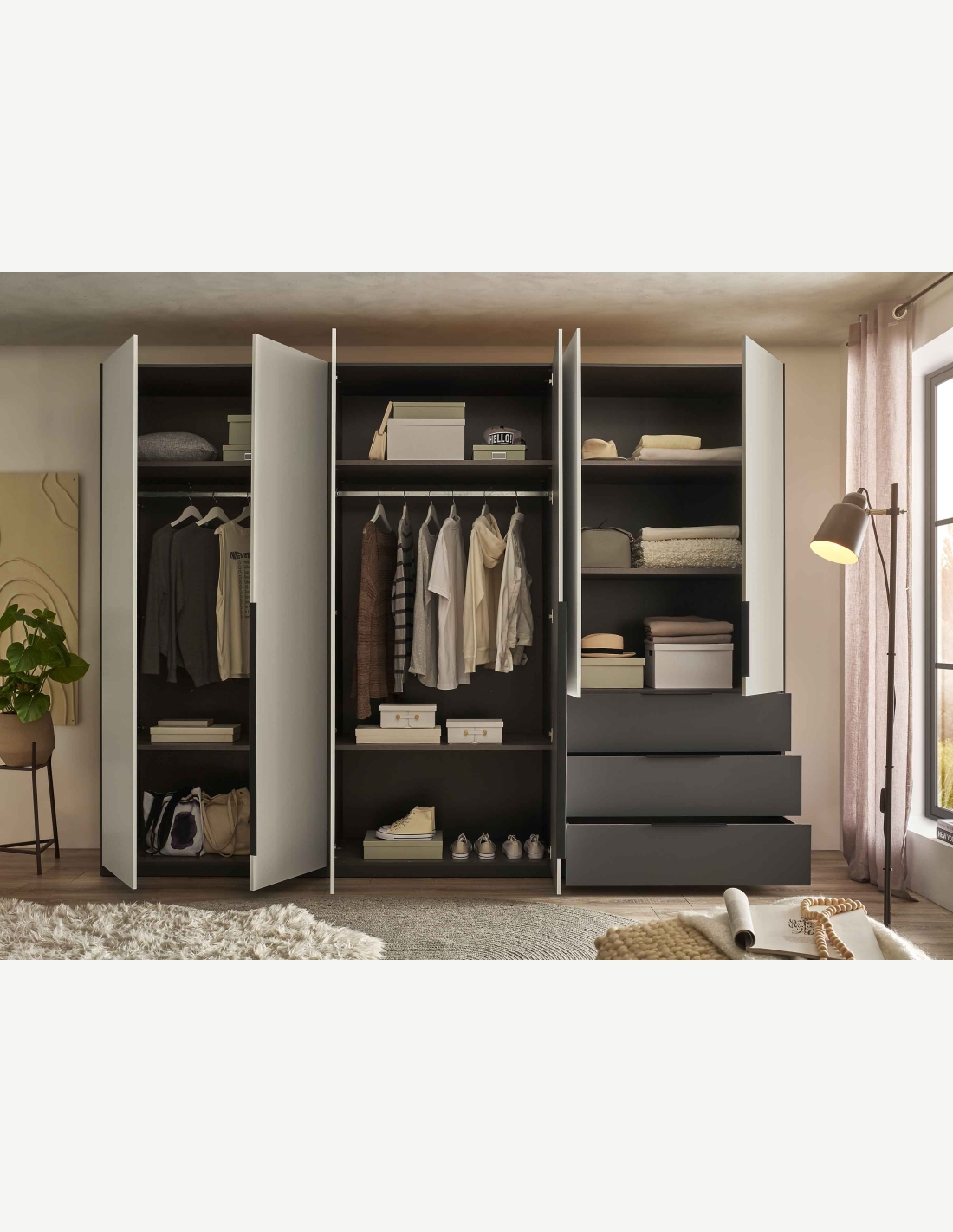 Ordnung ist das halbe Leben, welche dir mit diesem tollen Kleiderschrank sicher gelingen wird. Dieser sehr moderne Kleiderschrank in Graphit/hellgrau schafft einen sehr eleganten Stil. Durch seine 6 Türen 3 Schubkästen 2 Kleiderstangen und 6 Ablageböden bietet er dir sicherlich viel Stauraum für deine Kleider und Accessoires.