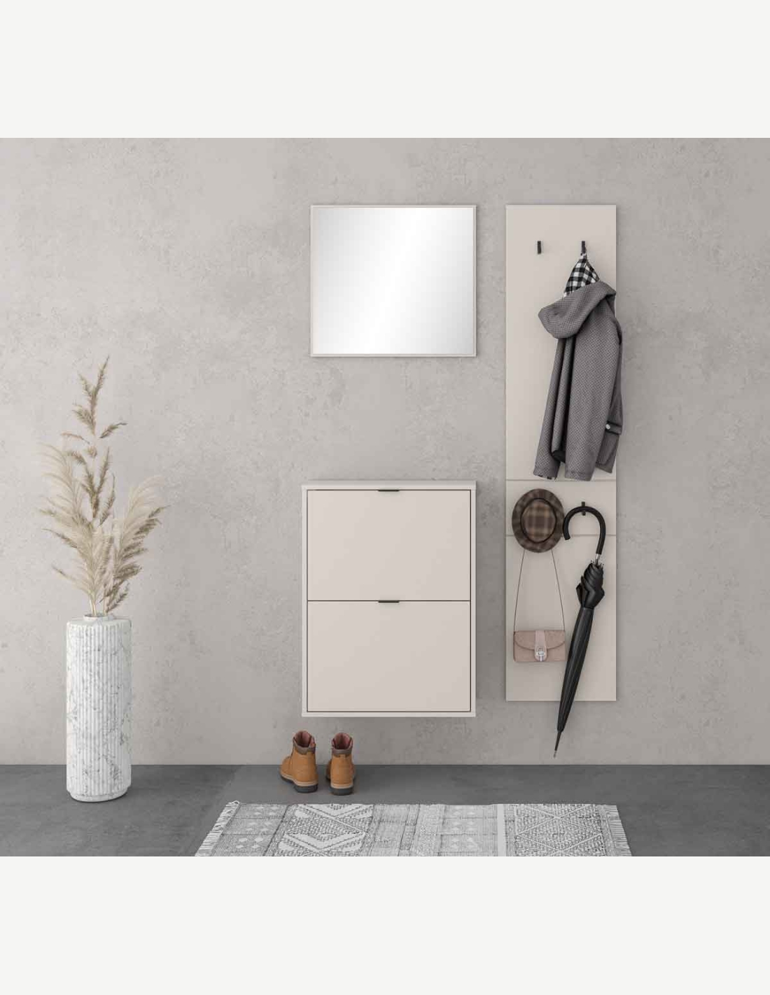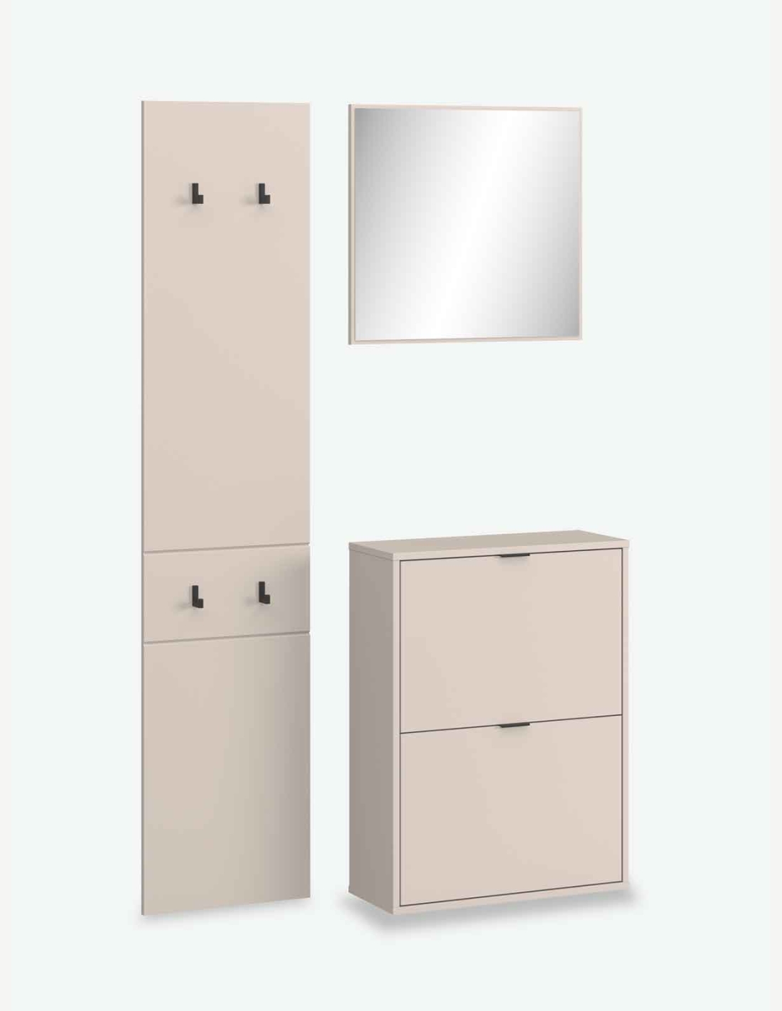 Komplettgarderobe aus Holzdekor in der Farbe Kaschmir, bestehend aus Schuhkommode, Paneel und Spiegel . Maße BHT 105x180x27 cm.