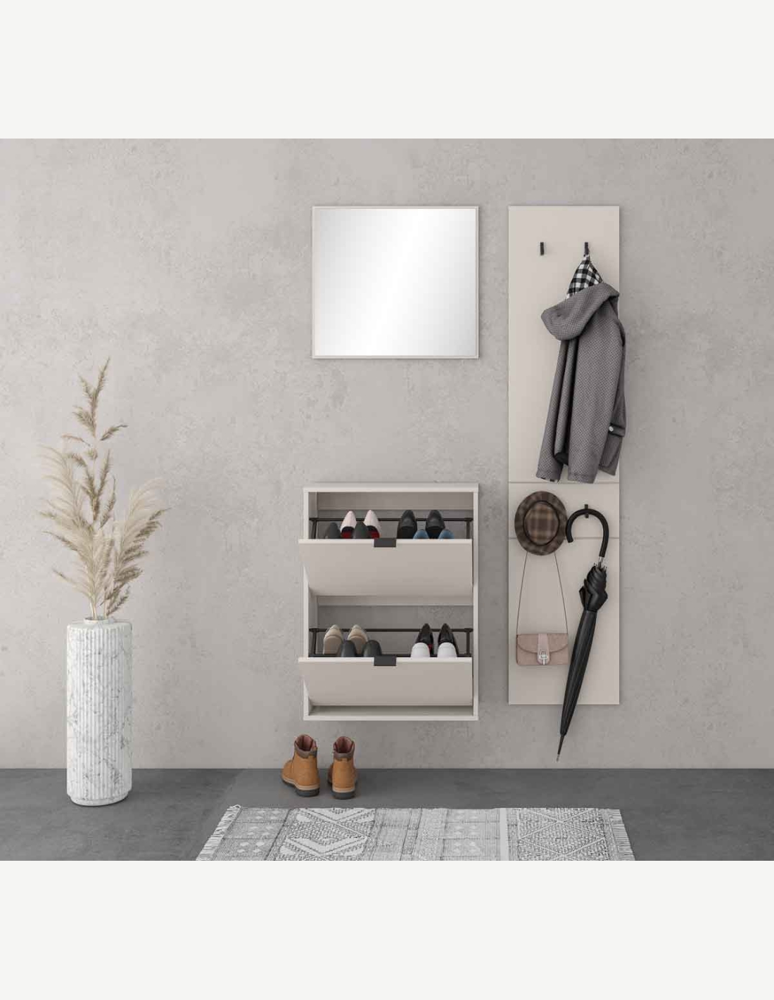 Elegante Kompaktgarderobe aus Holzdekor perfekt für den Eingang oder Flur deiner Wohnung. Es bietet ausreichend Platz um all deine Schuhe und andere Kleidungsstücke in Ordnung zu halten. Diese Garderobe besteht aus 1 Schuhkommode mit 2 Klappen, 1 Paneel mit 4 Kleiderhaken und 1 Spiegel. Dank der praktischen Größe, kann diese kleine Garderobe in jeder Ecke deines Hauses platziert werden.