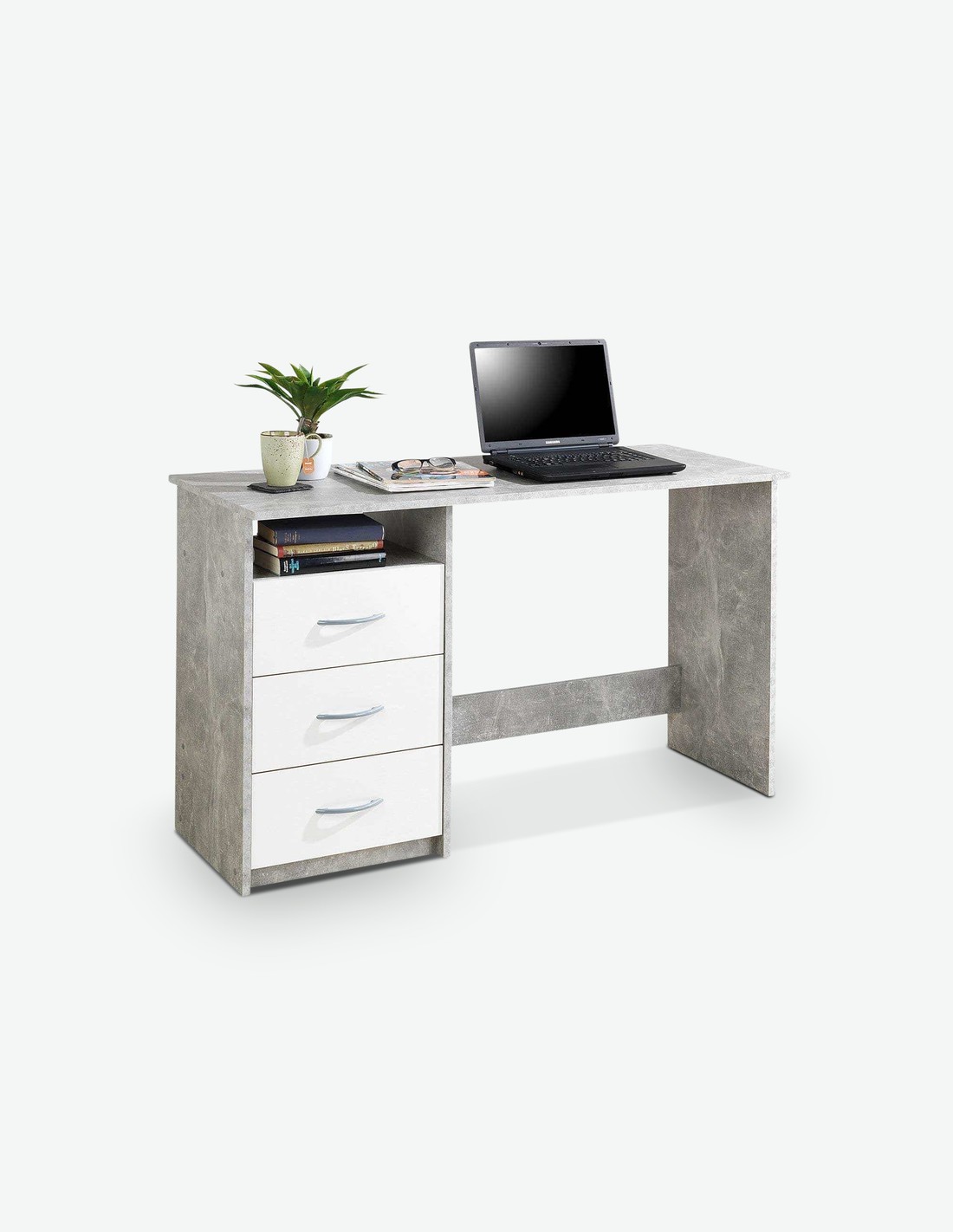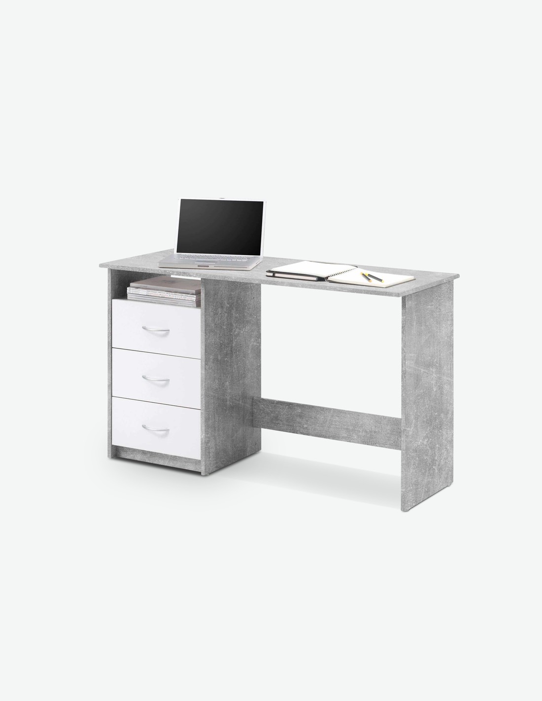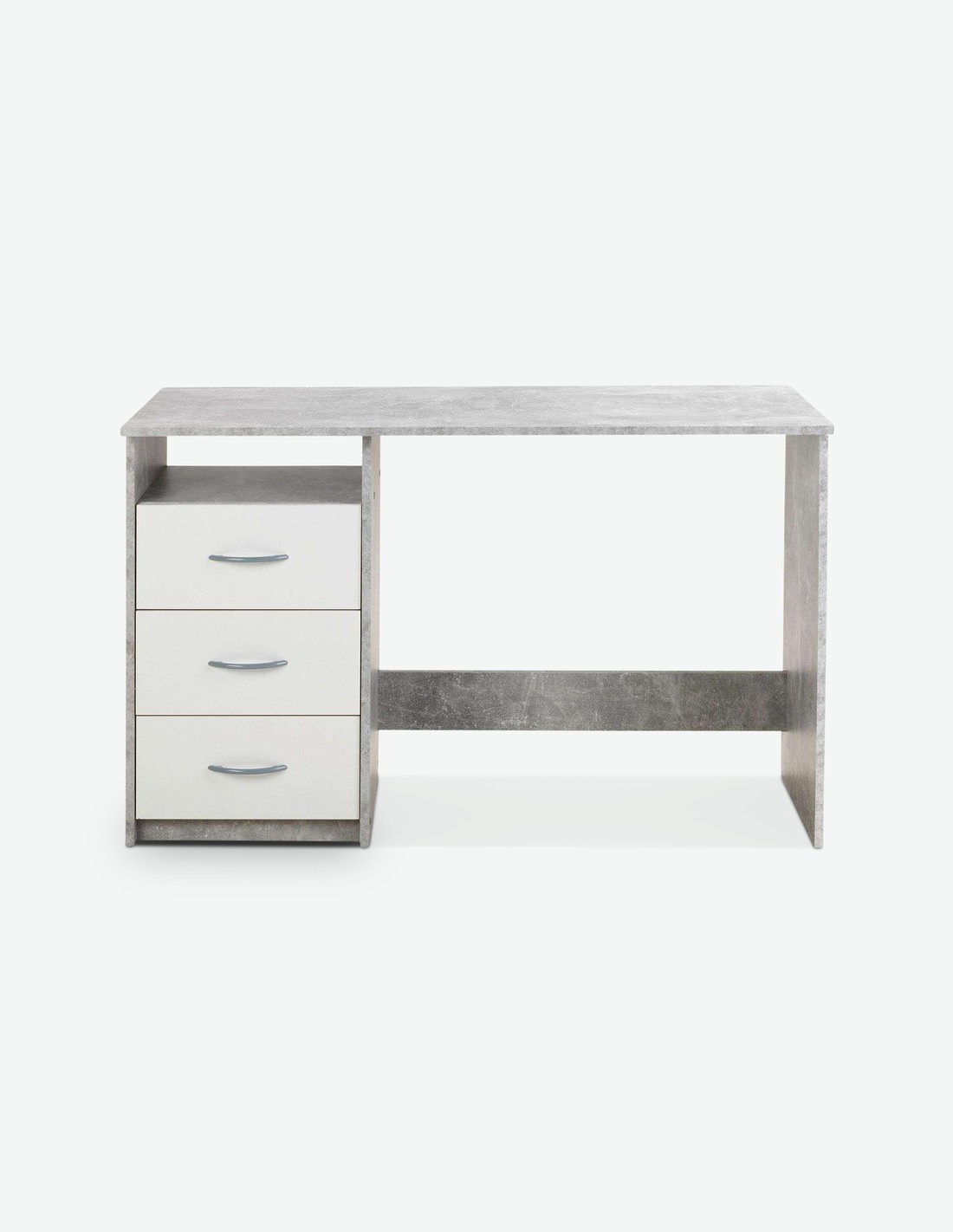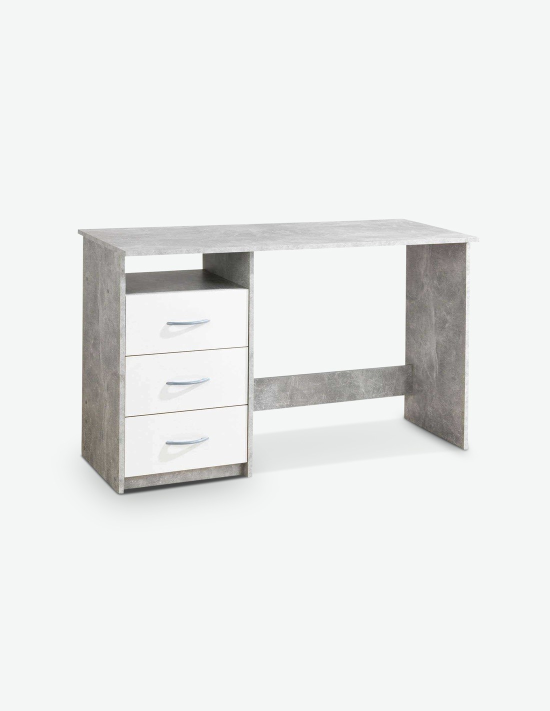 Schreibtisch aus Holzdekor mit 3 Schubkästen und 1 offenem Fach, in 3 verschiedenen Farben verfügbar. Maße BHT 123x77x50 cm