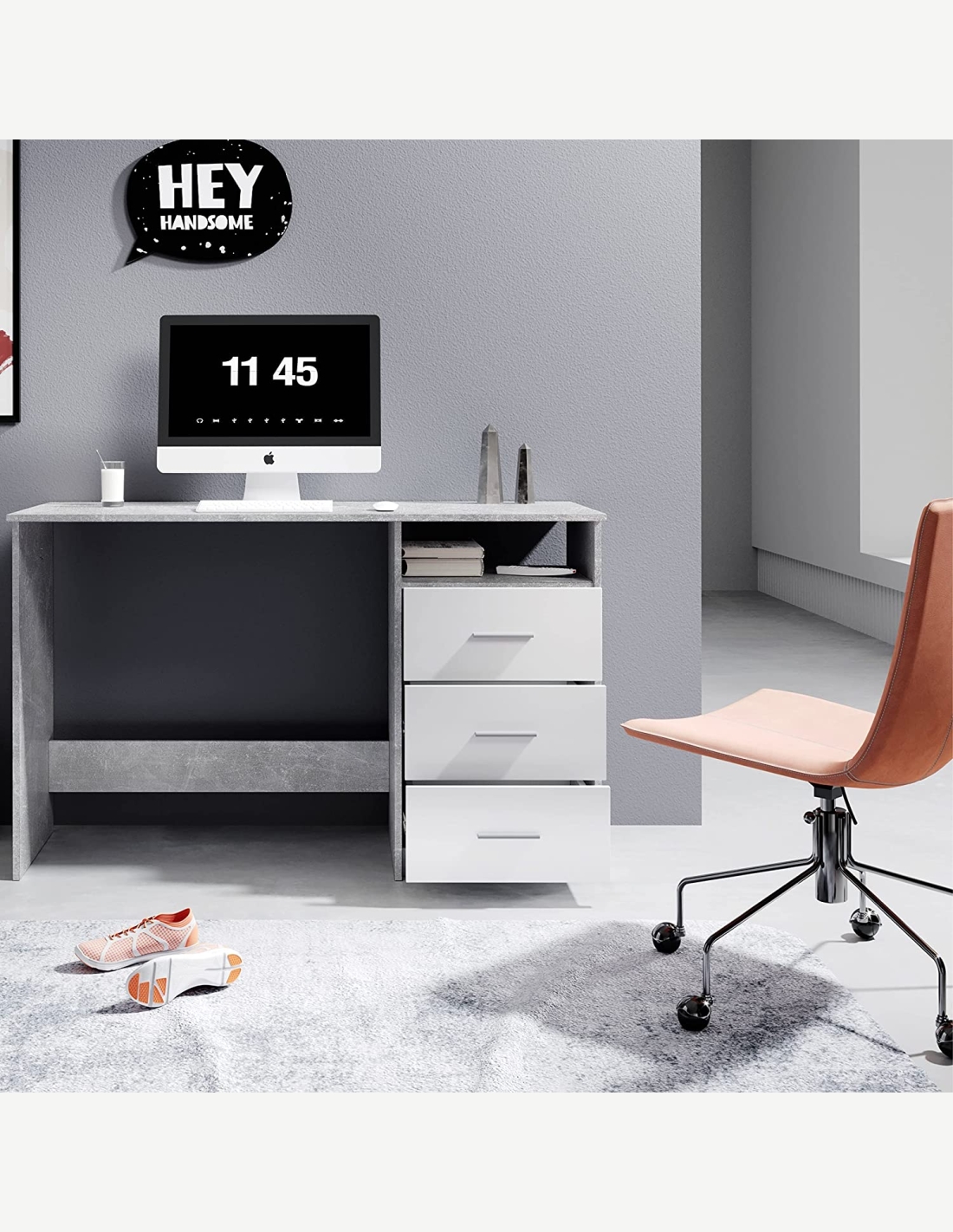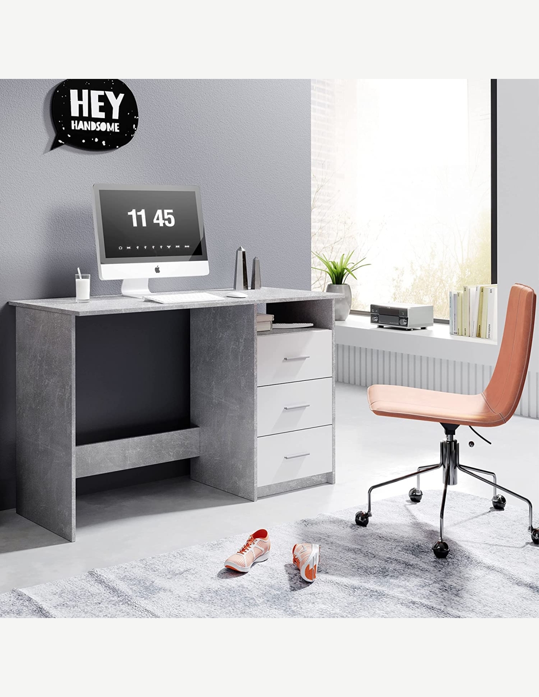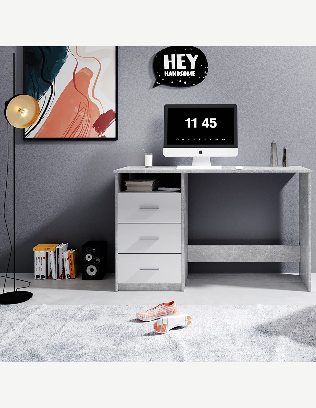 Dieser Schreibtisch aus Holzdekor besteht aus 3 Schubladen und 1 offenem Fach. Dank seiner großen Arbeitsfläche bietet es genügend Platz für alles Wichtige. Zusätzlichen Stauraum bieten dir auch die Schubladen und das offene Fach, hier kannst du problemlos Büroutensilien wie Ordner, Bücher, Schreibwaren und vieles mehr unterbringen. Es wirkt sehr modern und elegant für Büros oder Studios, passt aber auch in ein jedes Jugendzimmer. Wir bieten diesen Schreibtisch in 3 verschiedenen Farben an.
