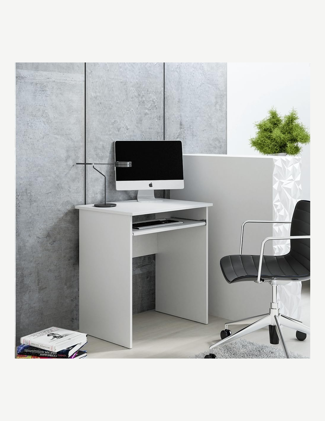 Schreibtisch aus Holzdekor mit ausziehbarer Platte für Tastatur in der Farbe Weiß oder Sonoma Eiche. Maße BHT ca. 68x50x75cm