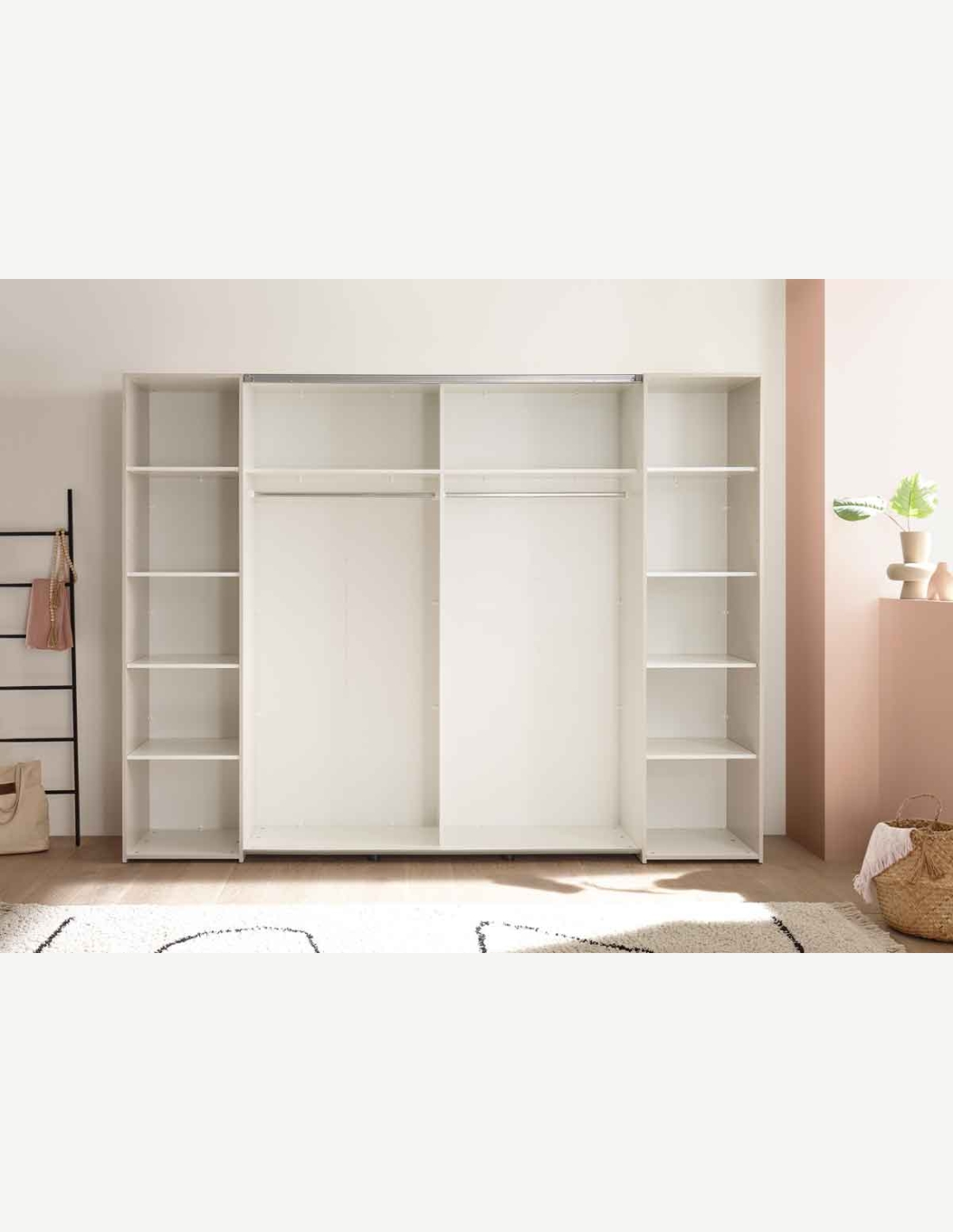 Kleiderschrank mit Dreh- und Schwebetüren in Holzdekor in der Farbe Weiß. Viel Stauraum. Maße: BHT ca. 267x205x57cm