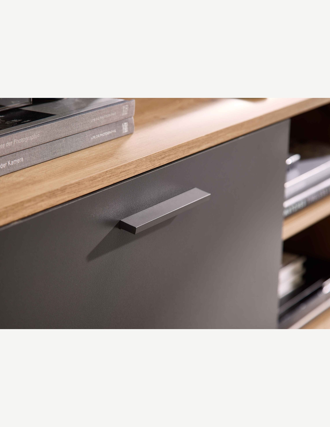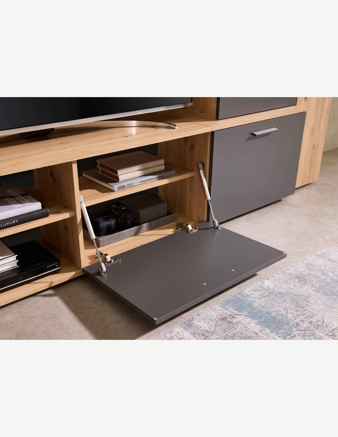 Diese moderne Wohnwand verleiht deinem Wohnzimmer eine frische und elegante Note. Sie bietet reichlich Stauraum für DVDs, Bücher, Deko-Objekte oder andere Wohnaccessoires. Die Türen lassen sich mit ihren Kunststoffgriffen schnell und einfach öffnen. Das TV-Möbel verfügt über 3 Klapptüren und 2 offenen Fächern. In den offenen Fächern lässt sich deine Dekoration gut präsentieren. Eine Wohnwand, die nicht nur mit stilvoller Optik überzeugt, sondern auch mit einer Menge Stauraum.