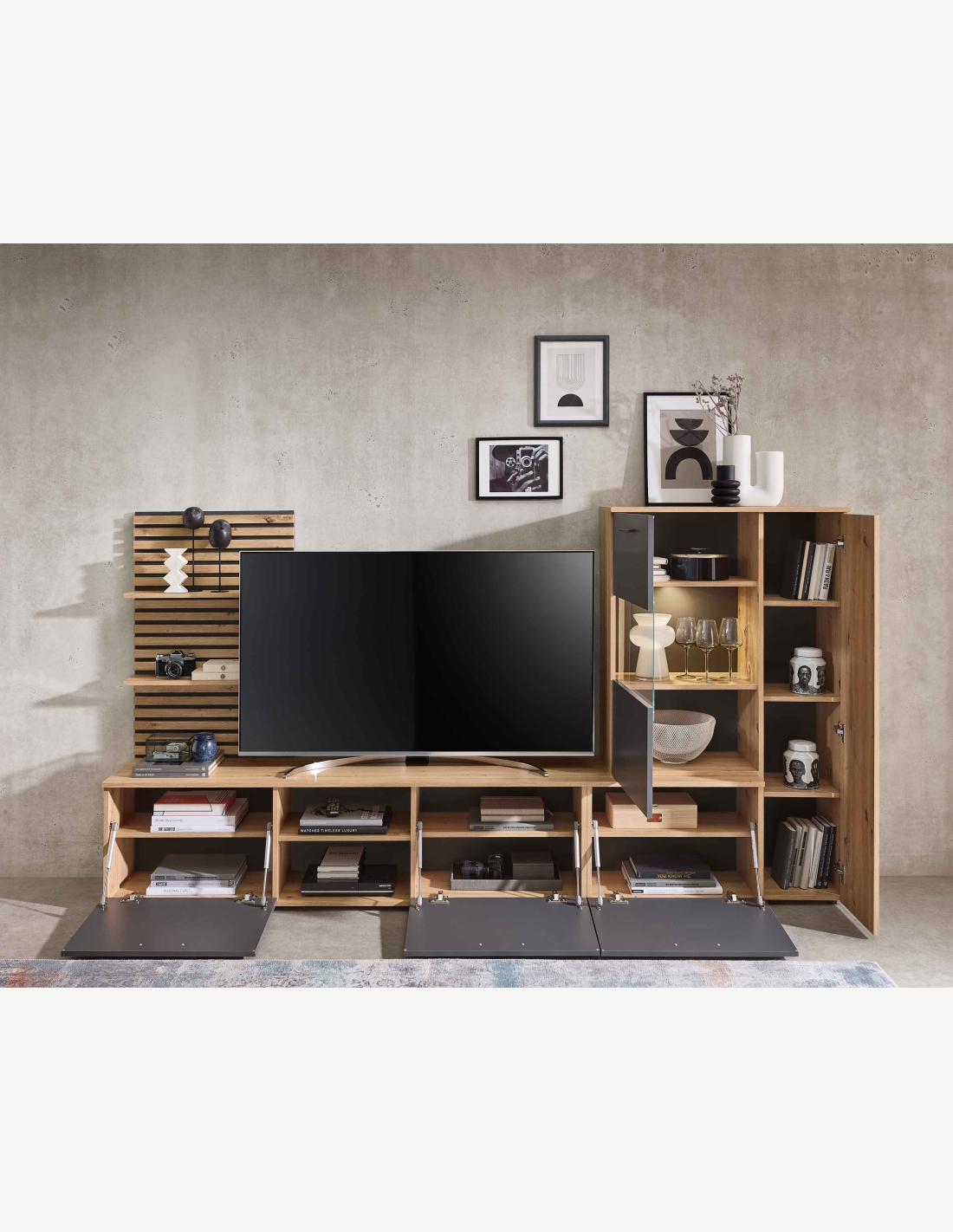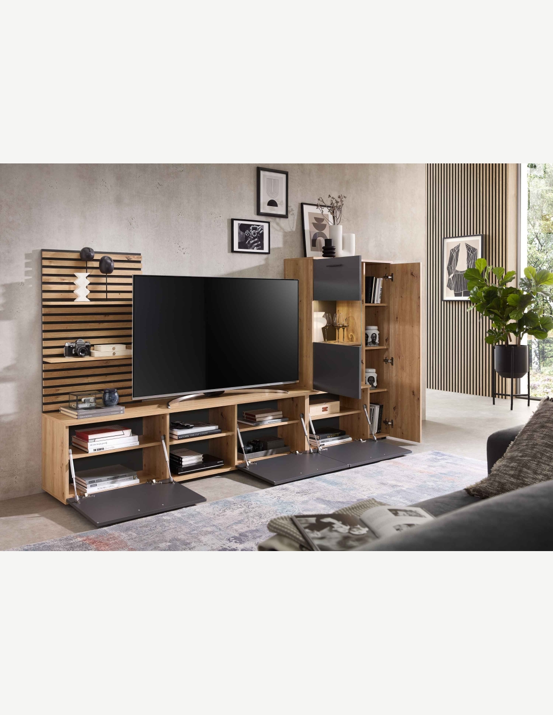 Elegante Wohnwand aus Holzdekor mit Hochschrank, Wandboard und TV-Möbel. Erhältlich in 2 verschiedenen Farben. Maße BHT ca. 250x135x38 cm