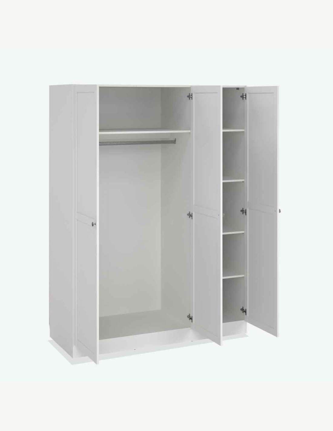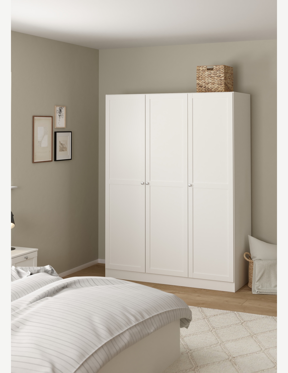 Armadio a 3 ante a battente in legno laminato con 5 ripiani e un asta per vestiti, disponibile bianco oppure Jackson Hickory. Dimensioni: LAP 147x200,1x61,6cm