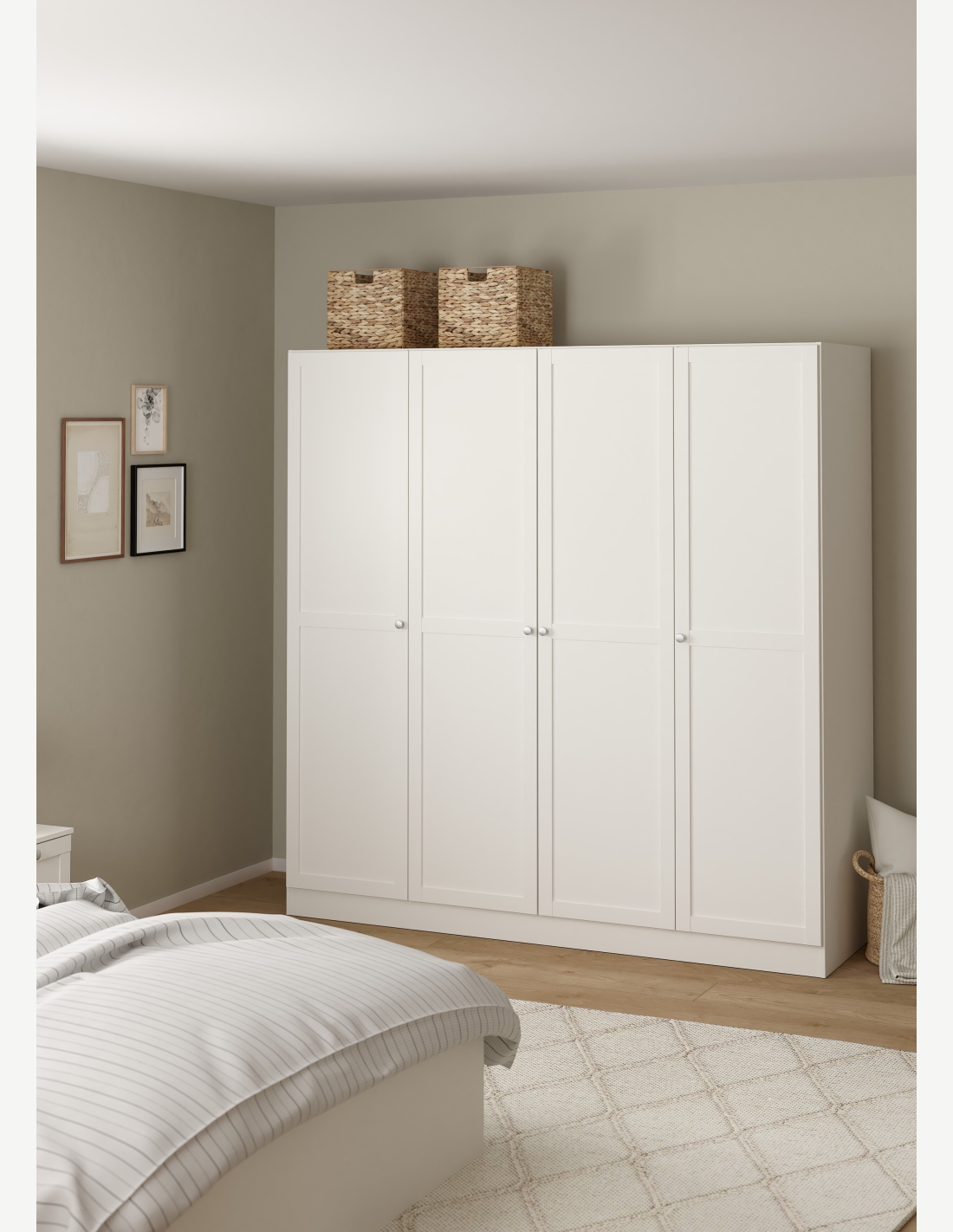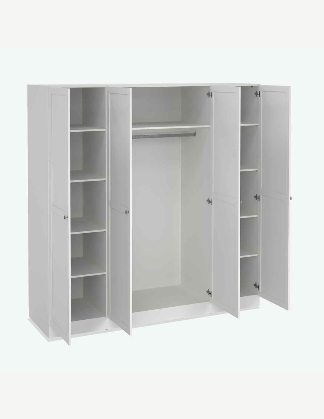 Armadio a 4 ante a battente in legno laminato con 9 ripiani e un asta per vestiti, disponibile bianco oppure Jackson Hickory. Dimensioni: LAP 195,5x200,1x61,6cm
