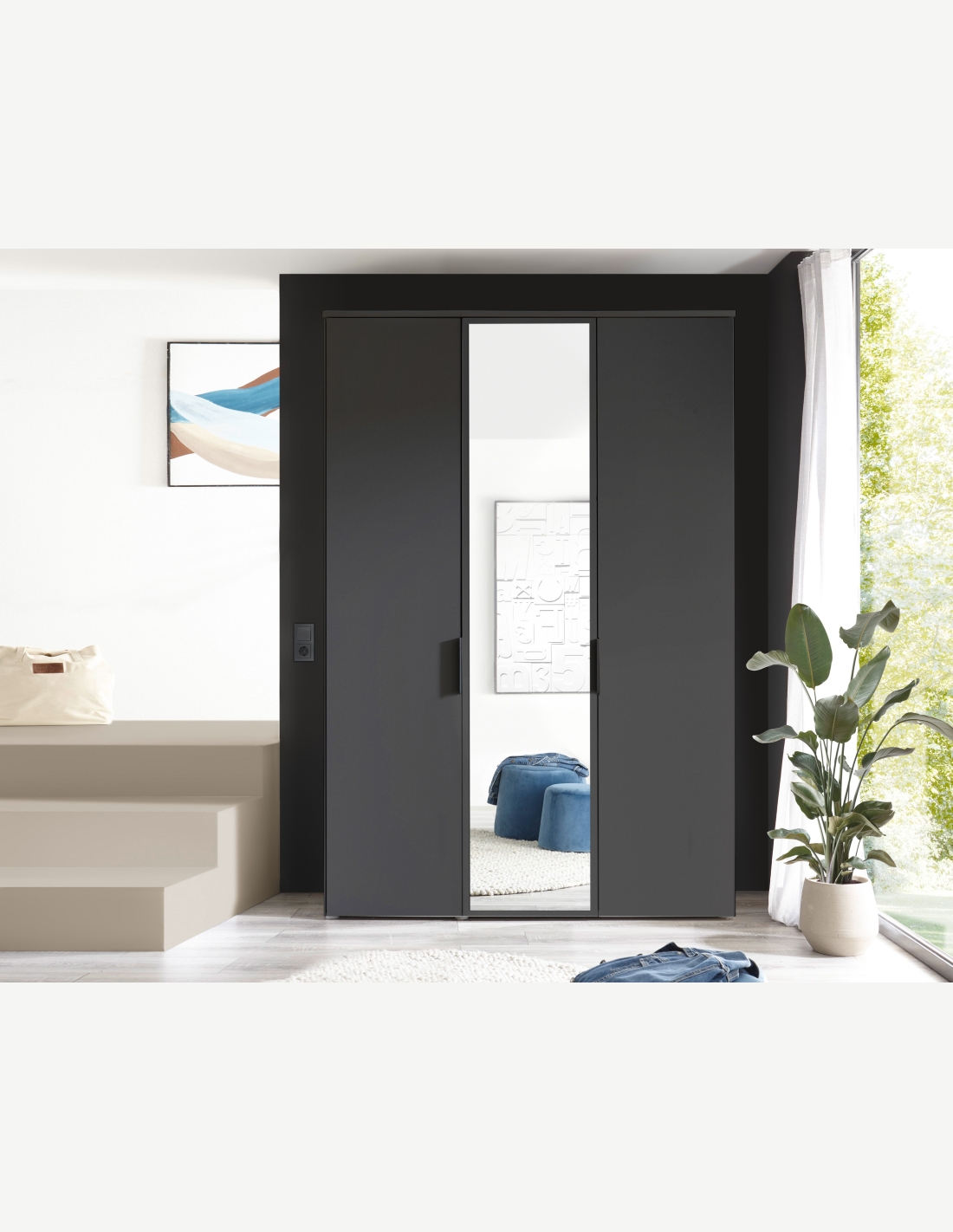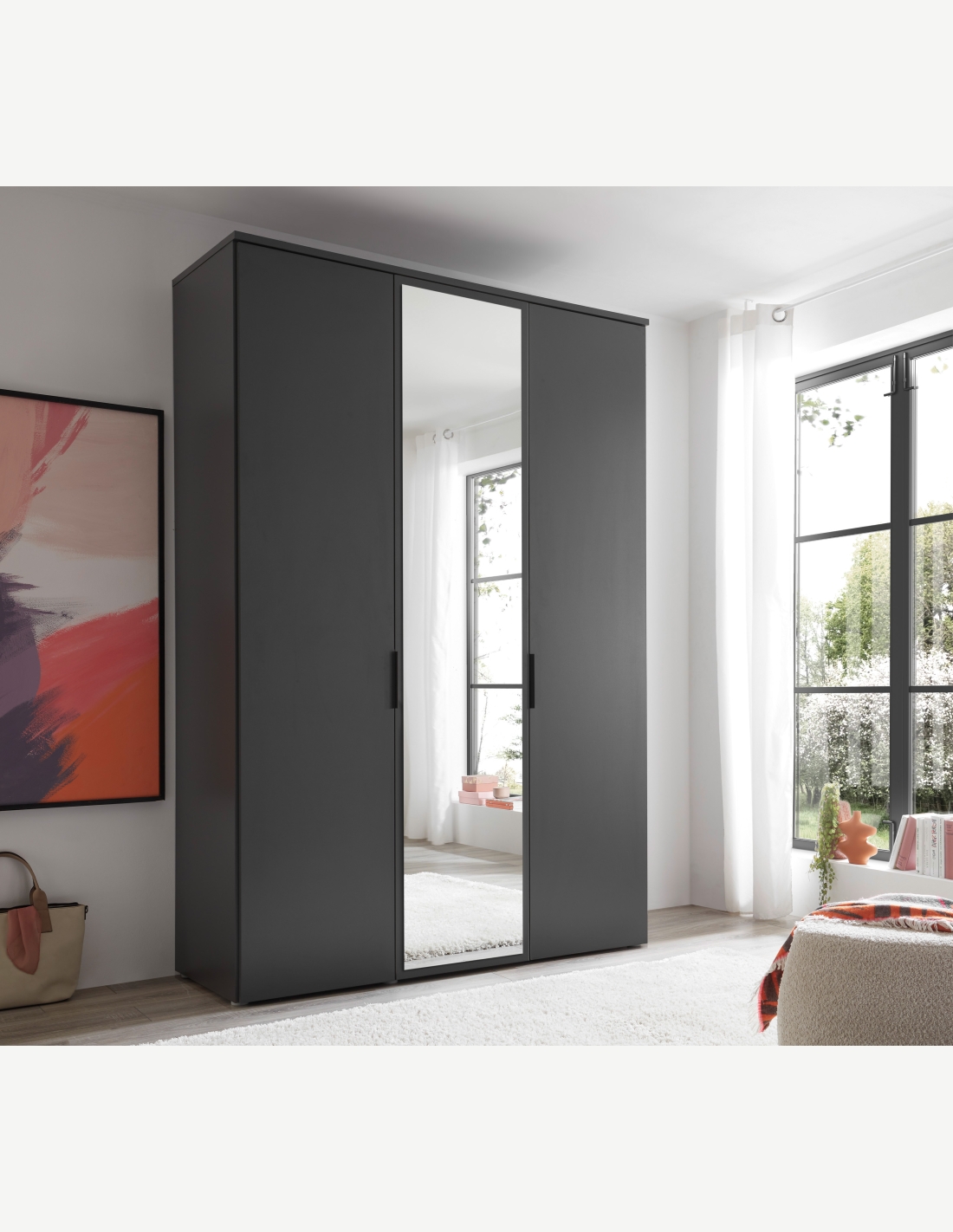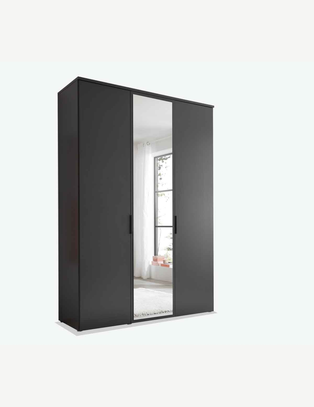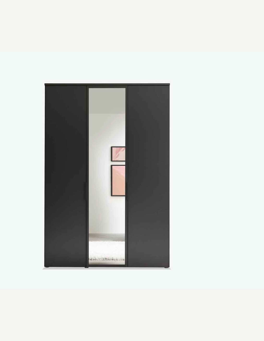 Armadio a 2 o a 3 ante battenti di qui 1 a specchio con 5 ripiani un asta per vestiti e un piccolo comò interno, disponibile in grafite . Dimensioni: LAP 101,7x225x52cm ( 2 Ante ) LAP 151,7x225x52cm ( 3 Ante )