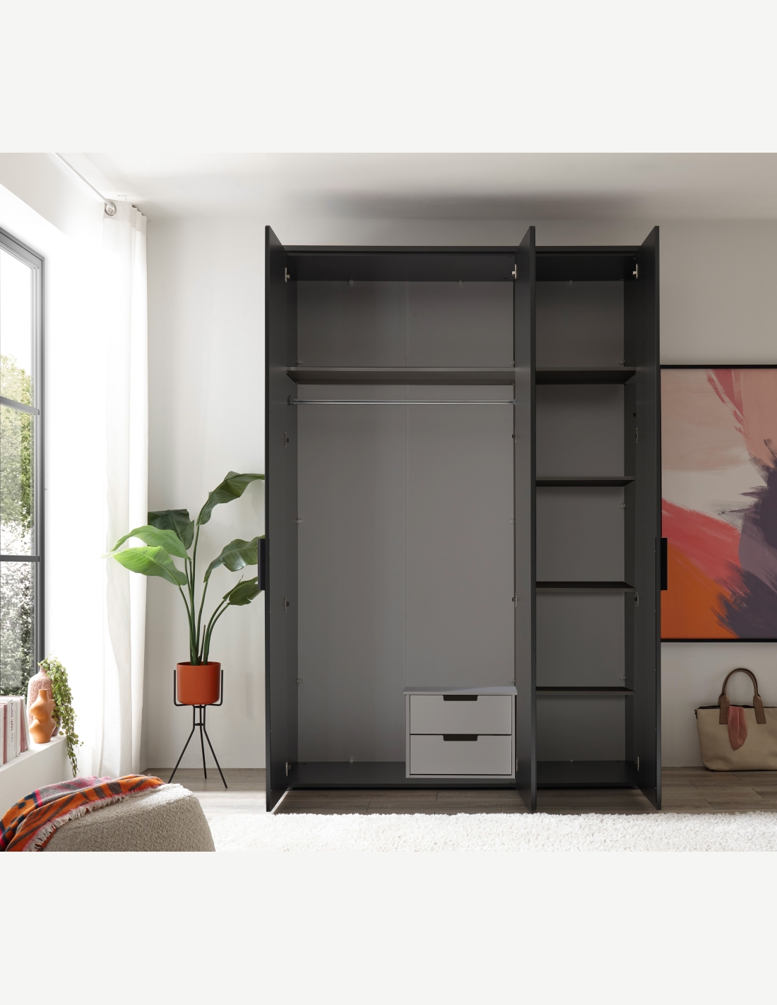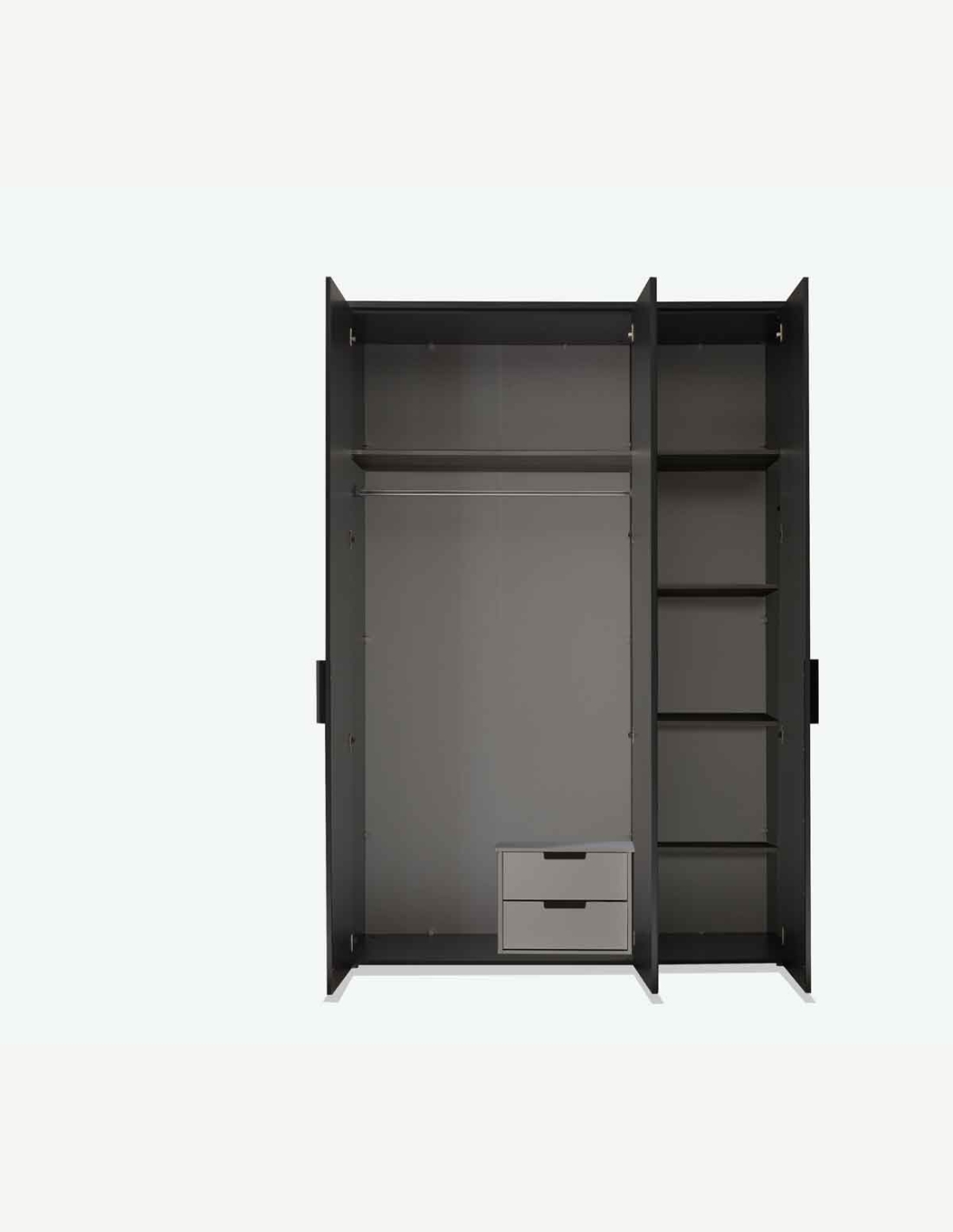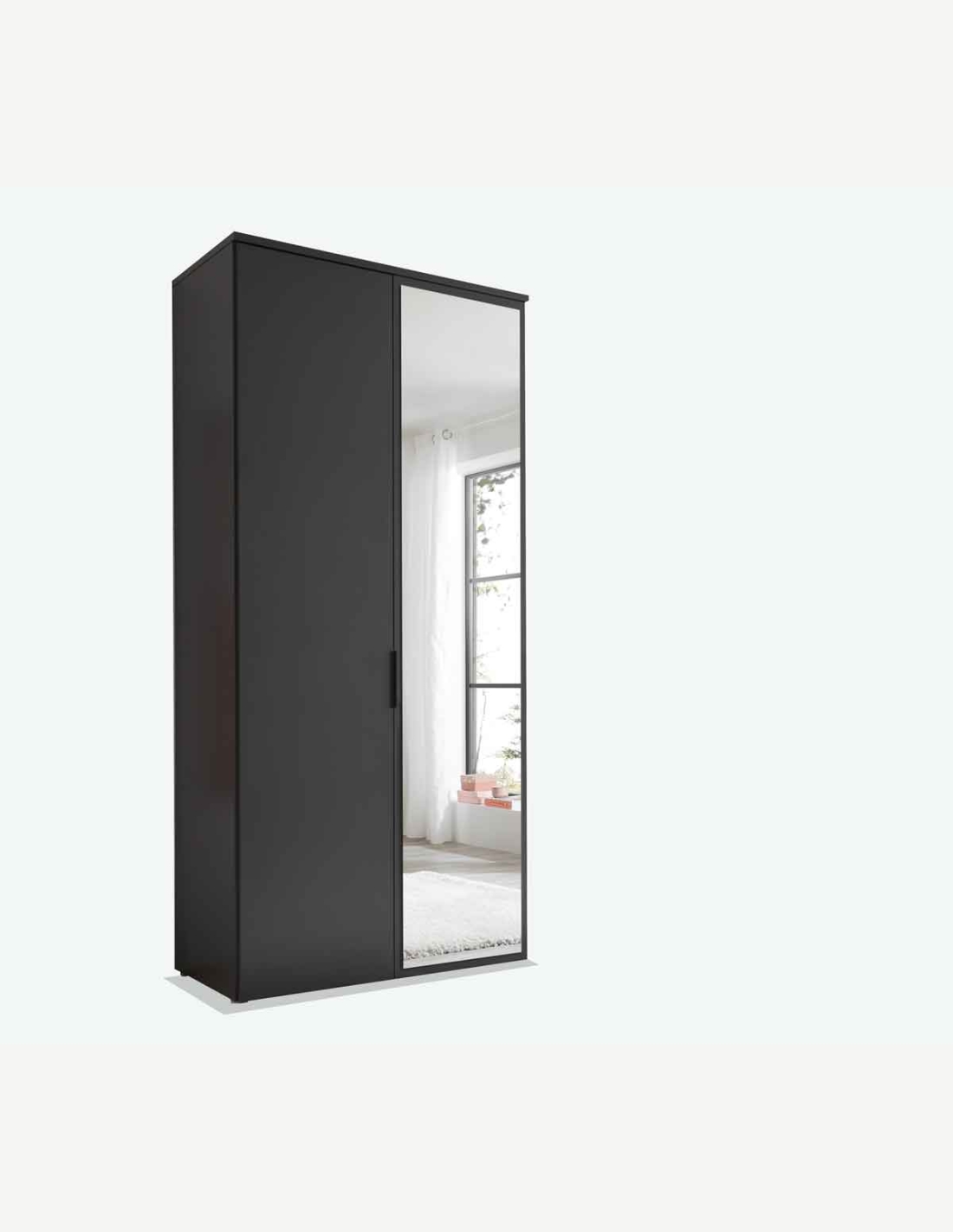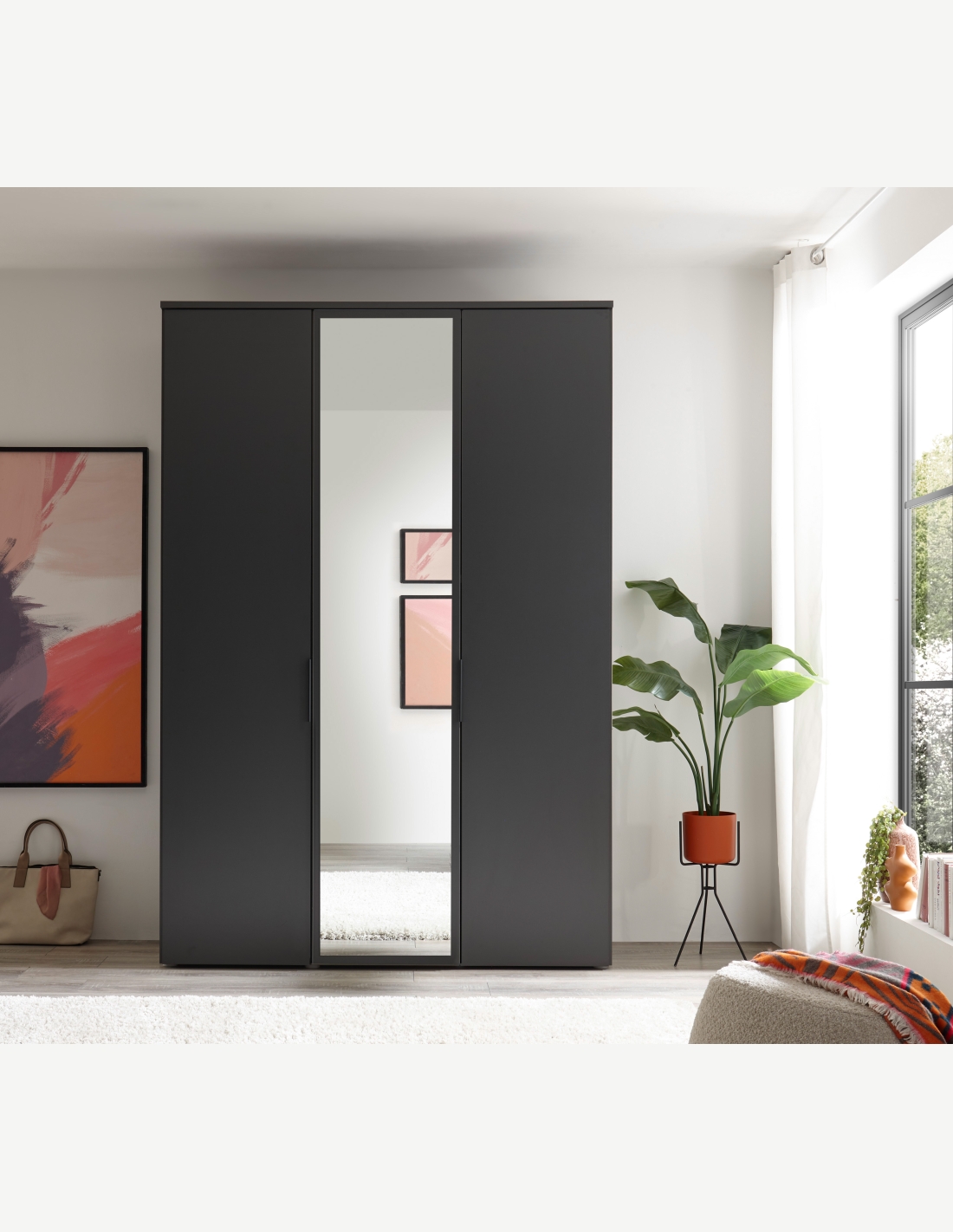 Armadio a 2 o a 3 ante battenti di qui 1 a specchio con 5 ripiani un asta per vestiti e un piccolo comò interno, disponibile in grafite . Dimensioni: LAP 101,7x225x52cm ( 2 Ante ) LAP 151,7x225x52cm ( 3 Ante )