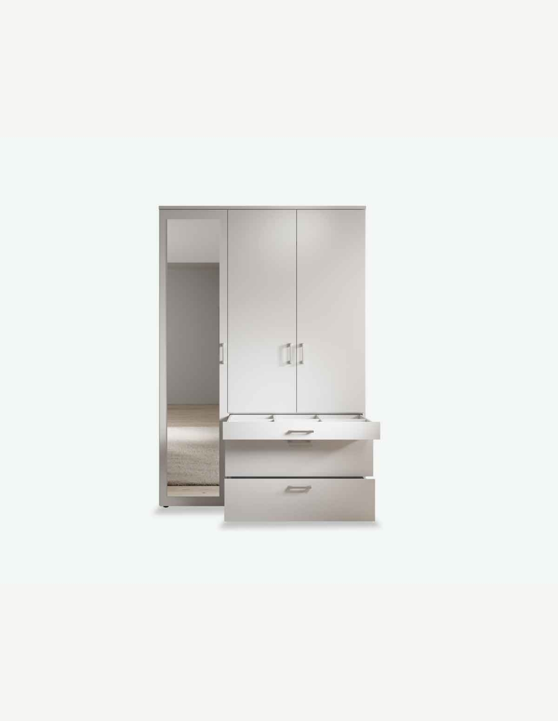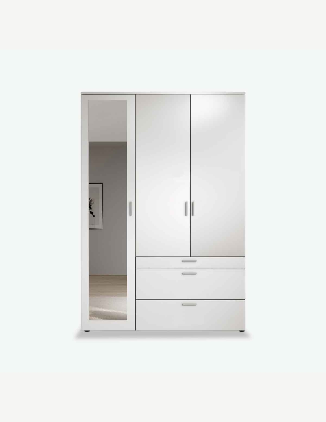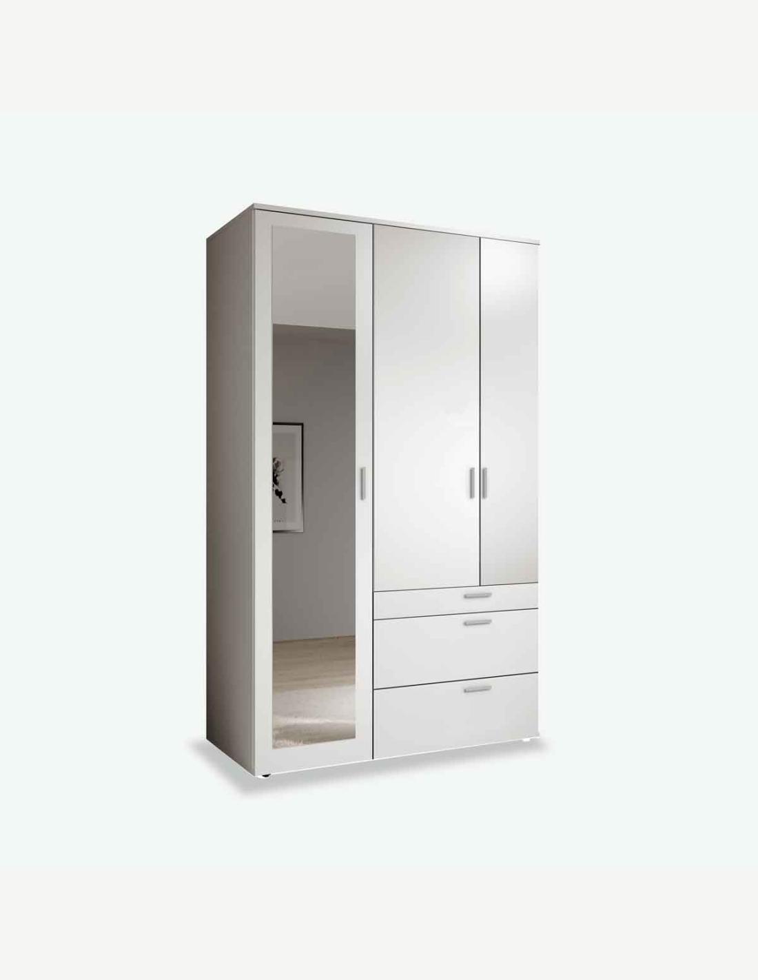Armadio a 3 ante battenti di qui una con specchio, 1 cassetto piccolo e 2 cassetti grandi , disponibile in 3 colori. Molto spazioso. Dimensioni: LAP ca. 135x195x56cm