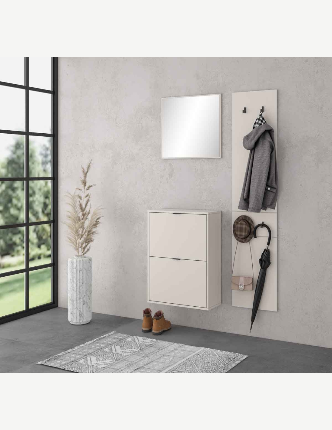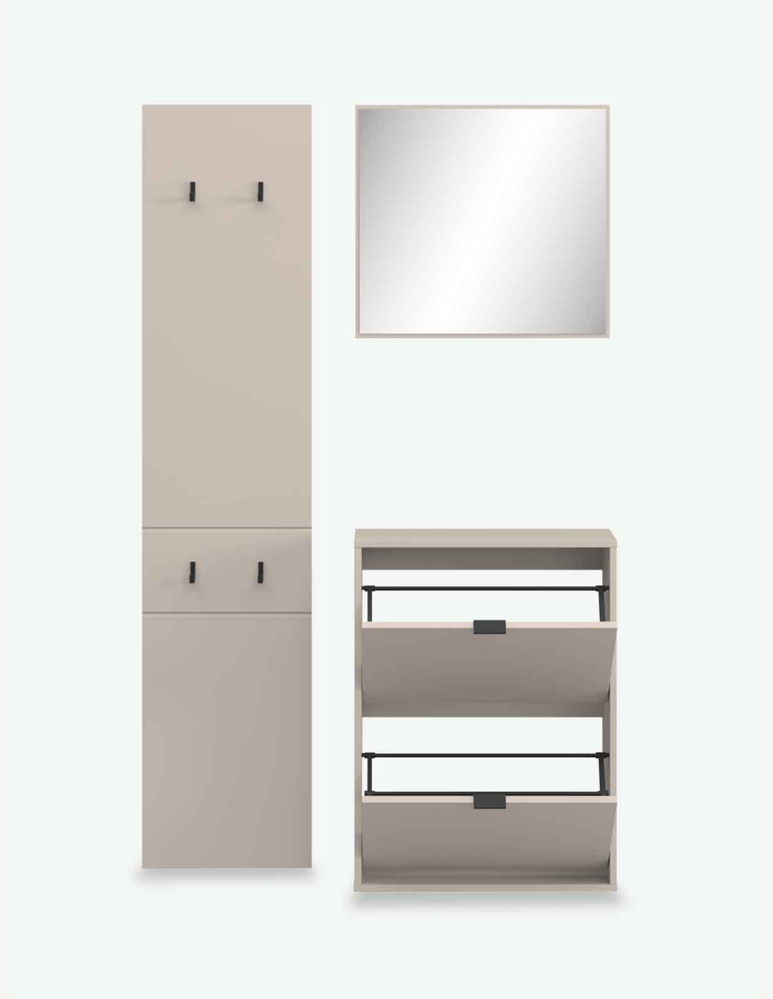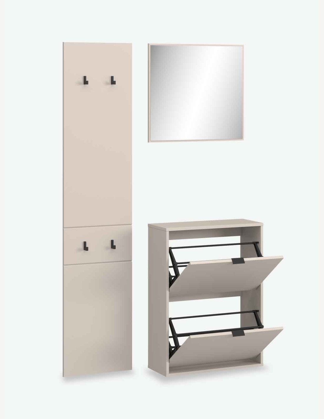 Mobile guardaroba in legno laminato nel colore cashmere, composto da scarpiera, pannello appendiabito e specchio. Dimensioni LAP ca. 105x180x27 cm.