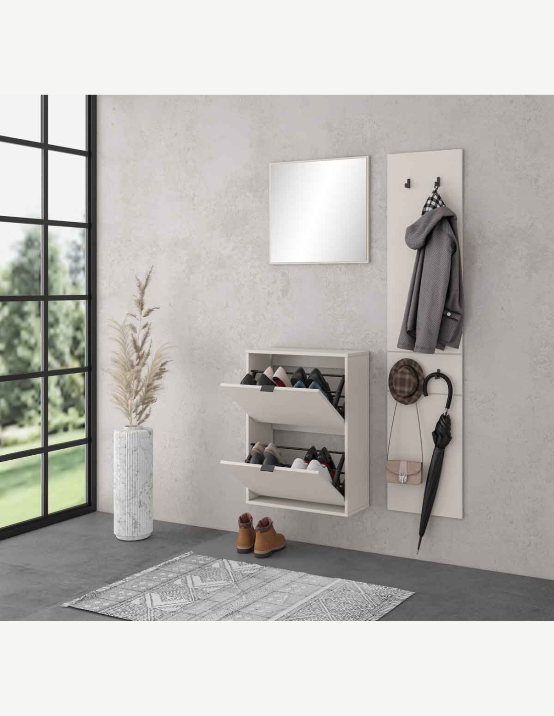 Guardaroba completo, robusto e resistente, perfetto per l'ingresso o per il corridoio della casa, offre spazio per le giacche, scarpe e ulteriori capo di abbigliamento. Questo guardaroba è composto da una scarpiera a 2 ante a ribalta, 1 pannello appendiabito con 4 ganci e 1 specchio. Grazie alle sue misure poco ingombranti, potrà essere posizionato in ogni angolo della casa.