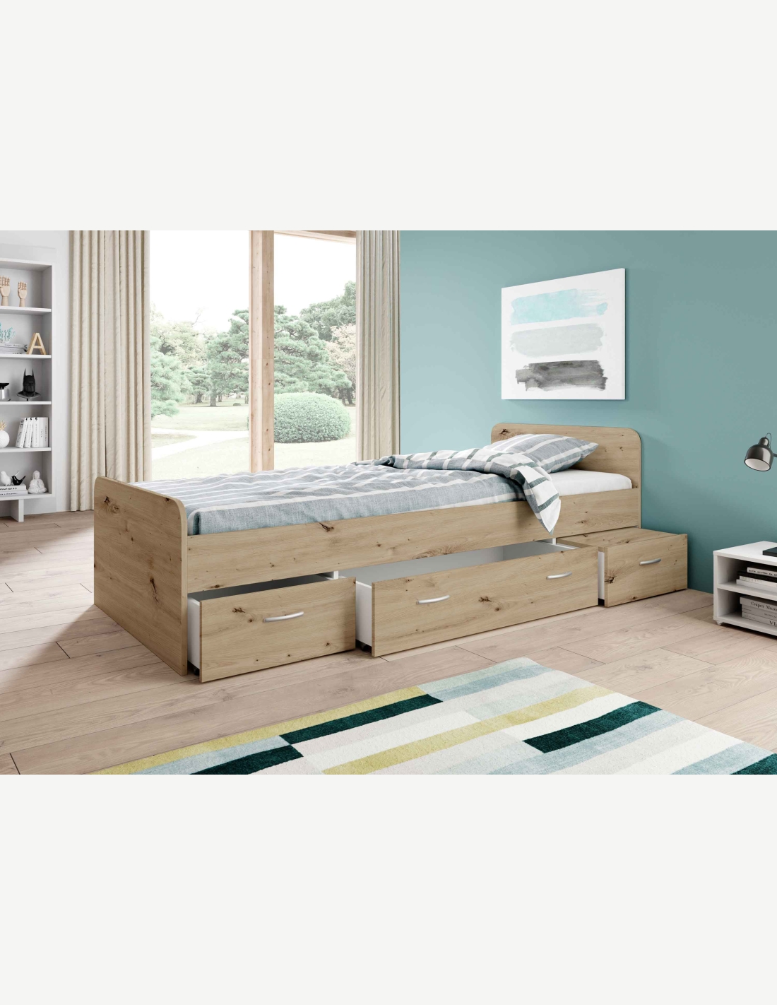 Letto singolo con 3 cassetti in legno laminato. Disponibile in laminato rovere sonoma, artisan o bianco. Dimensioni ca. LAP 204x65x95cm