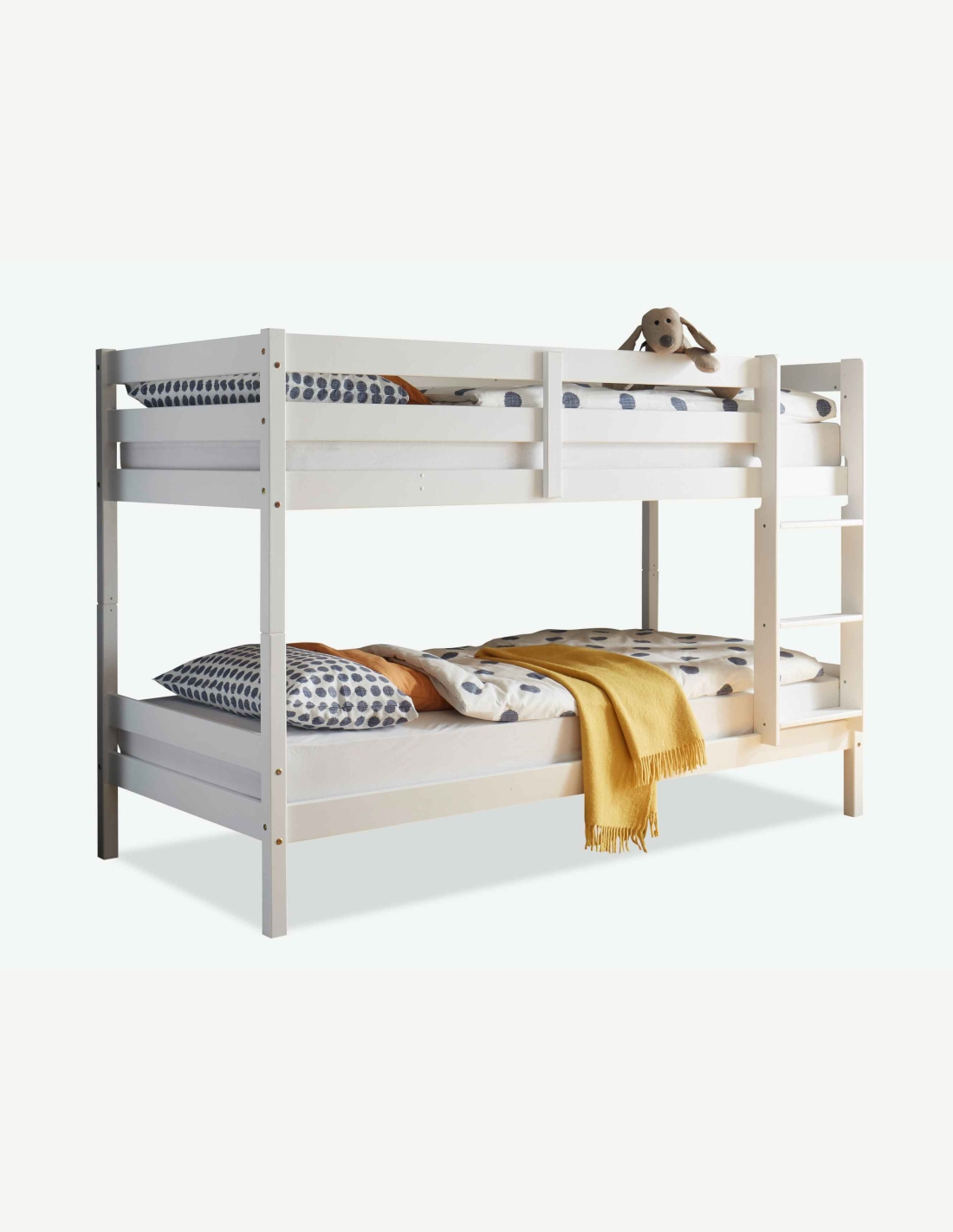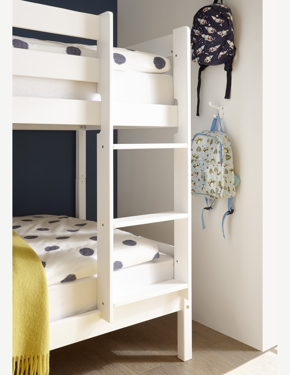 Letto a castello nel colore bianco in legno massicio di pino con scaletta. Dimensioni LAP 97x140x207 cm.