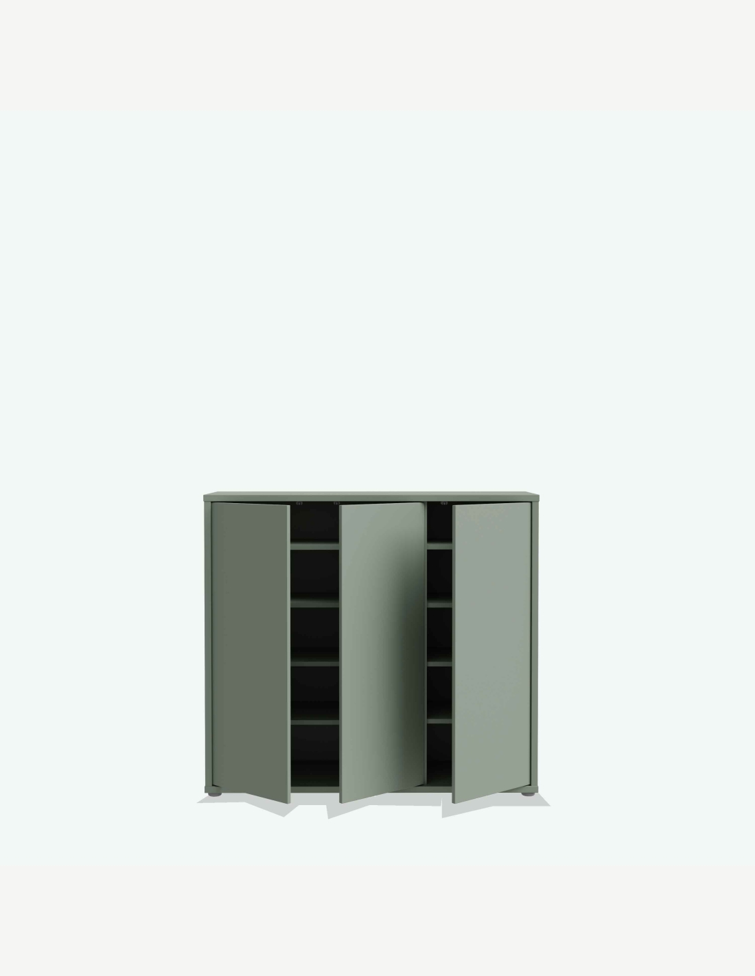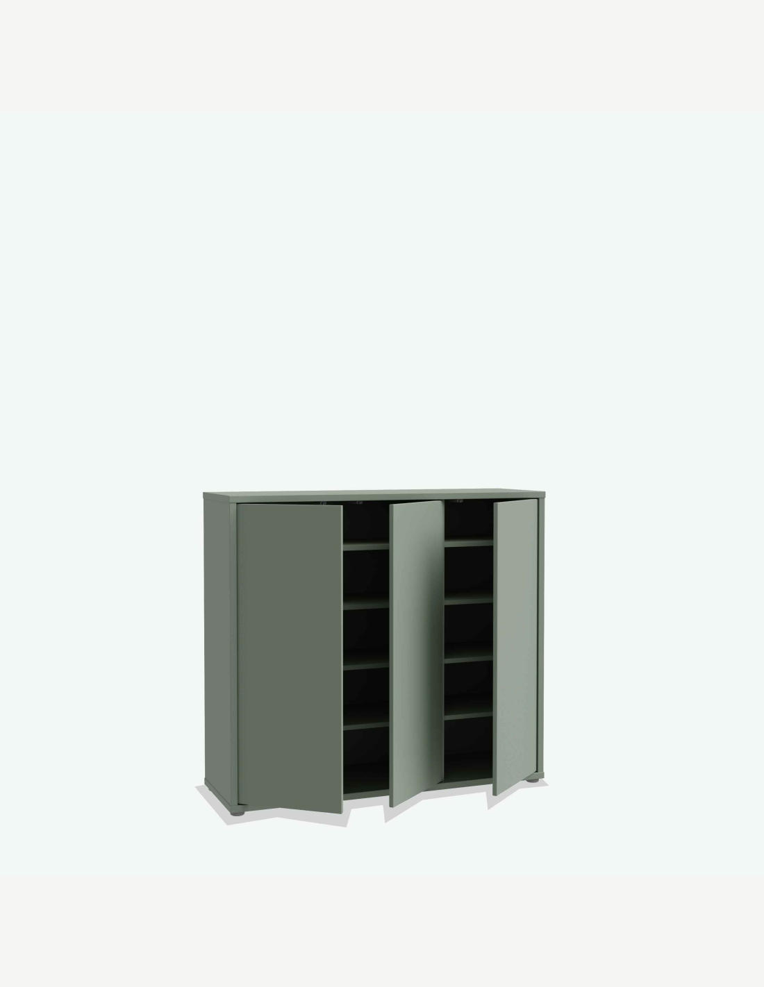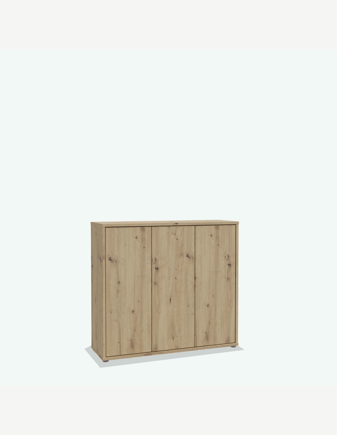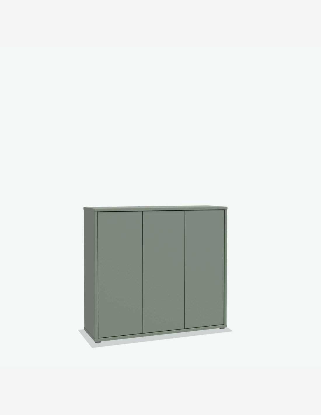 Comò in legno laminato in diversi colori con 3 ante a battenti e 6 ripiani. Dimensioni LAP ca. 109,2x99,1x34,9cm