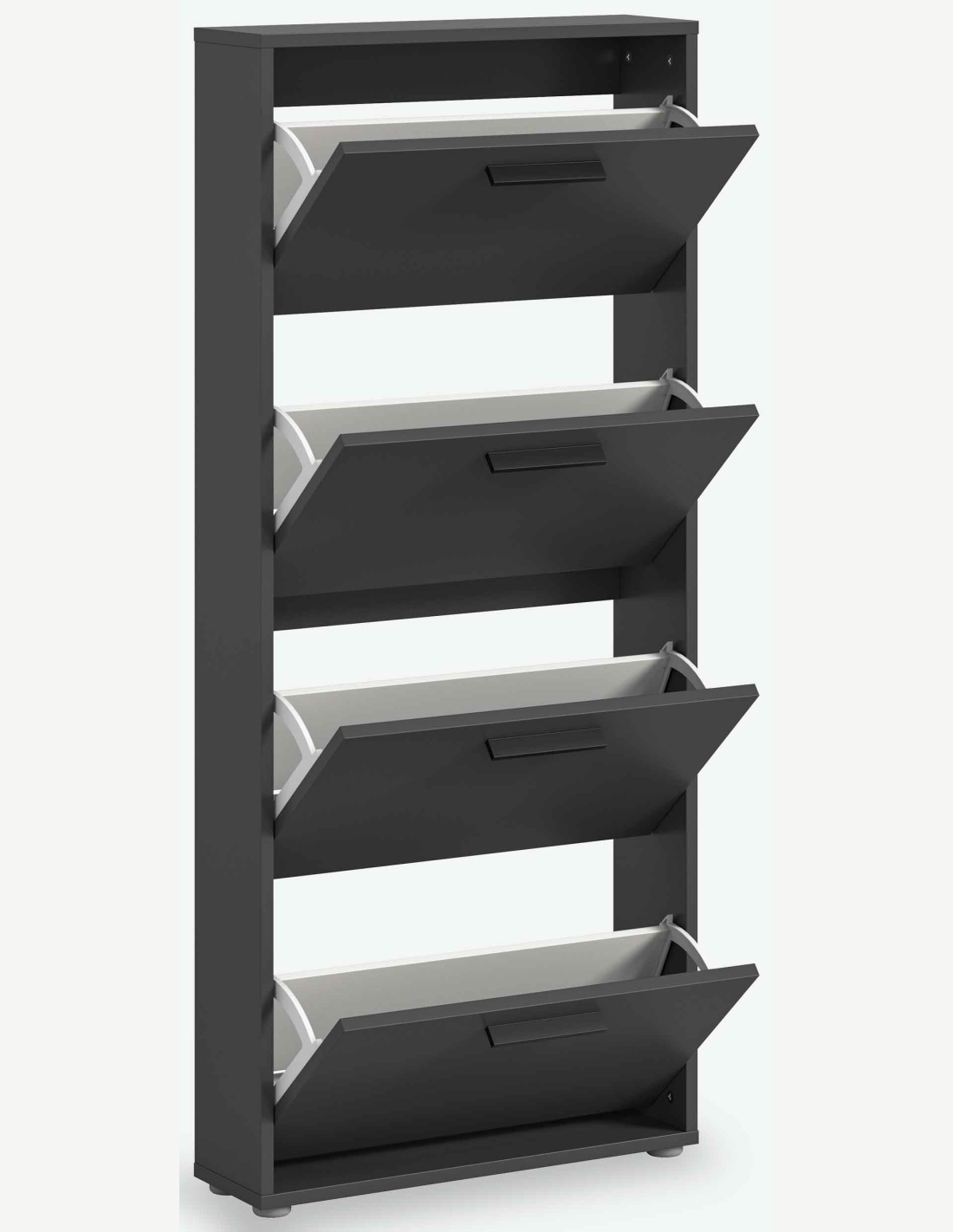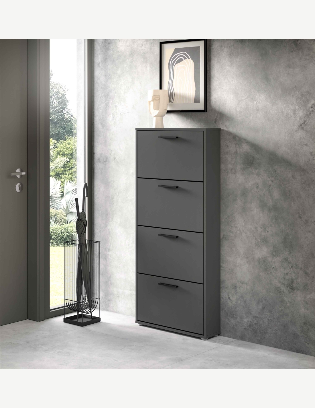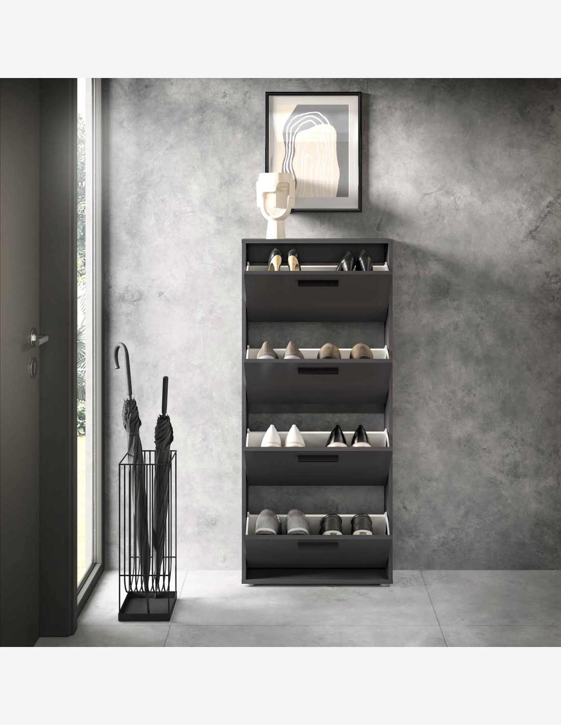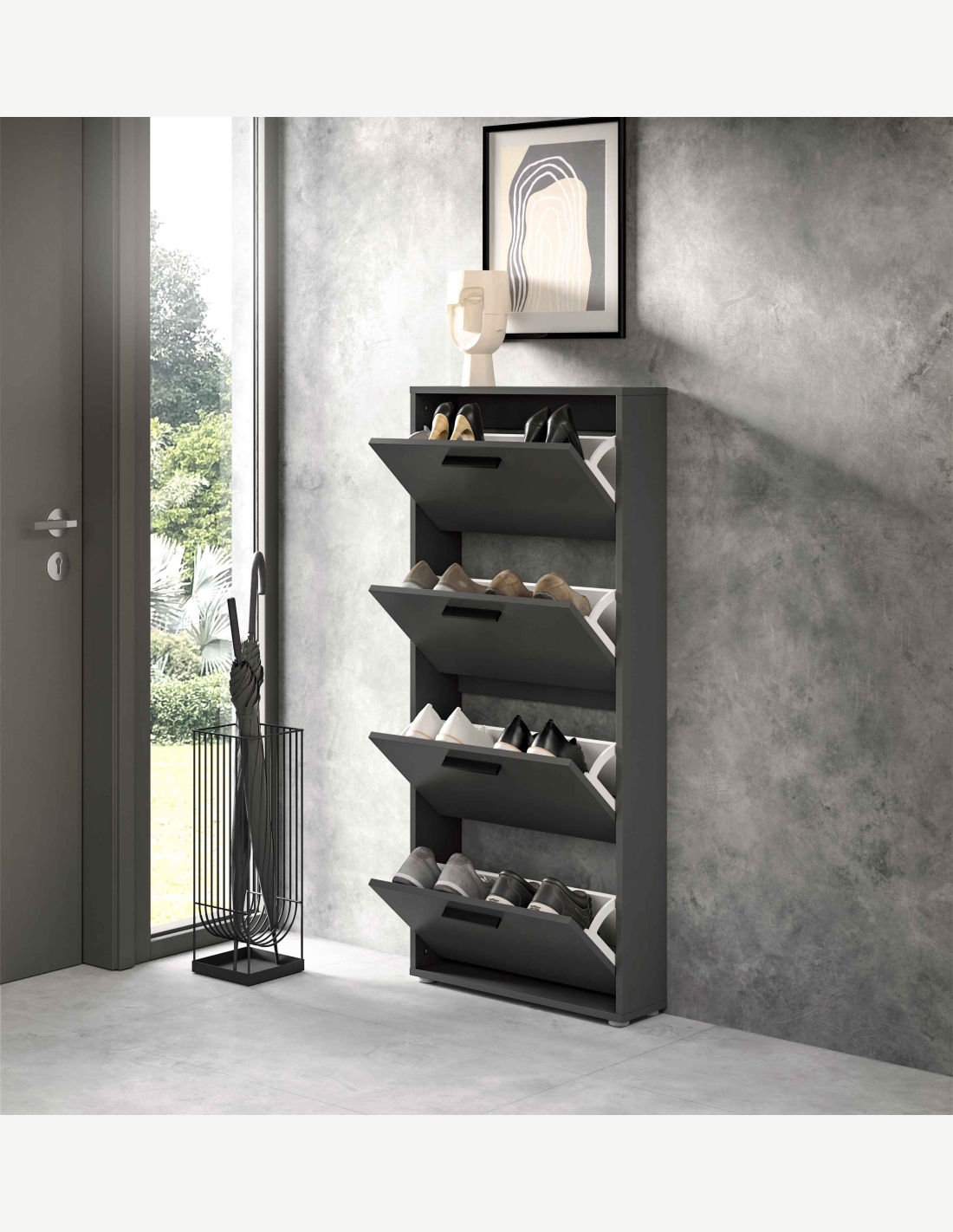 Scarpiera in legno laminato con 4 vani a ribalta. Disponibile in 3 colorazioni diversi. Dimensioni LAP ca. 59x136x17 cm