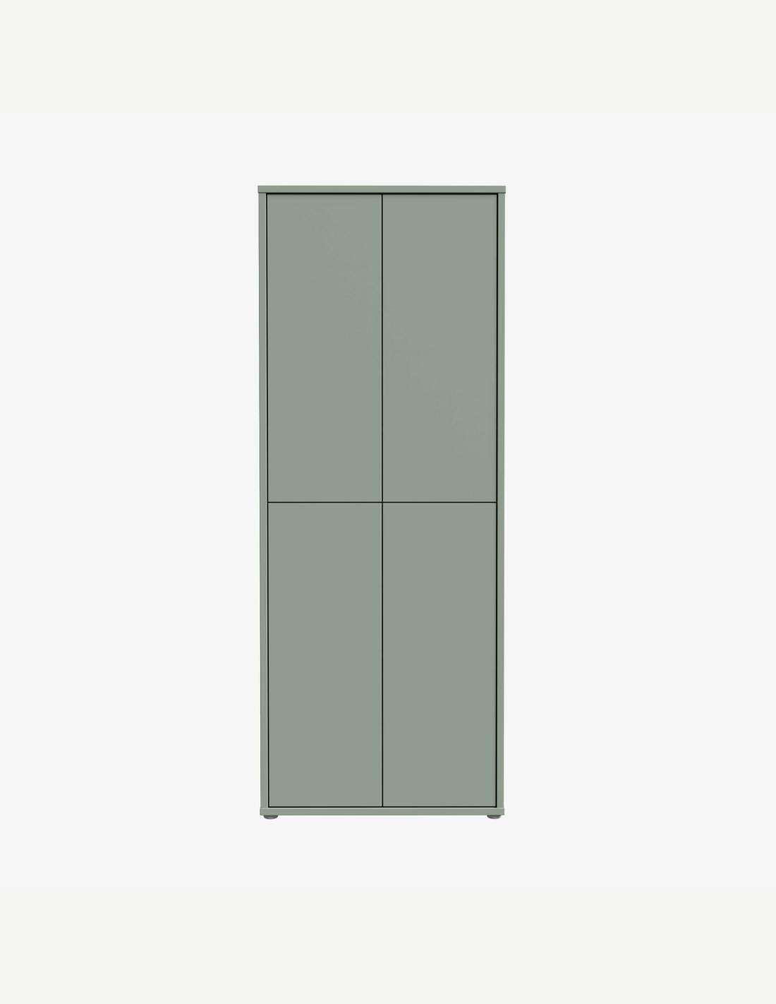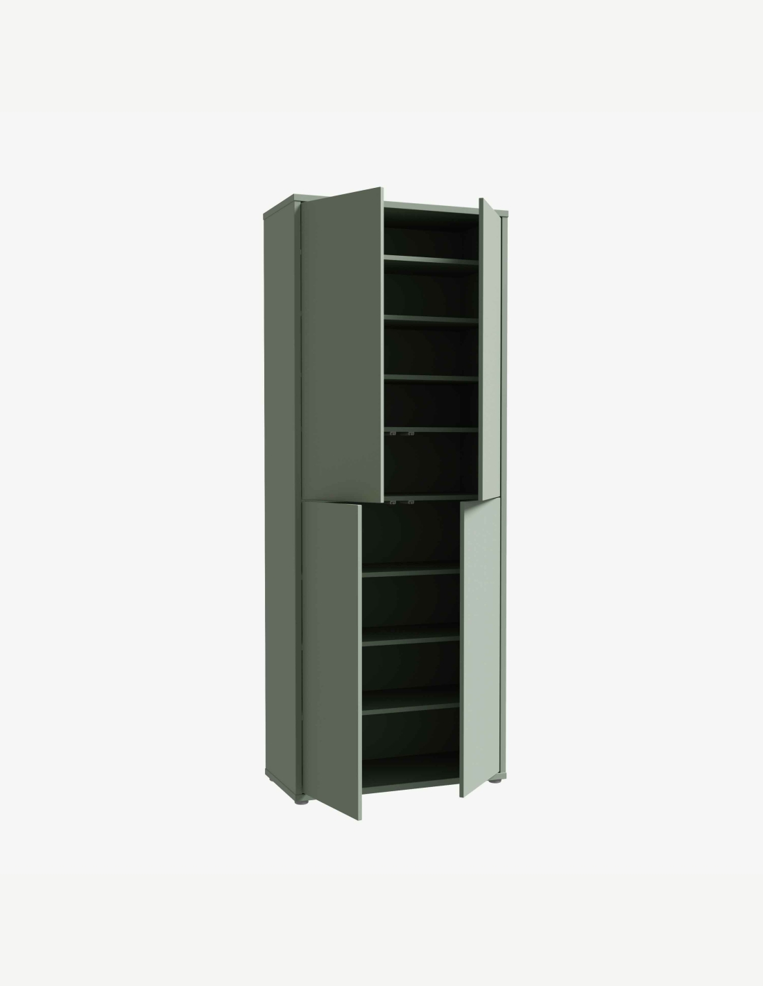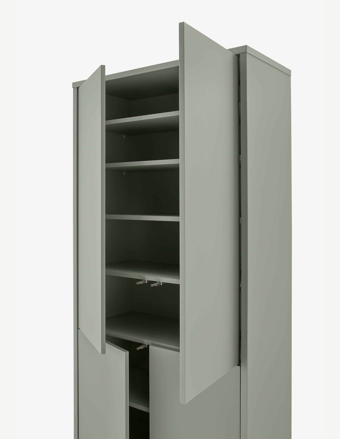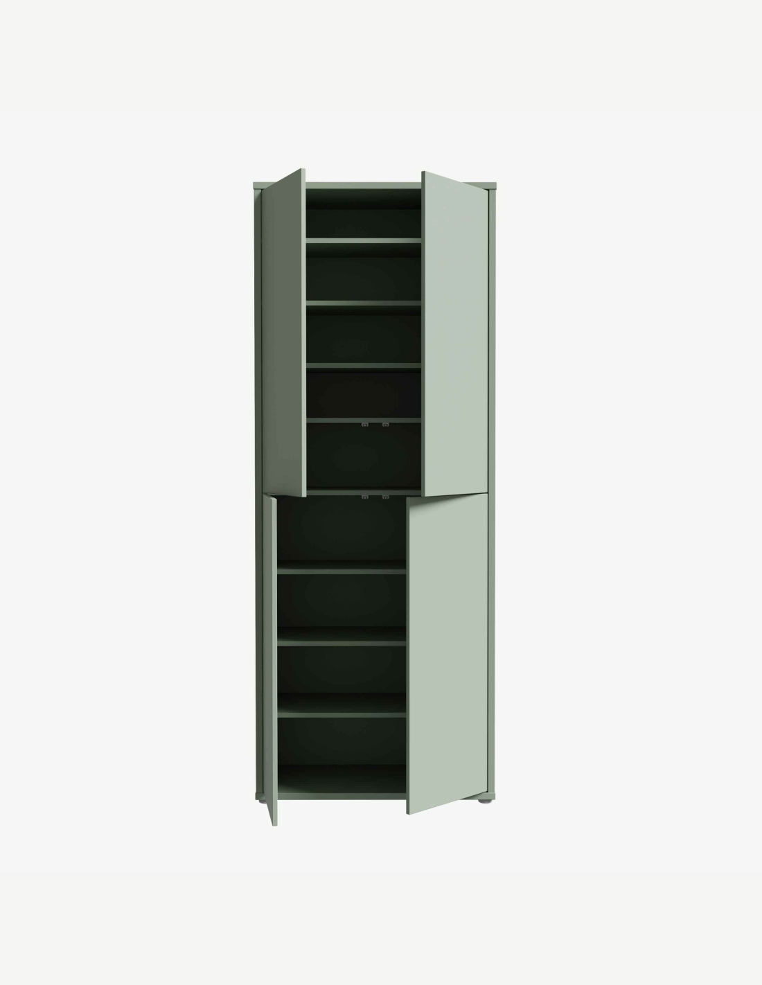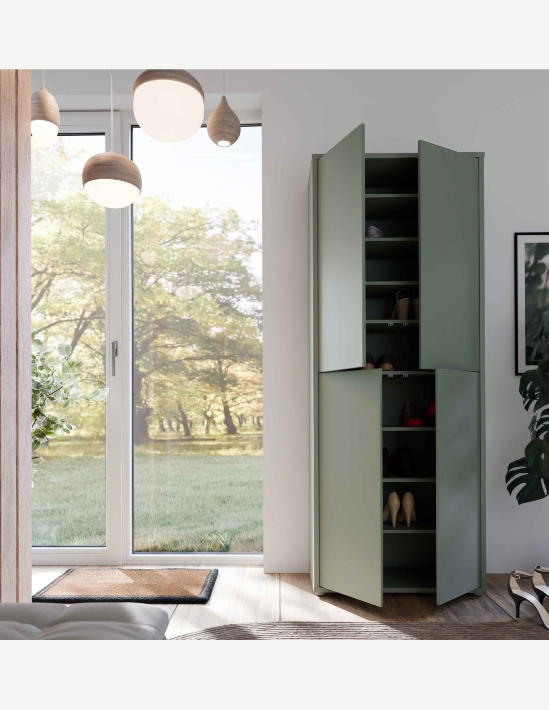 Scarpiera in legno laminato nel colore grigio-verde con 4 ante a battente e 8 ripiani. Dimensioni LAP ca. 74,3x192x34,8 cm