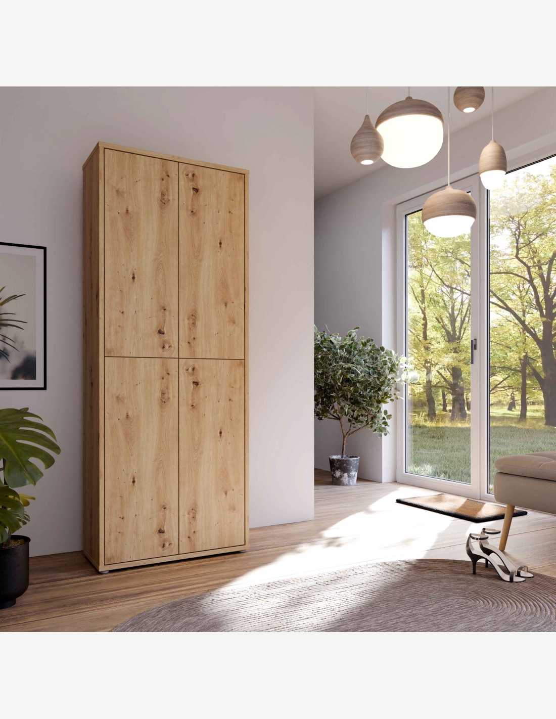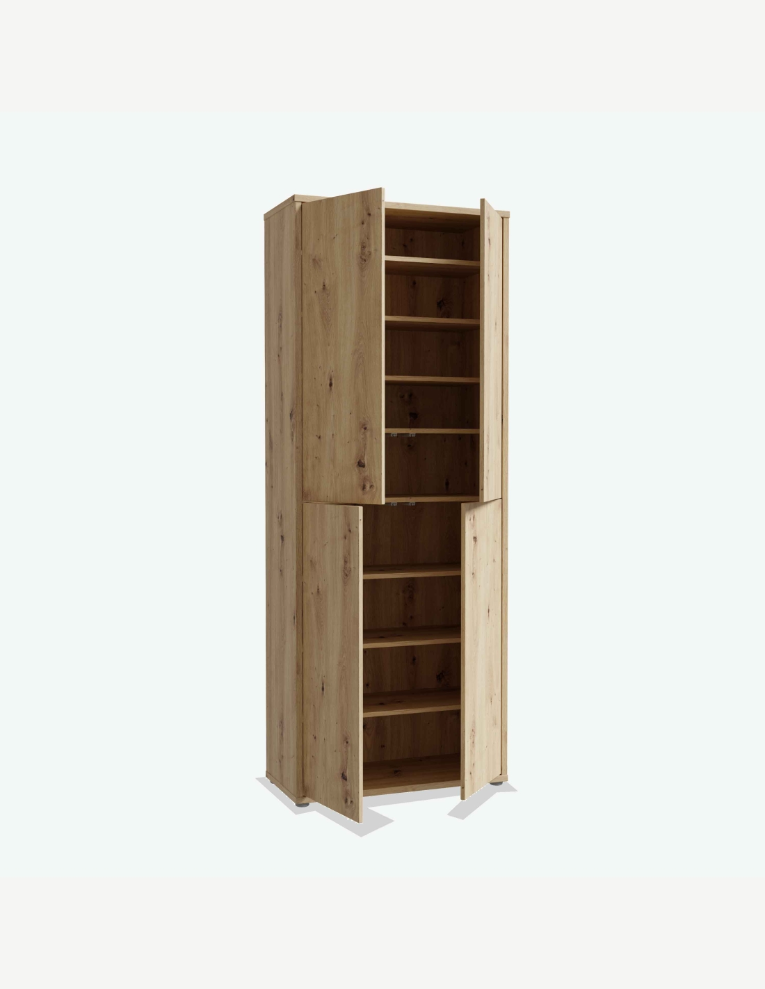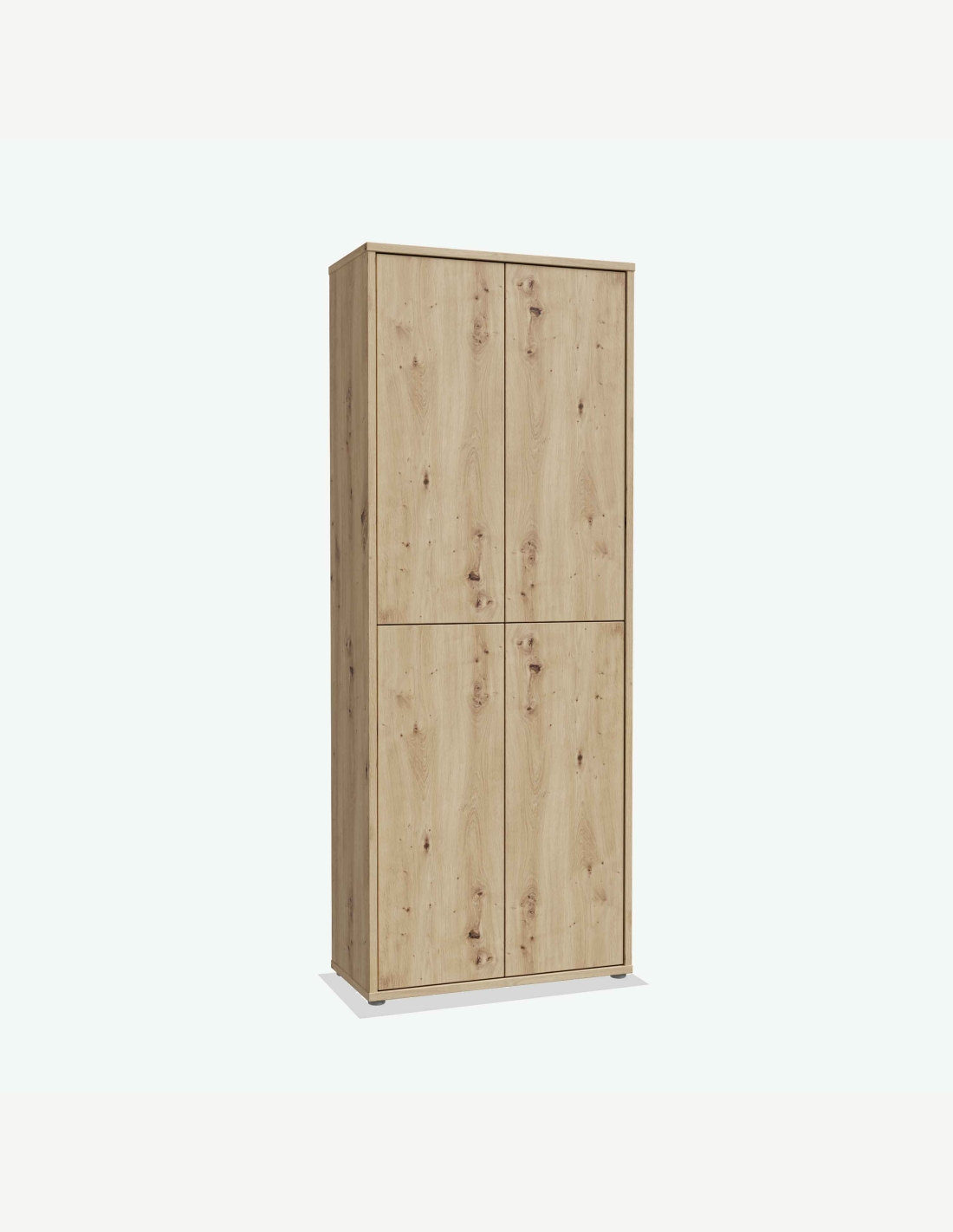 Scarpiera in legno laminato con 4 ante a battente e 8 ripiani, disponibile in diversi colori. Dimensioni LAP ca. 74,3x192x34,8 cm