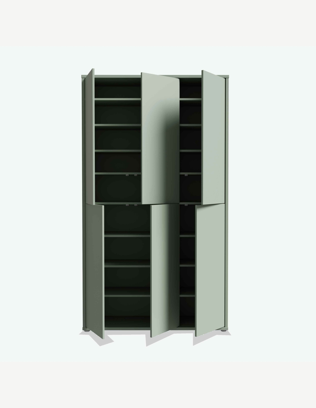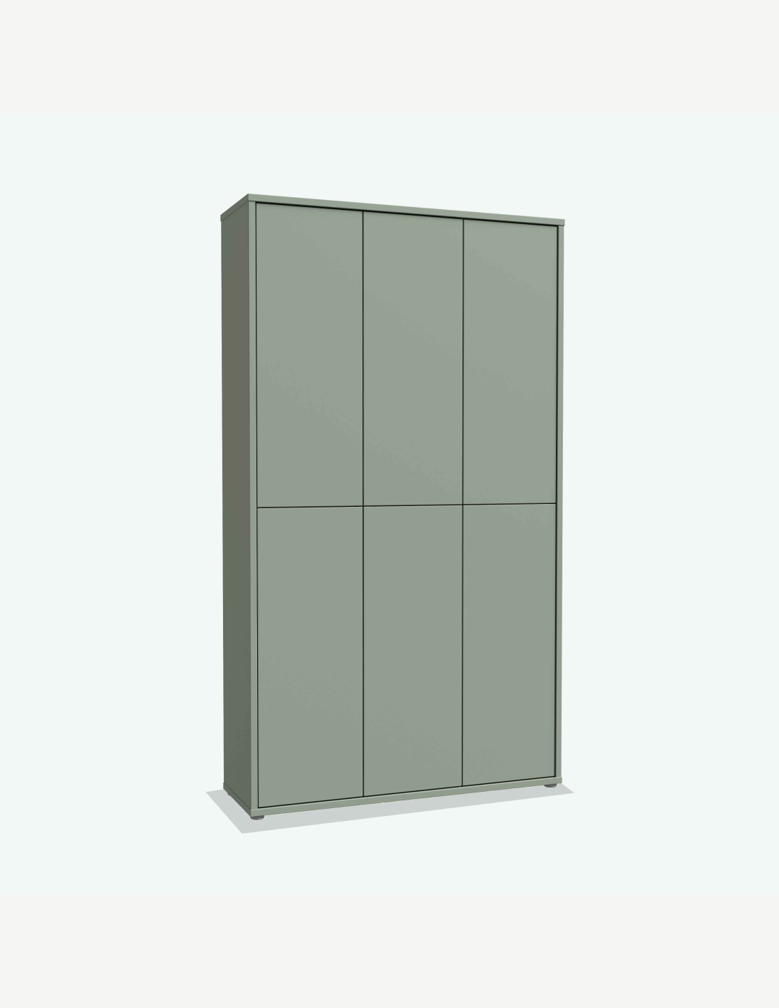 Scarpiera in legno laminato in diversi colori, con 6 ante a battenti e 8 ripiani. Dimensioni LAP ca. 109x192x34,8 cm