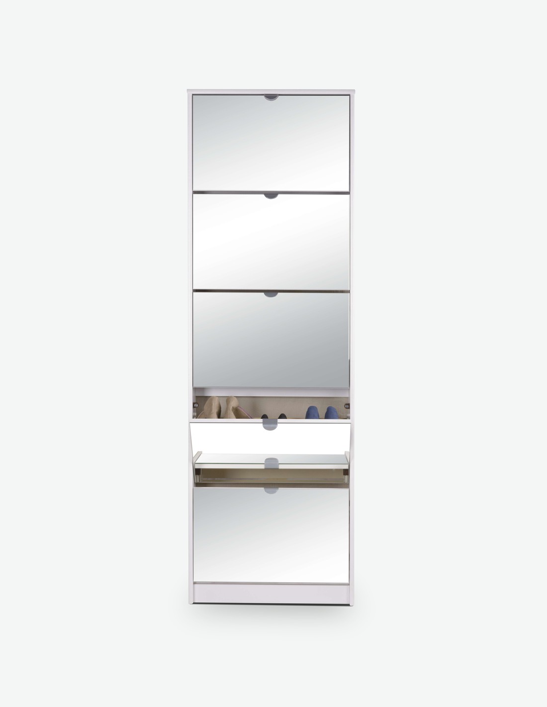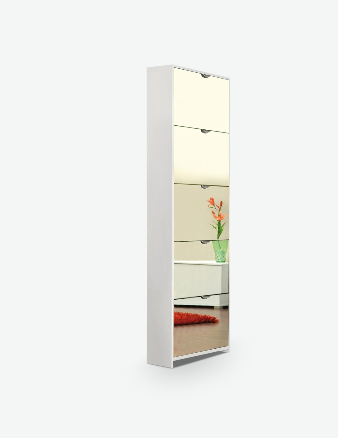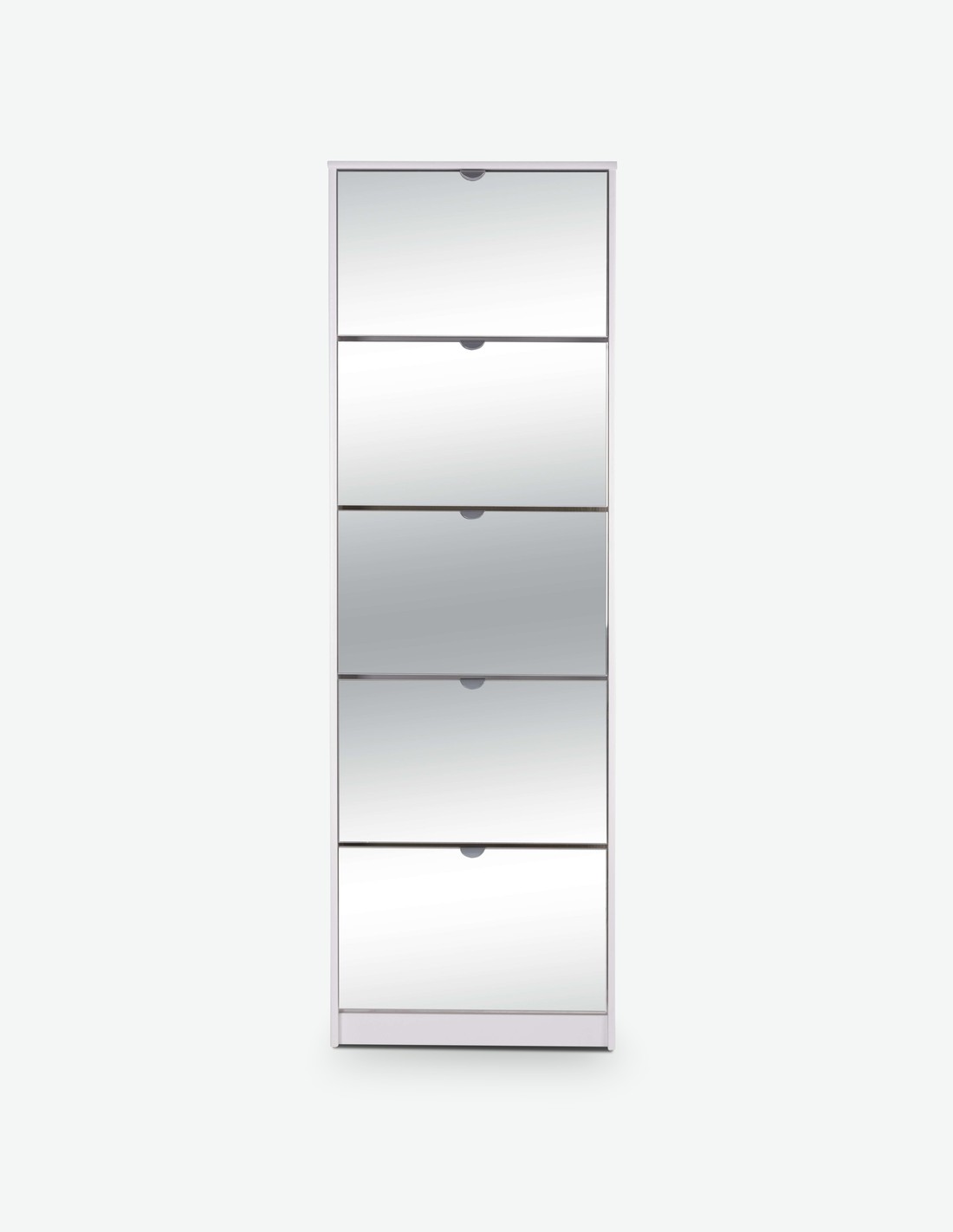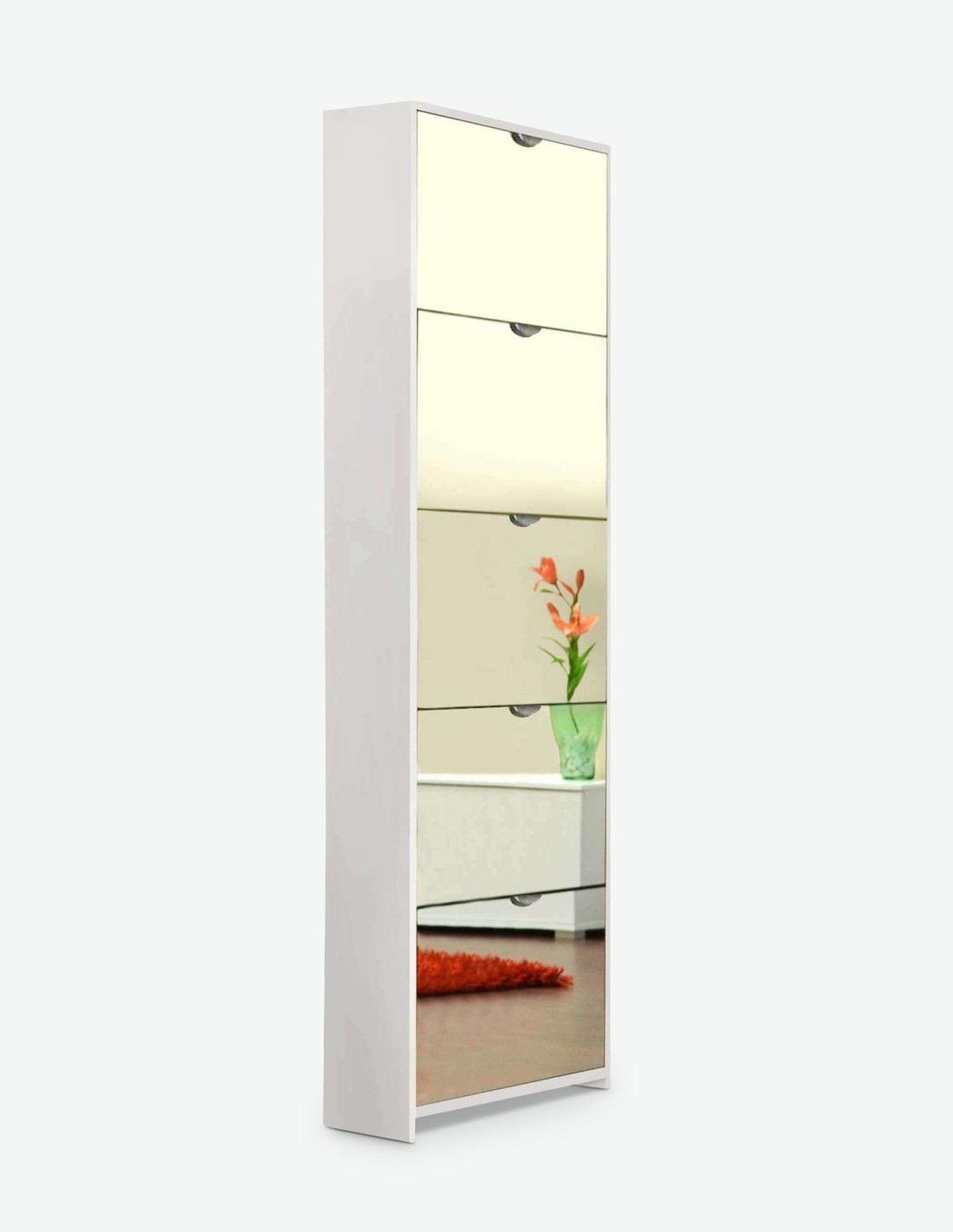 Scarpiera robusta e resistente con fronte in specchio, perfetta per l'ingresso o per il corridoio della tua abitazione. Con i suoi 5 ripiani interni offre abbastanza spazio per tenere in ordine tutte le tue scarpe. Grazie alle misure poco ingombranti, potrá essere posizionata in ogni angolo della tua casa.