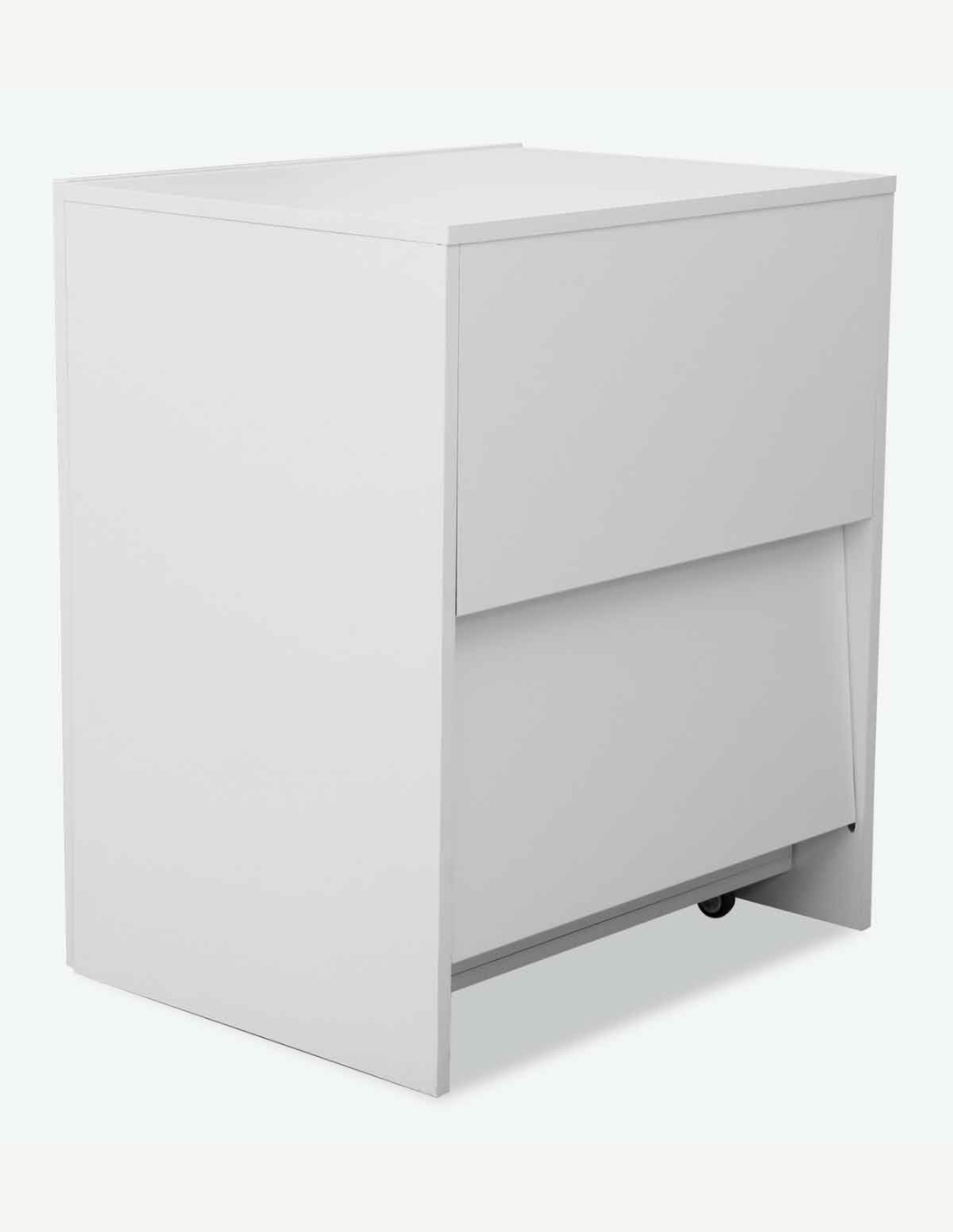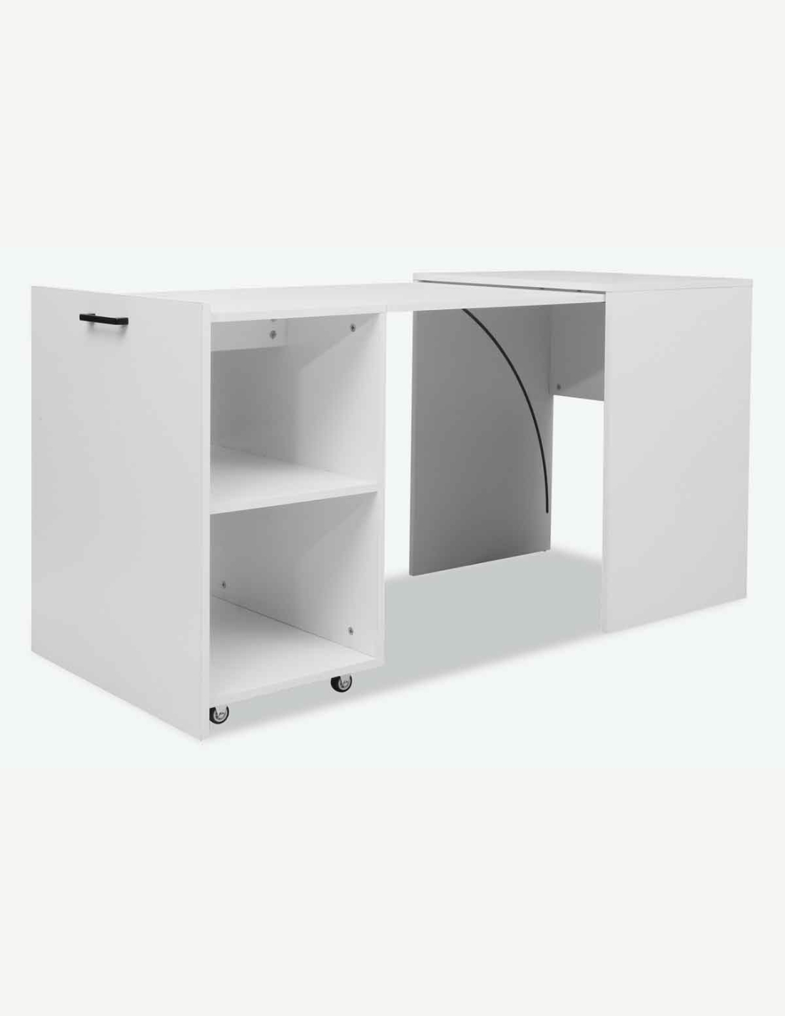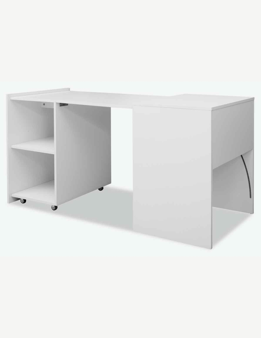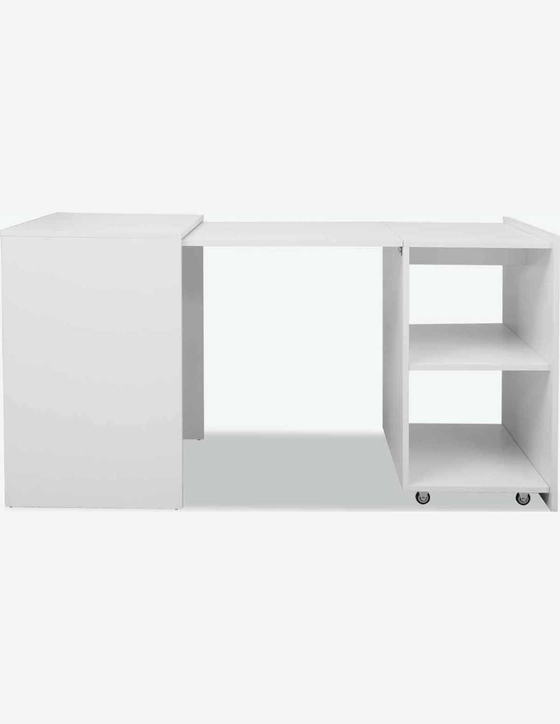 Scrivania con 2 ripiani aperti, in legno laminato di colore bianco. Scrivania con piano da lavoro a scomparsa, così diventa un cubo salvaspazio. Dimensioni LAP ca. 140x72x60 cm.