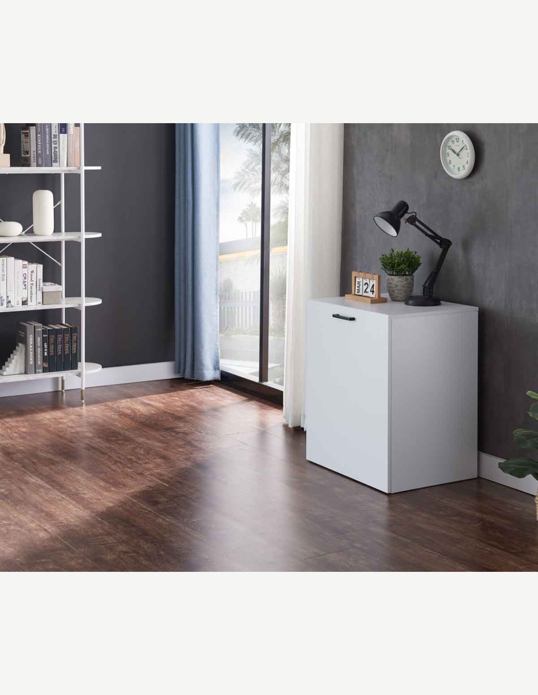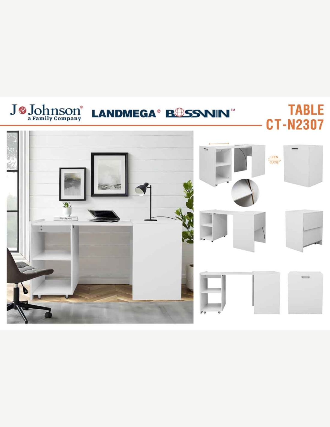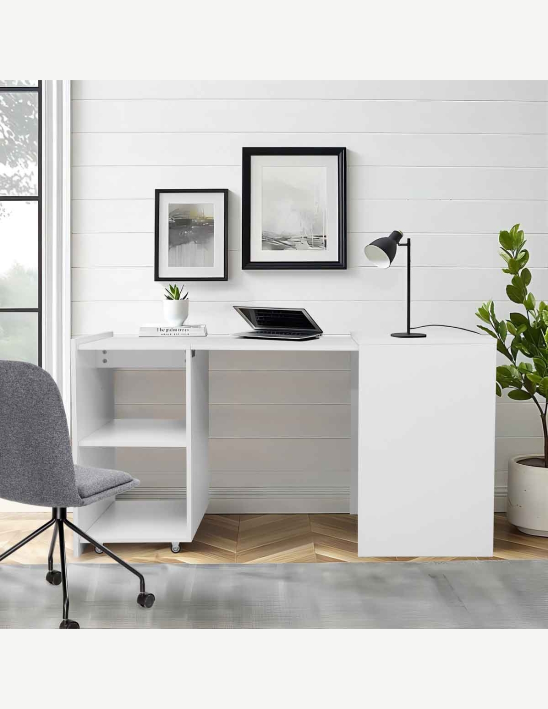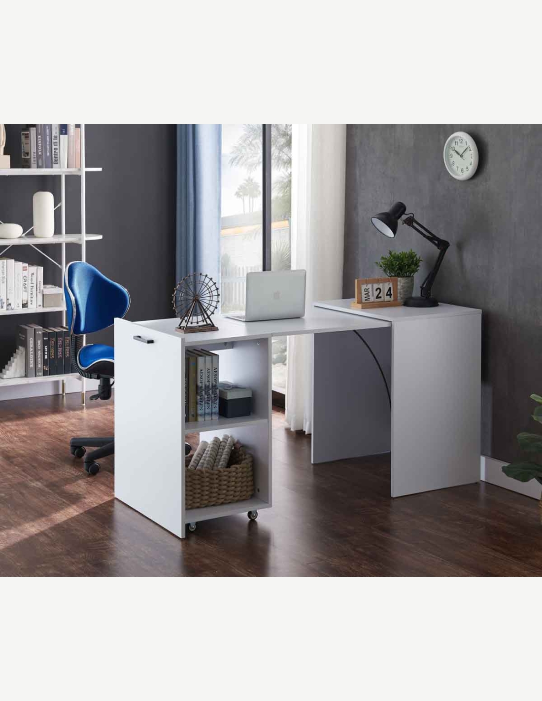 Scrivania con 2 ripiani aperti, in legno laminato di colore bianco. Scrivania con piano da lavoro a scomparsa, così diventa un cubo salvaspazio. Dimensioni LAP ca. 140x72x60 cm.