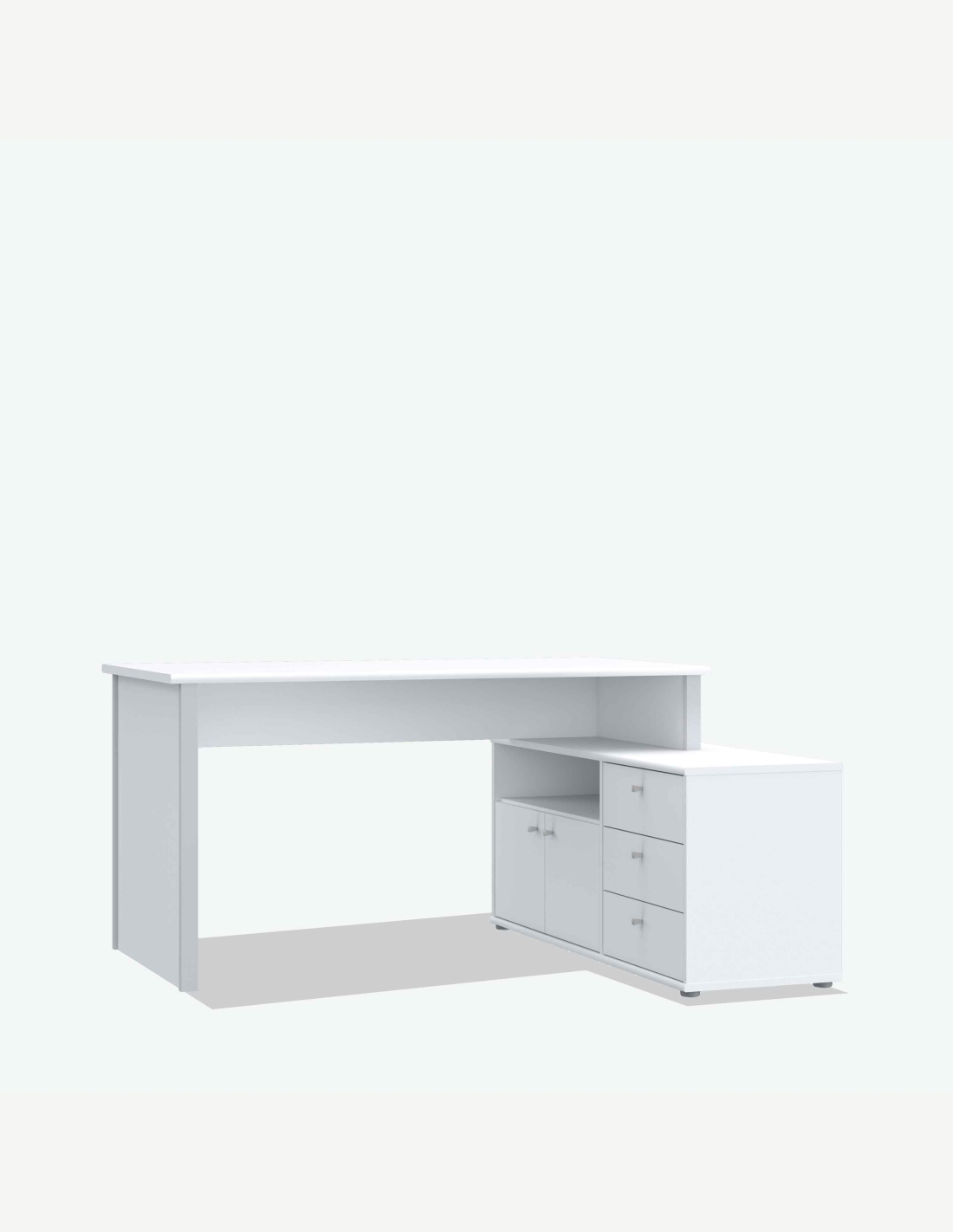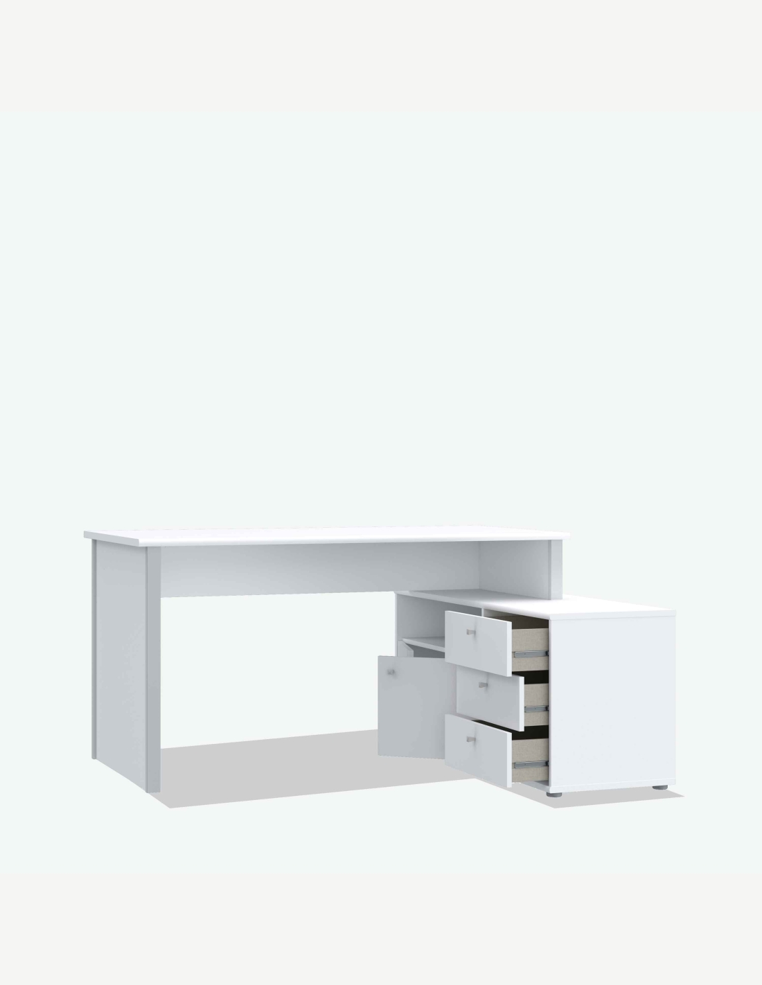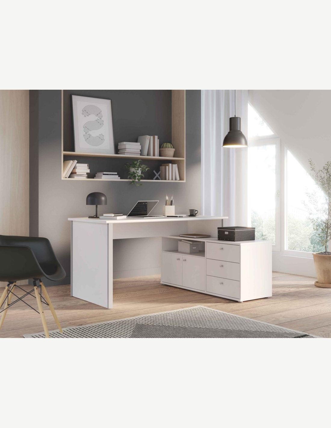Scrivania ad angolo in legno laminato con 3 cassetti, 2 porte a battente e 1 vano aperti in bianco oppure artisan oak . Dimensioni LAP 120,6x74,9x151,4cm