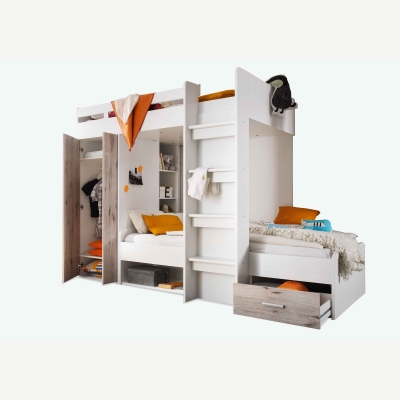 Letto a castello in legno laminato con armadio integrato, 1 cassetto e 4 vani aperti,...